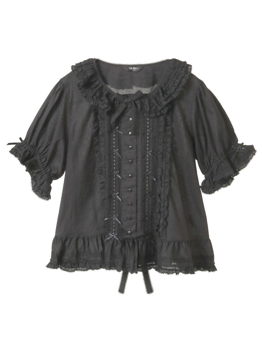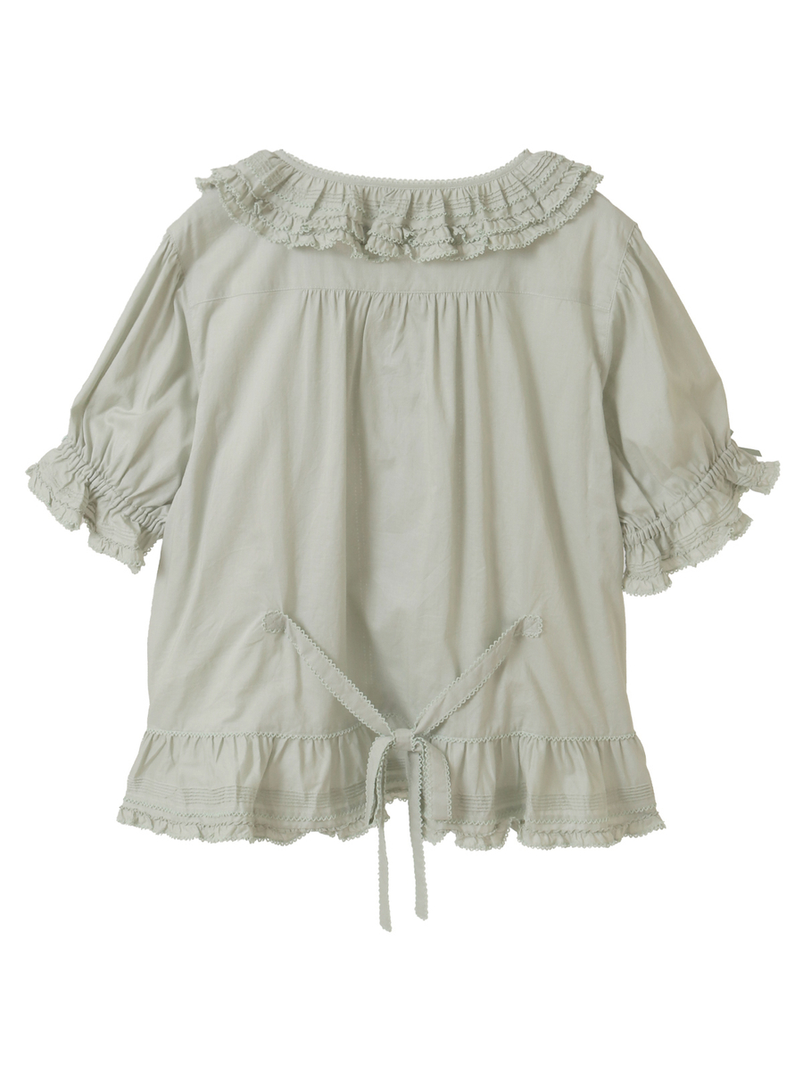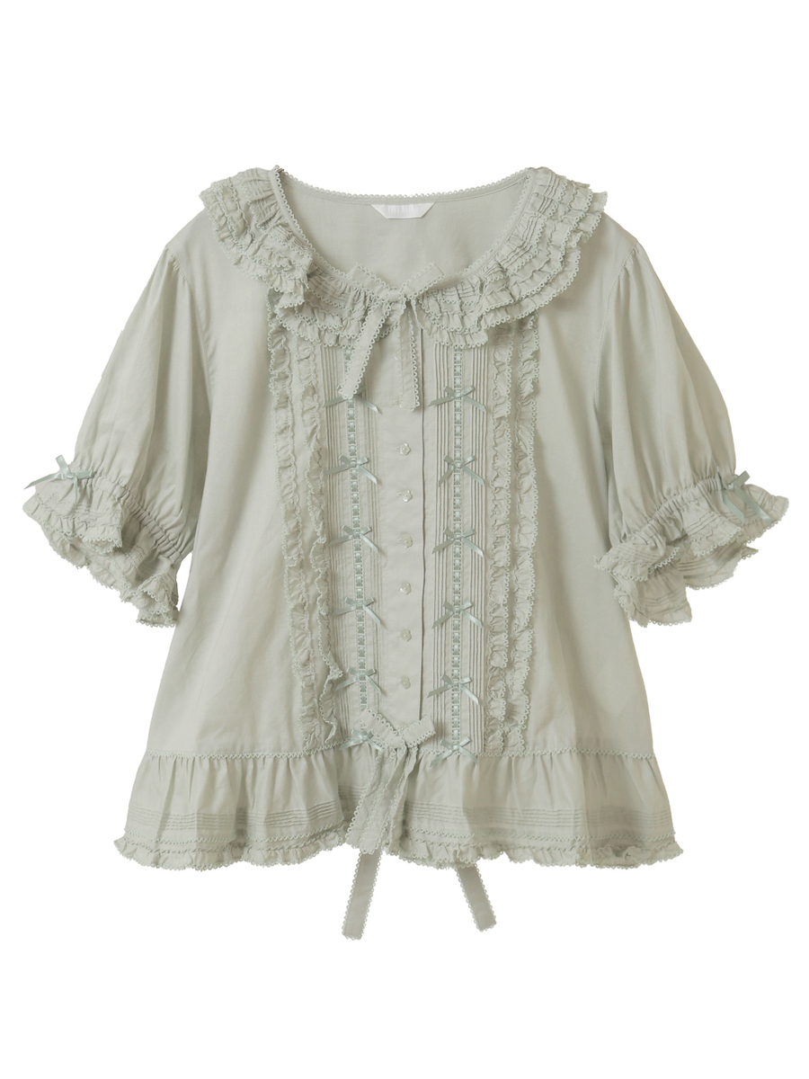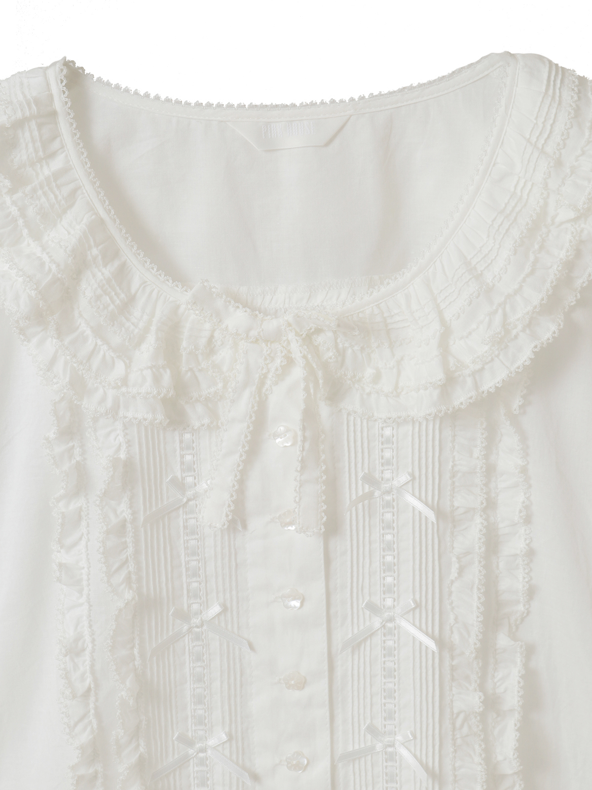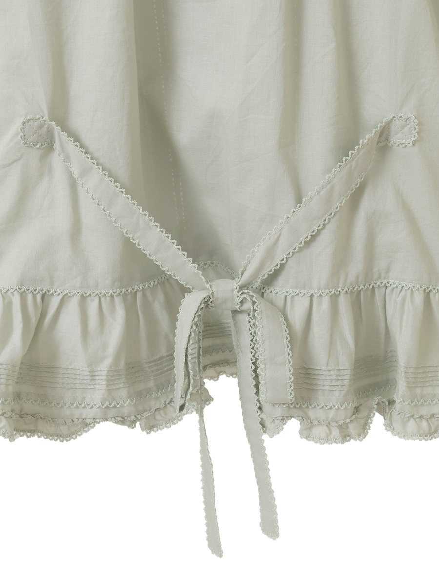 ピコフリルにピンタック、はしごレースにサテンリボン、さらにはリボンモチーフといったキュートで繊細なデティールをあしらった綿ローンのブラウス。