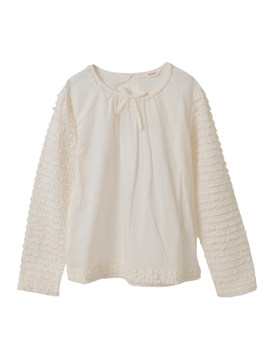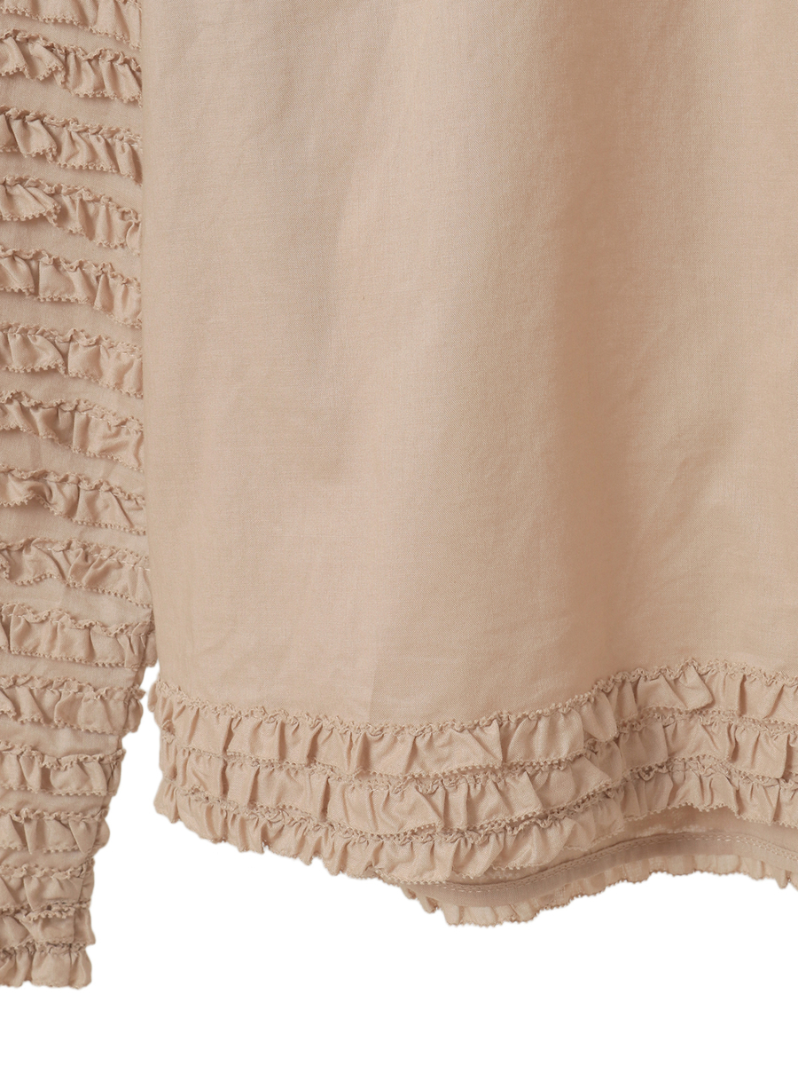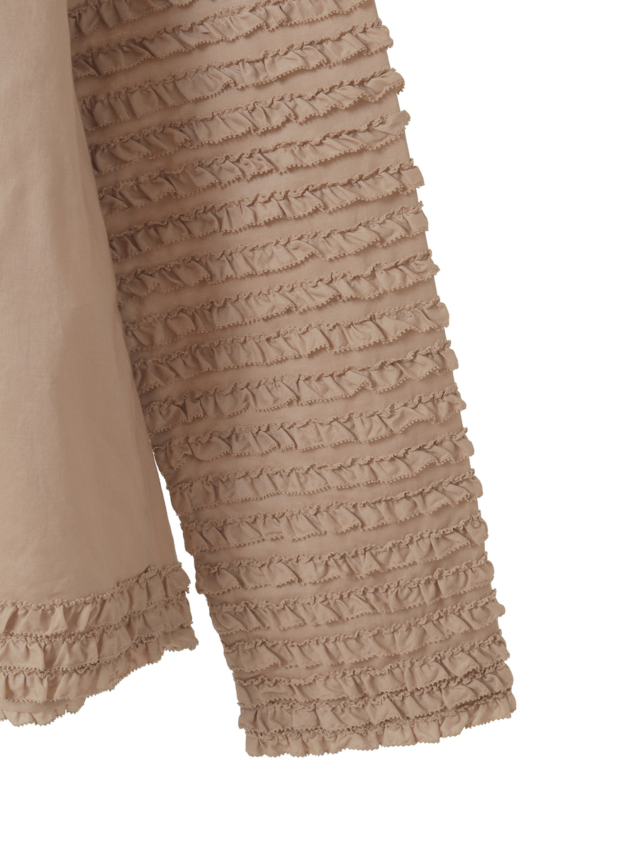 これから秋にかけて重宝しそうな袖フリル使いの綿ローンのブラウス。