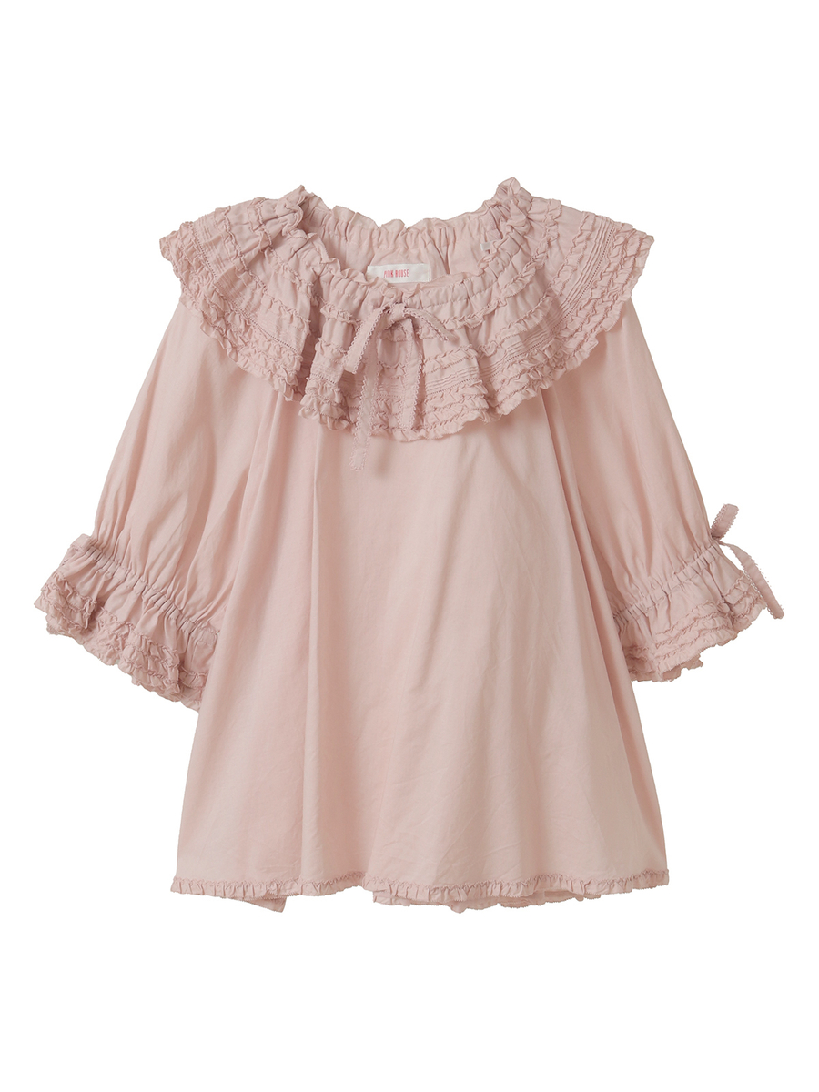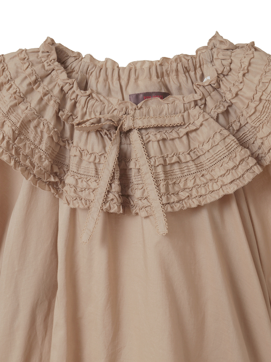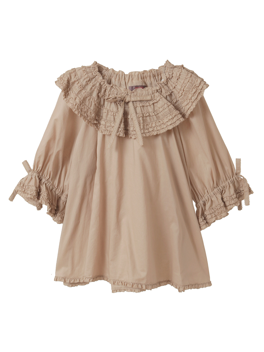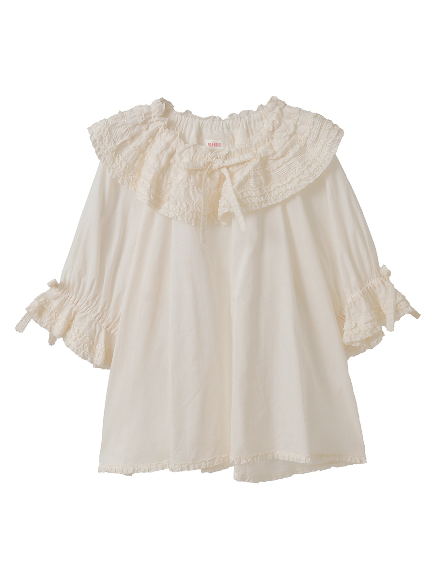 広がるパラソルをイメージした、フリル感たっぷりの大きめの襟がポイントの綿ローンのブラウス。