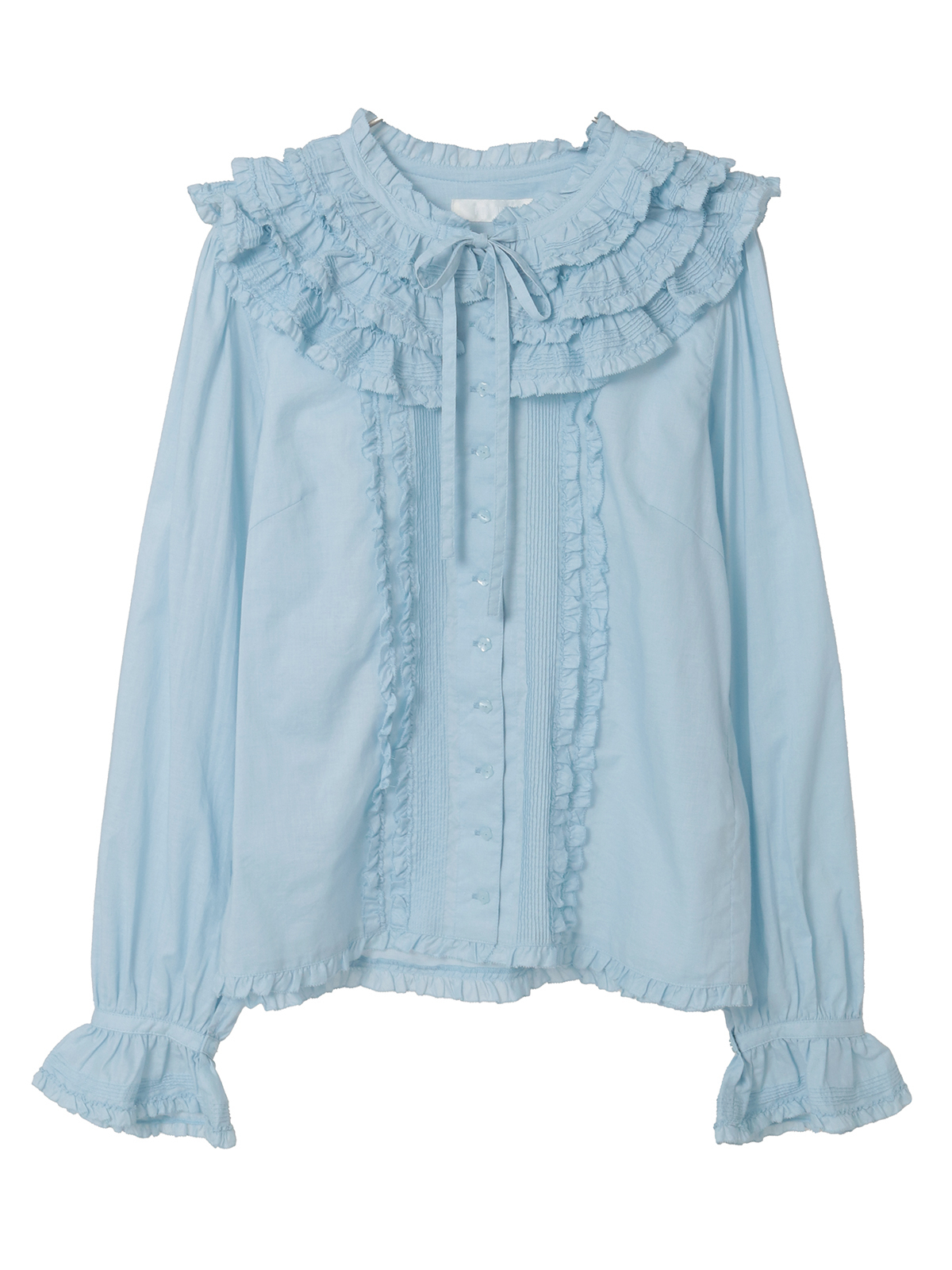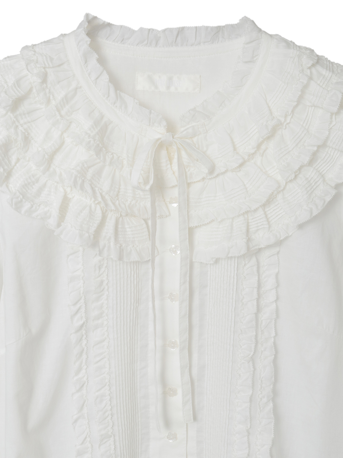ピンタックをあしらったフリルを重ね合わせた華やかな襟の付いた綿ローンのブラウス。