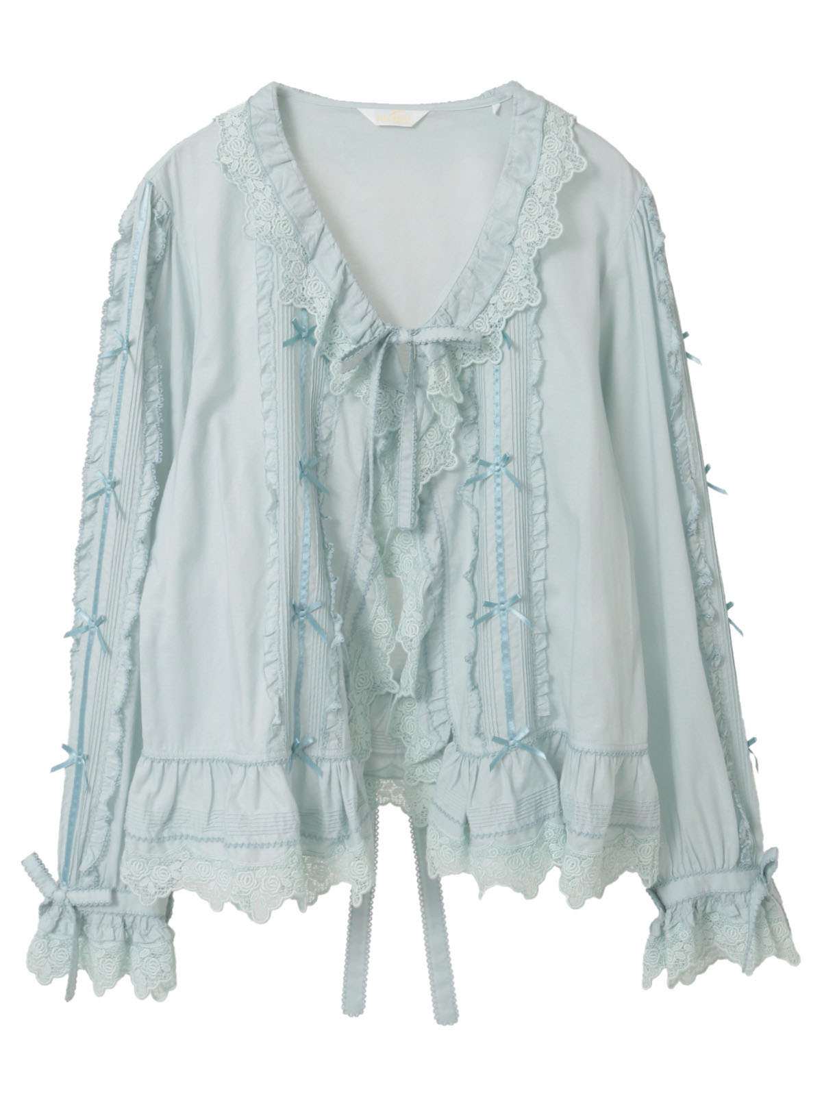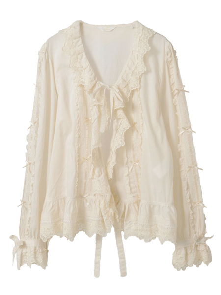 前たて部分の螺旋を描くフリルがとても華やかなオーバーブラウスタイプ。フリル部分にはケミカルレースを使っているので上品で気品高い仕上がりに。