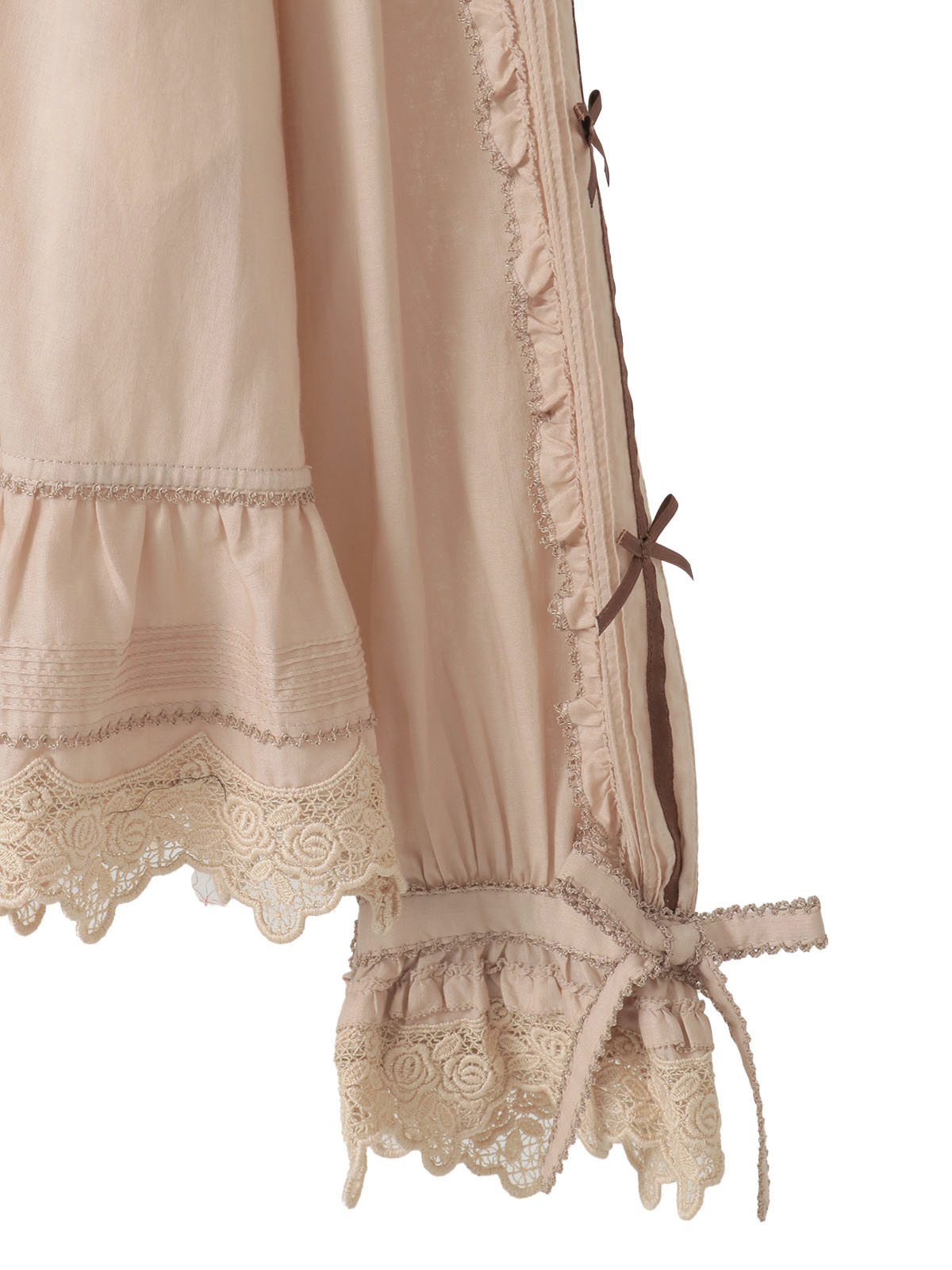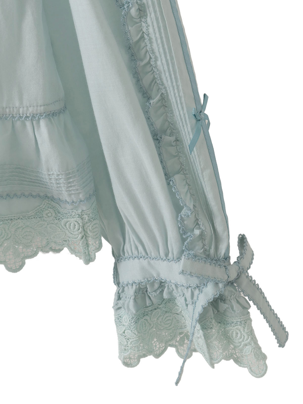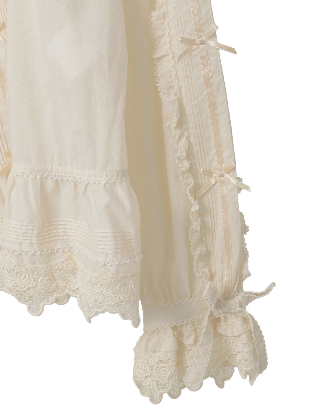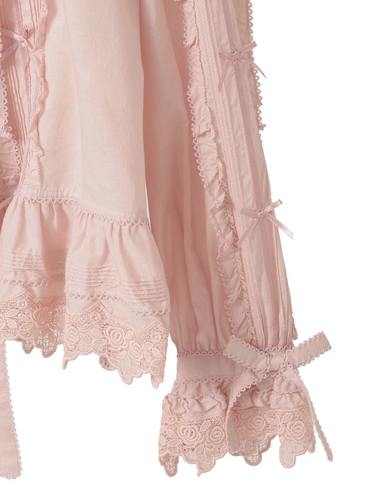フロントや袖まわりにもフリルにピンタック、サテンリボンにハシゴレースをふんだんにあしらえて豪華でとても華やかな仕上がりに。