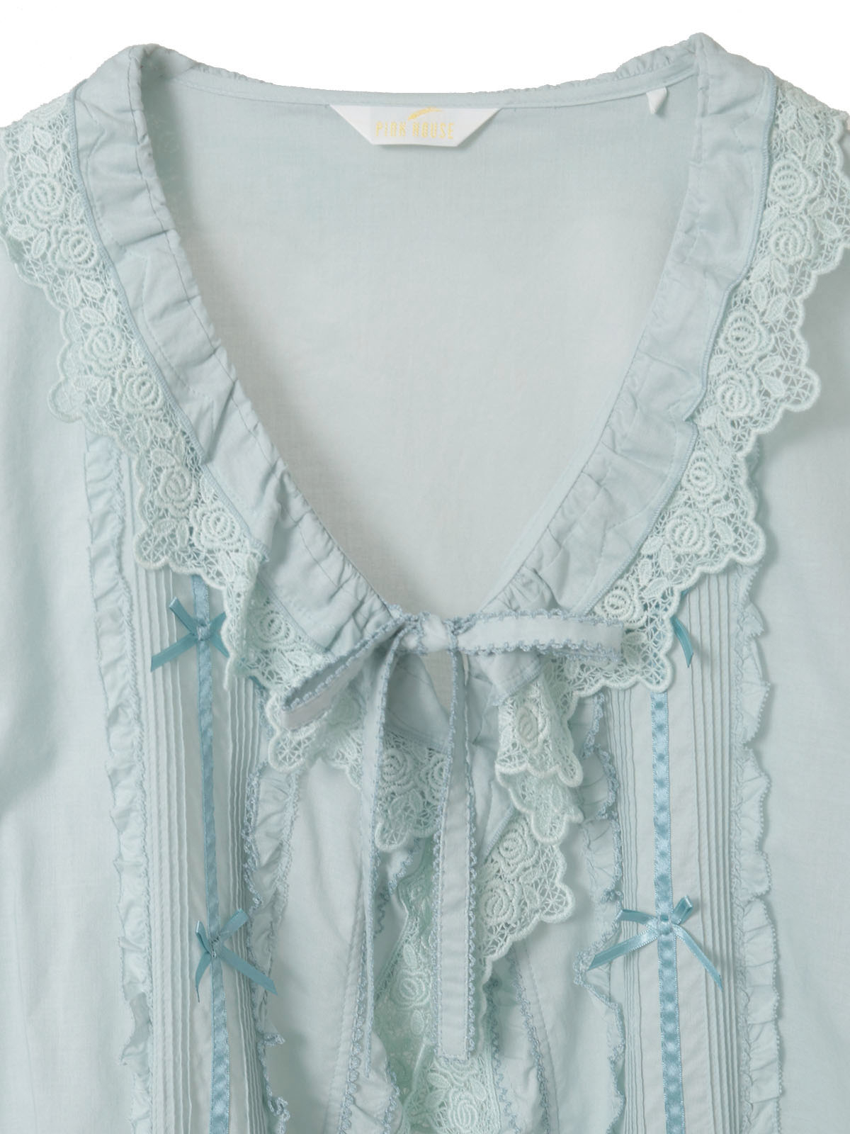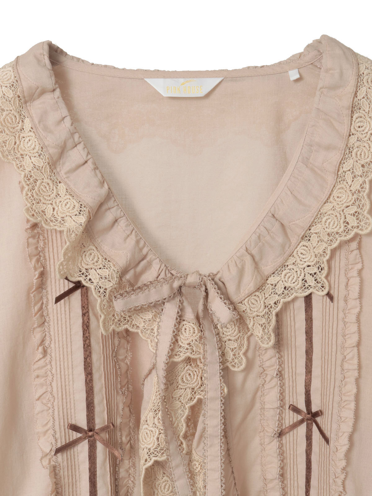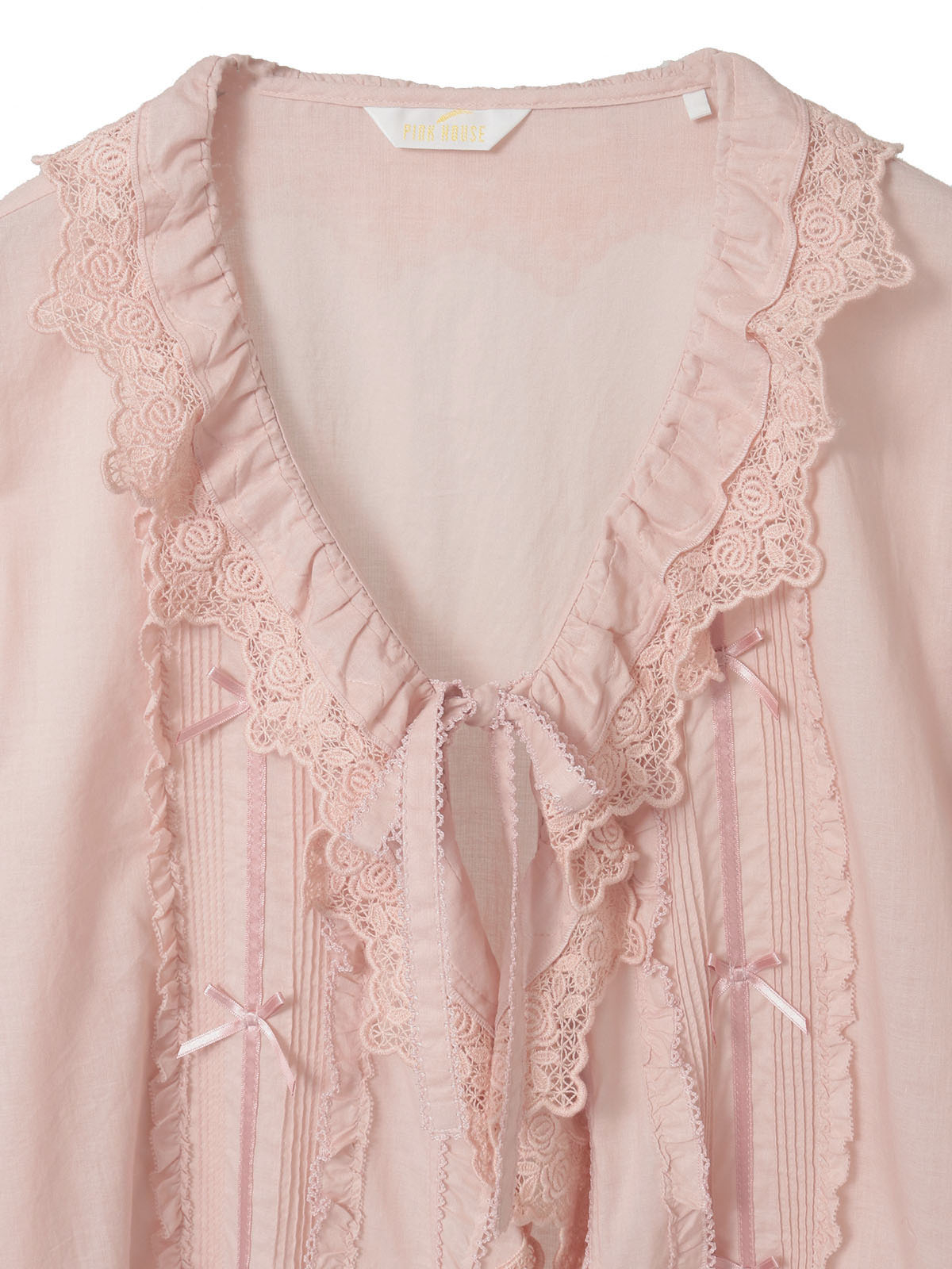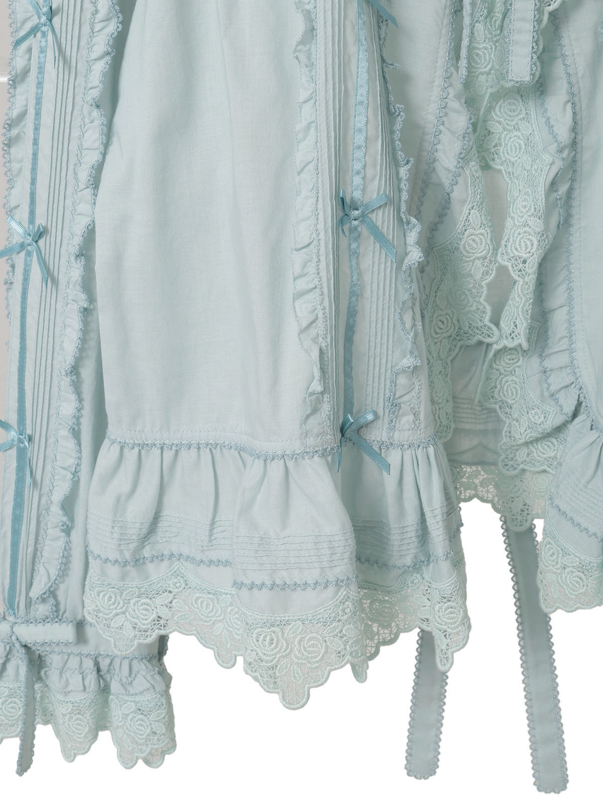 フロントや袖まわりにもフリルにピンタック、サテンリボンにハシゴレースをふんだんにあしらえて豪華でとても華やかな仕上がりに。