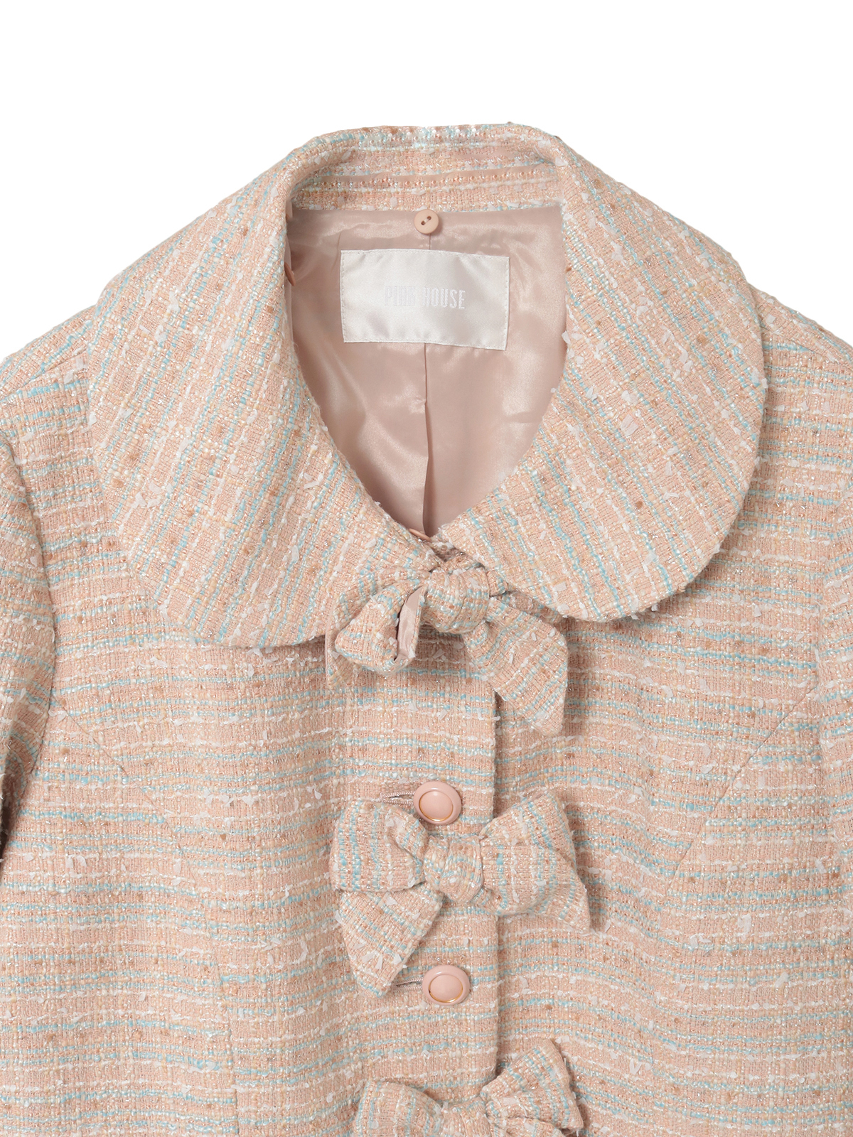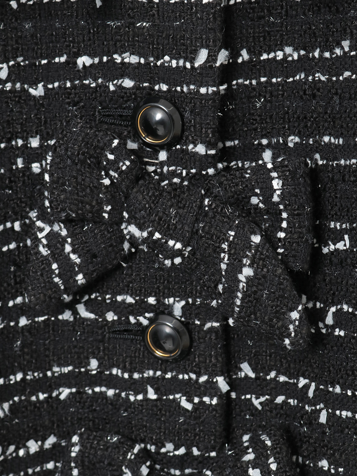 同じファンシーツイードのスカートもございますのでセットアップもオススメです。綿ローンなどのワンピースやスカートのアイテムなどに合わせてみても可愛く着られるのでいろいろな着こなしをお楽しみください。