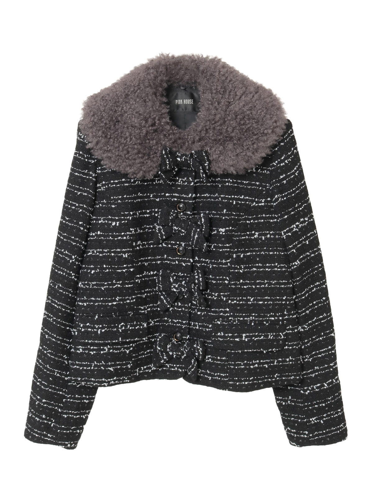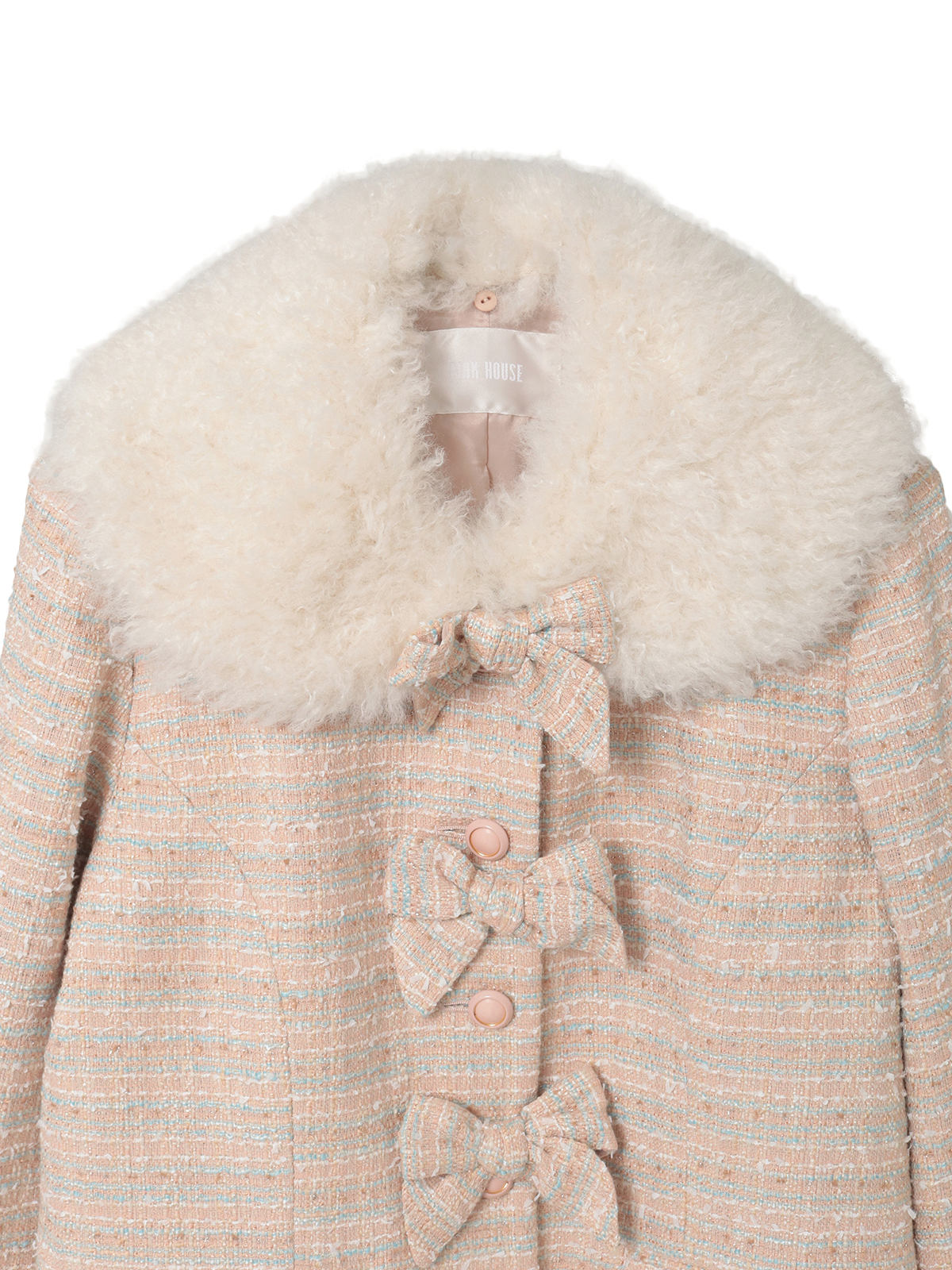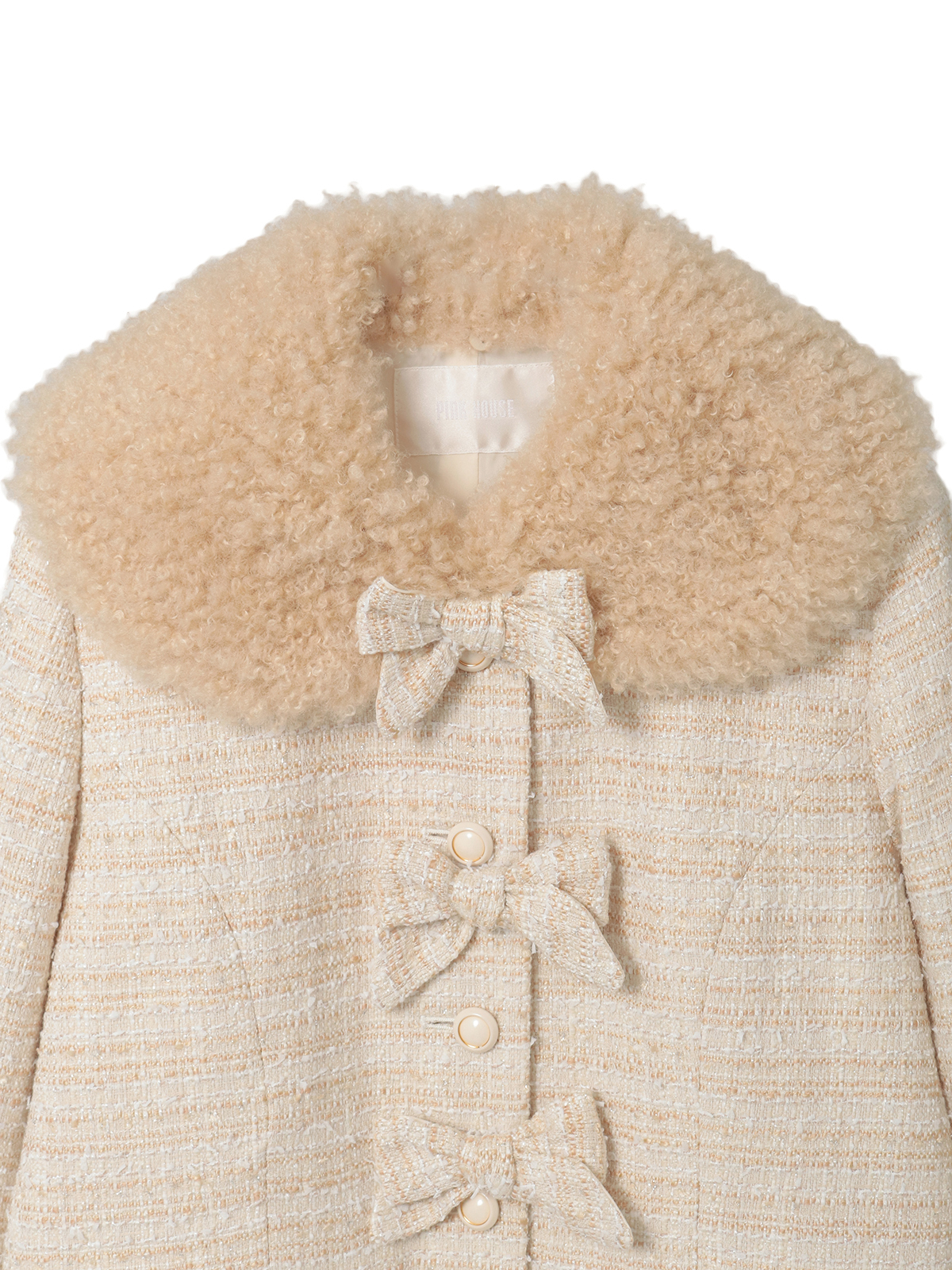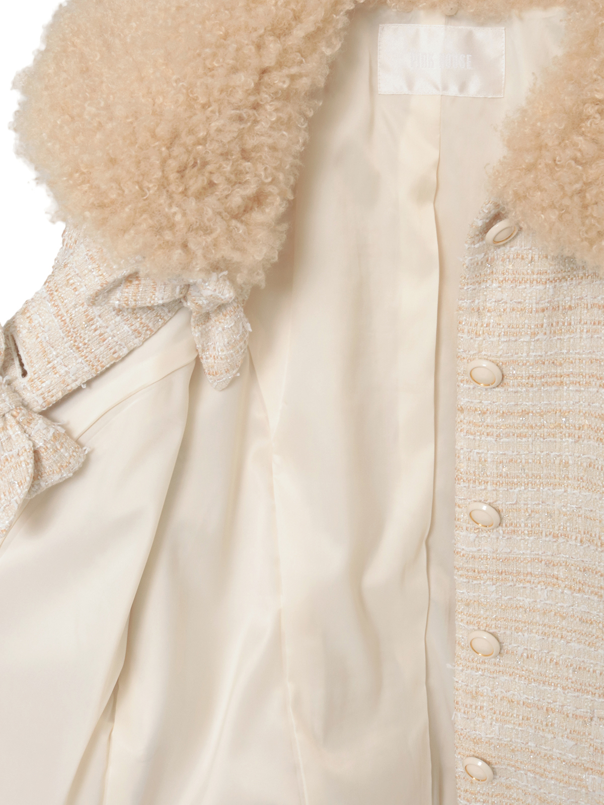 ふわふわのフェイクファーの衿と、フロントにあしらったリボンモチーフがポイントに。