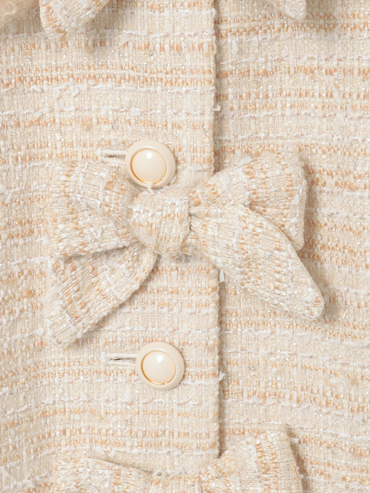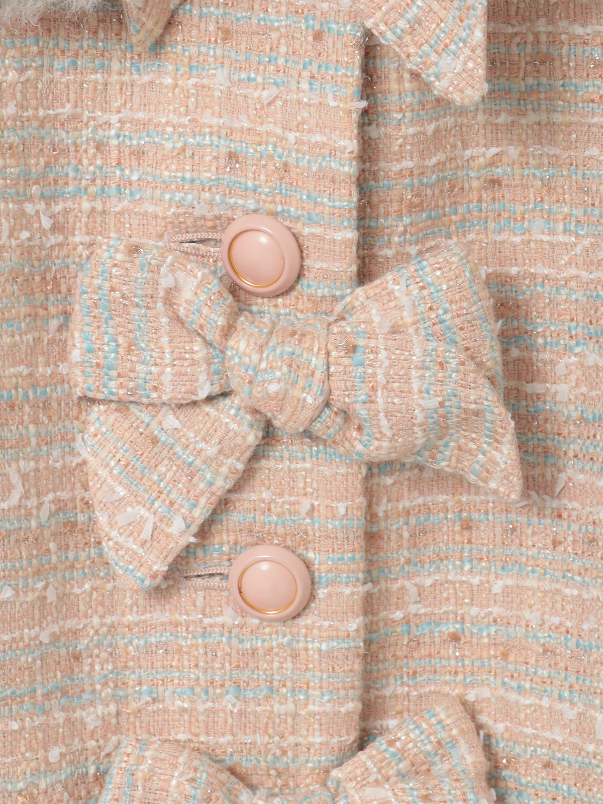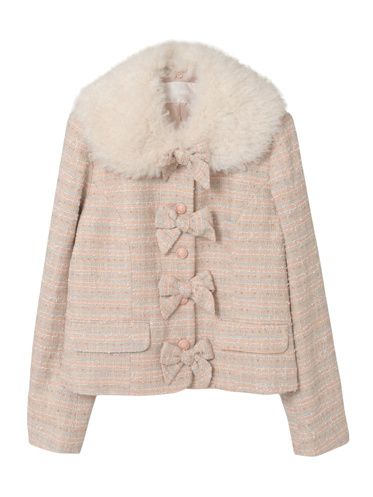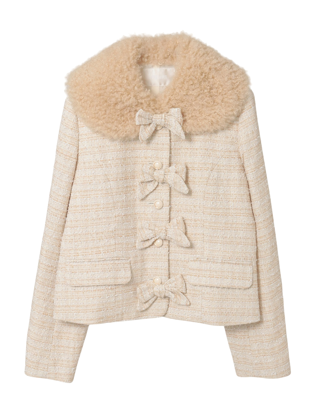 ふわふわのフェイクファーの衿と、フロントにあしらったリボンモチーフがポイントに。