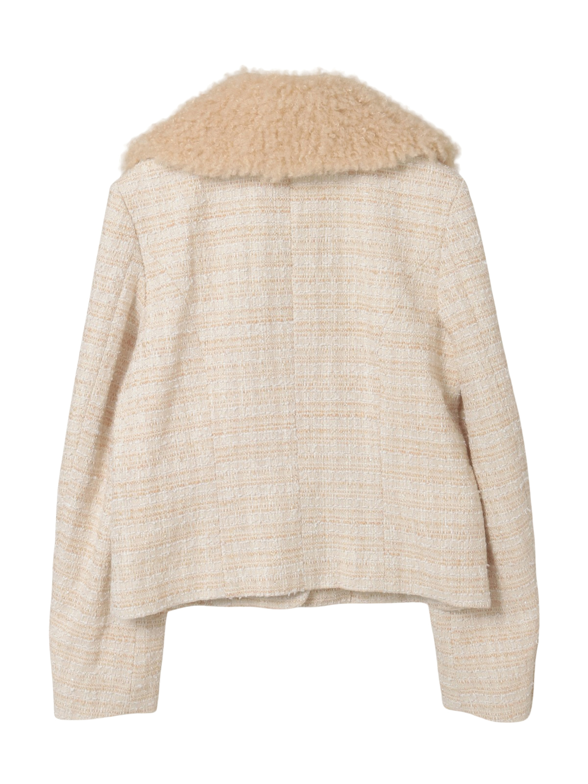 ファーの衿は取り外しができるので、お好みでどうぞ。外すと丸みを帯びたやや大きめ衿がポイントのジャケットに早代わりです。