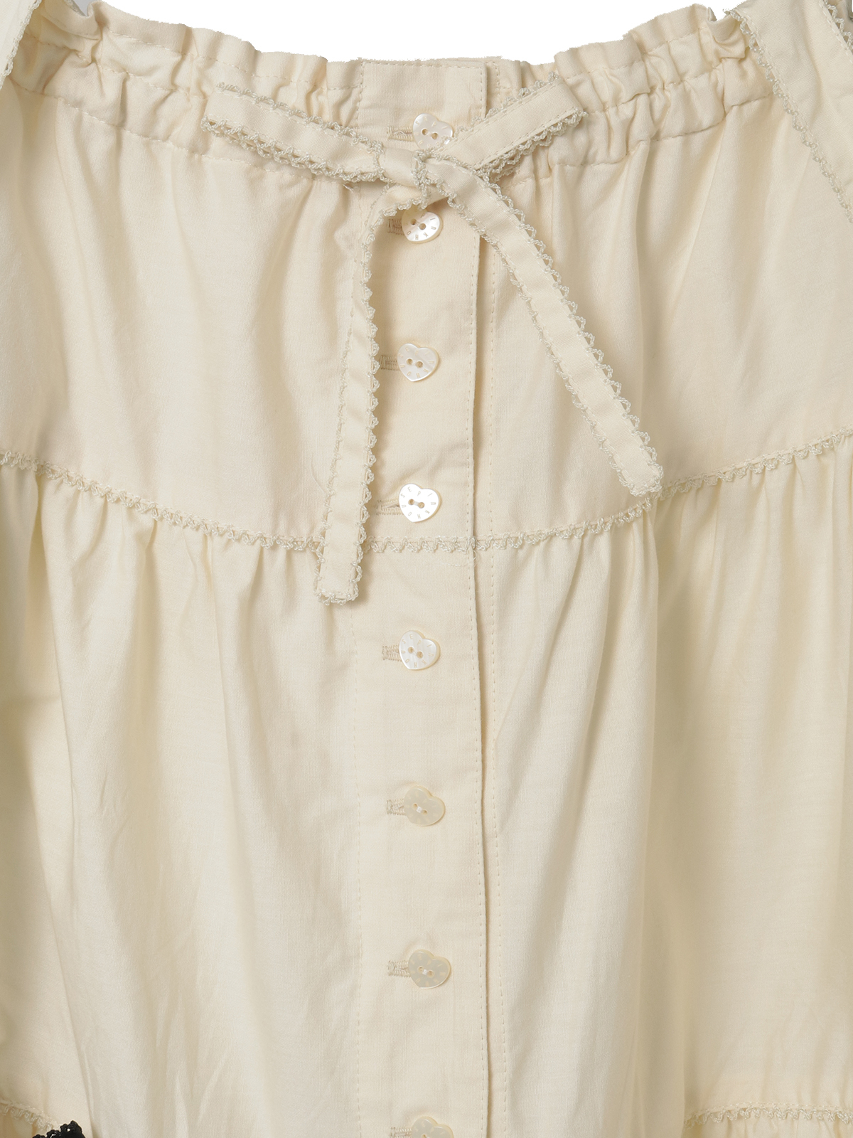 吊りタイプのデザインなので、吊りスカートとしてお楽しみいただいたり、吊り紐は左右に垂らしてみても可愛いのでお好みでどうぞ。