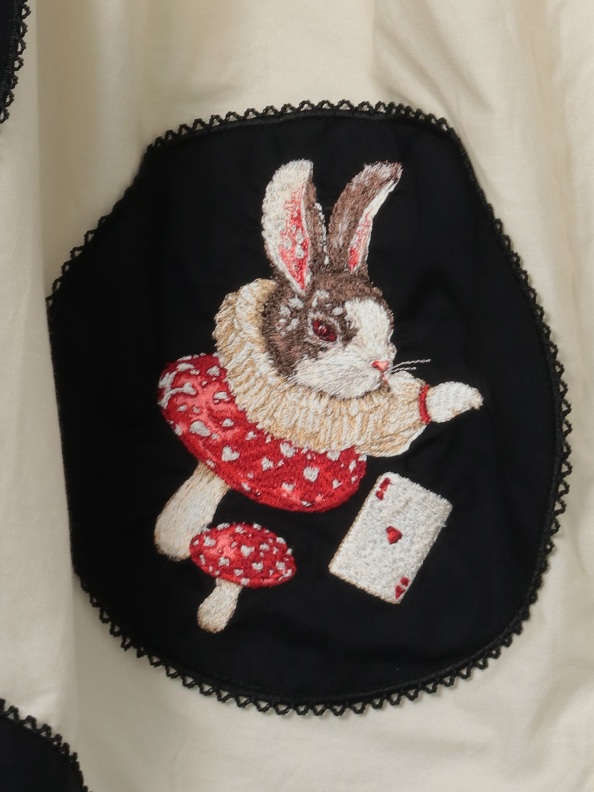 それぞれの”Rabbit holeワッペン”には、TOADSTOOL RABBIT(キノコに浸食されたうさぎ)、TWINS CHESHIRE(双子のチシャネコたち)、FLYING ON BROOM(ほうきに乗った魔女うさぎ)モチーフの刺繍を施したものや、WONDER LANDのエンブレム刺繍を施したものなどを交互にあしらって、とても華やかな仕上がりに。
