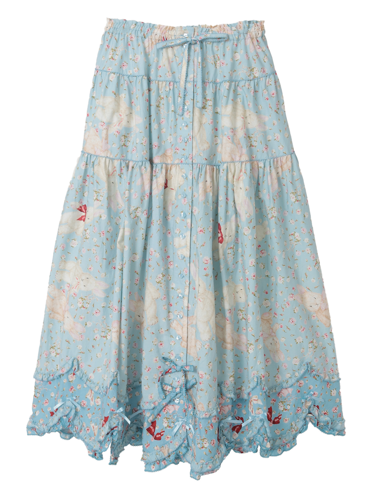 裾にかけて広がる分量感たっぷりのロングティアードスカートは、大ぶりなうさぎの柄が出るように配置しています。