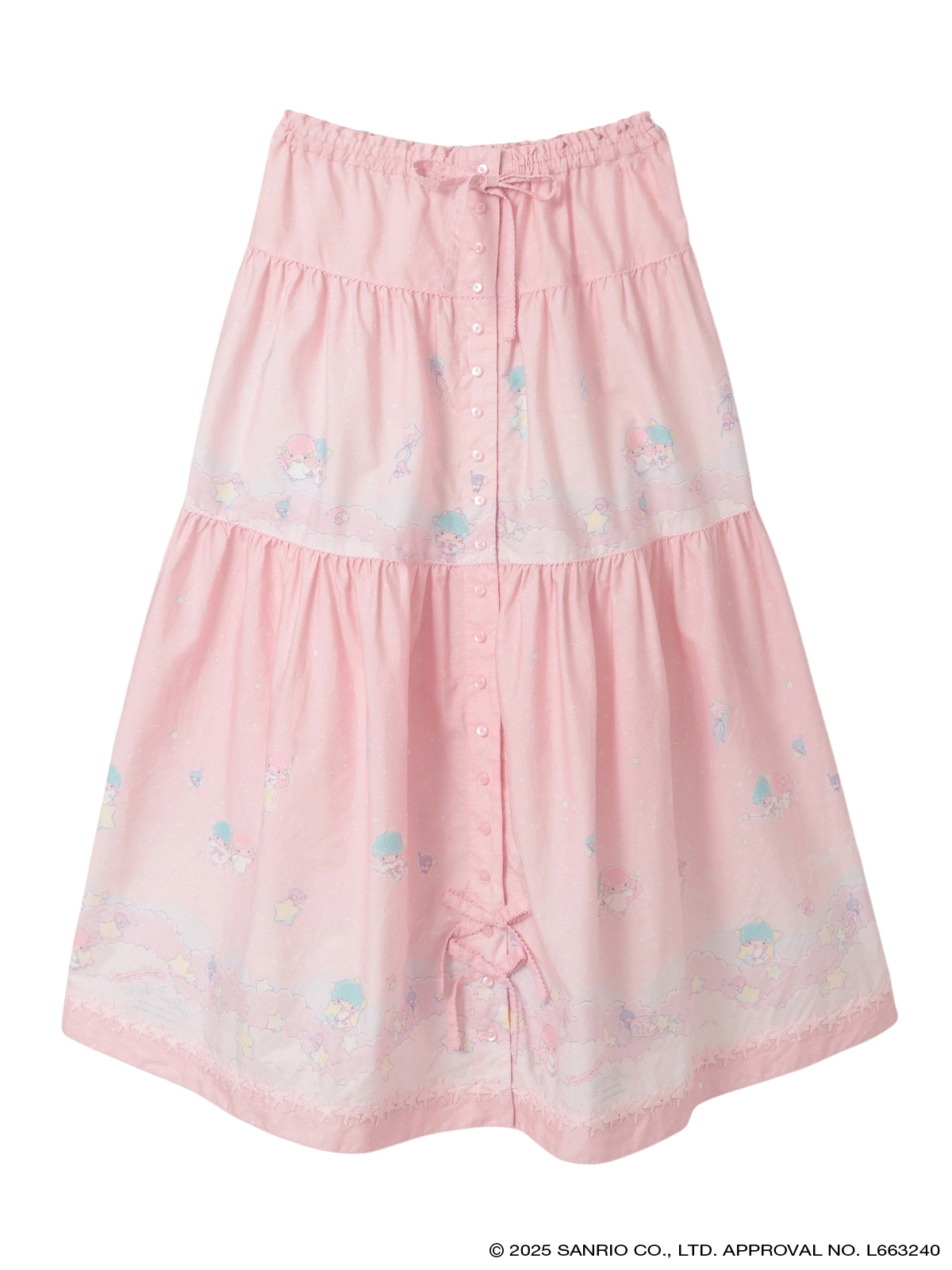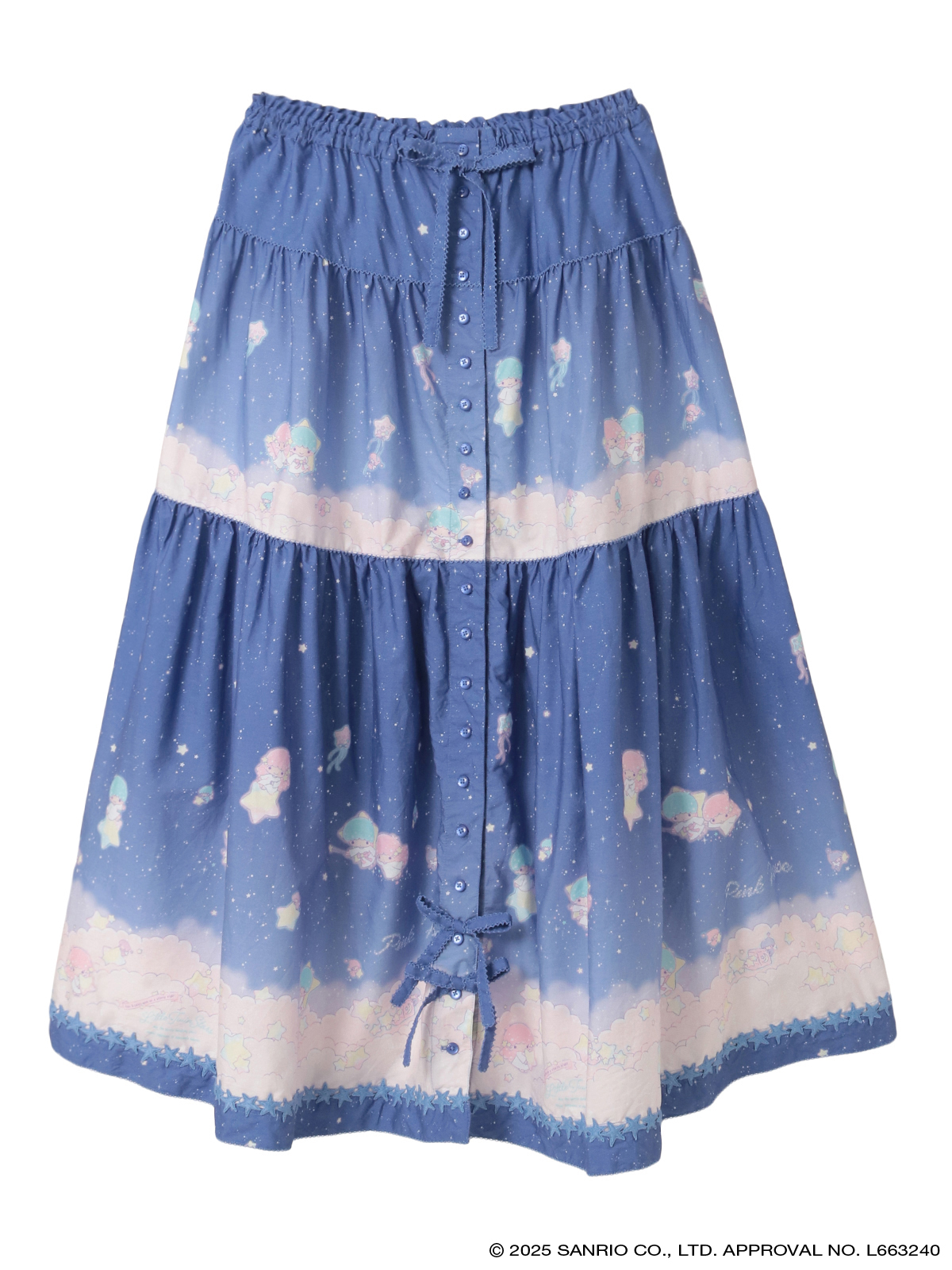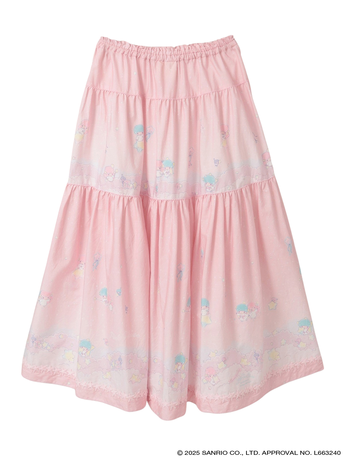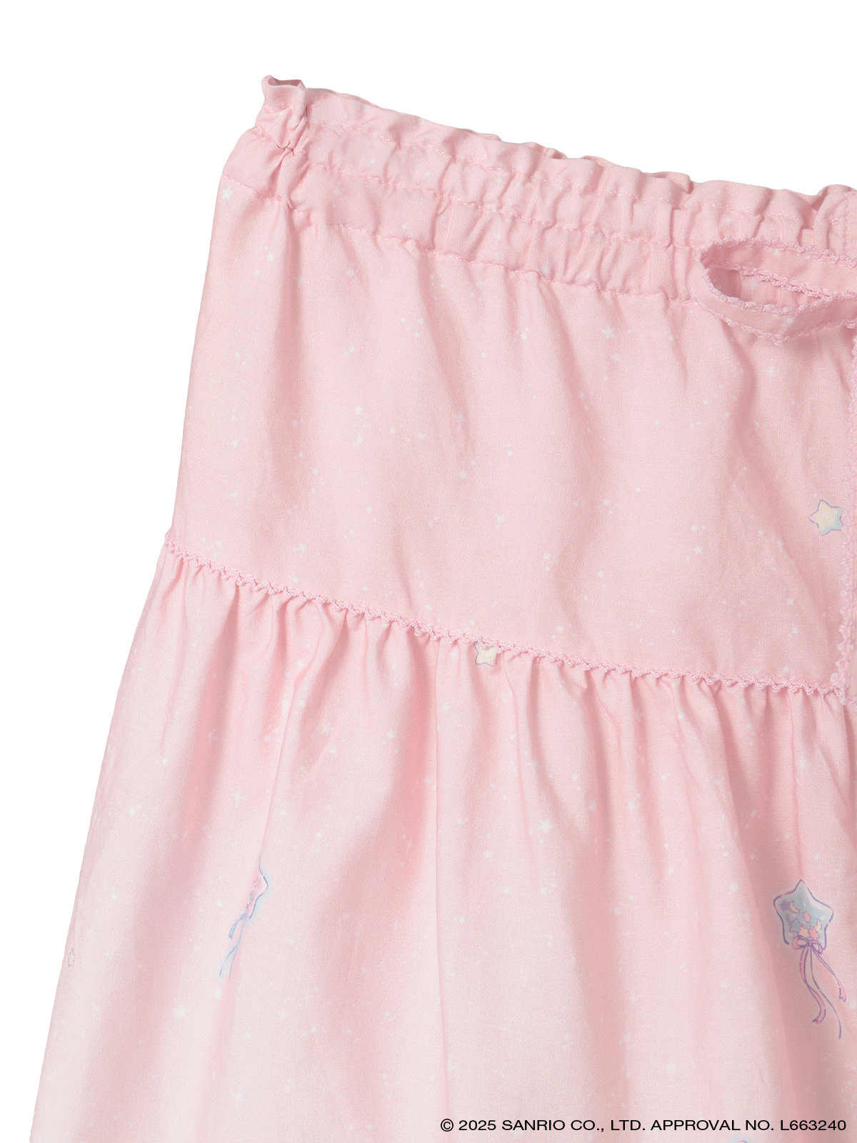 リトルツインスターズ(キキ&ララ)50周年のお祝いの気持ちを込めて、ピンクハウスのお洋服の柄として新たに描き起こしレイアウトしたテキスタイル。