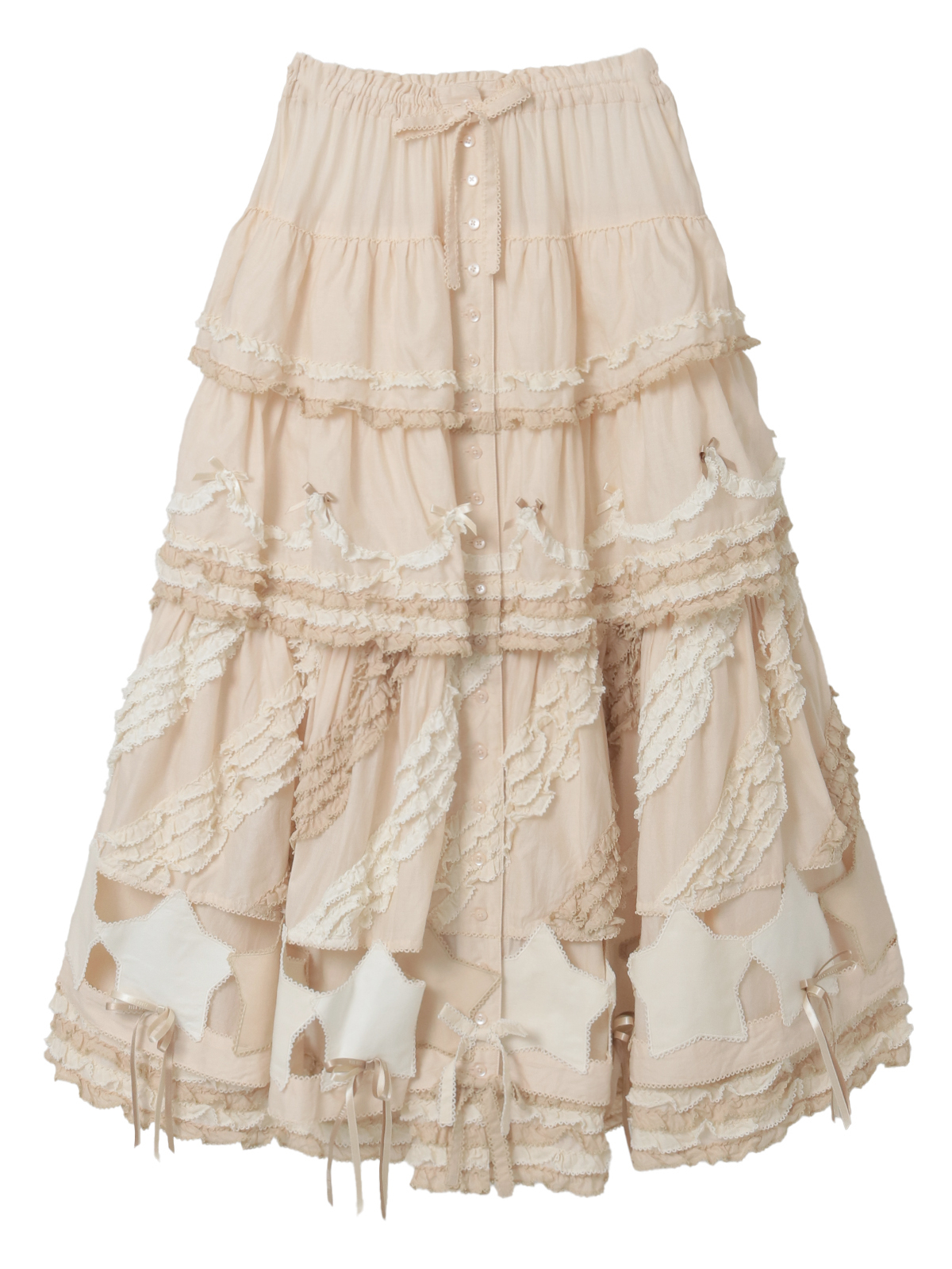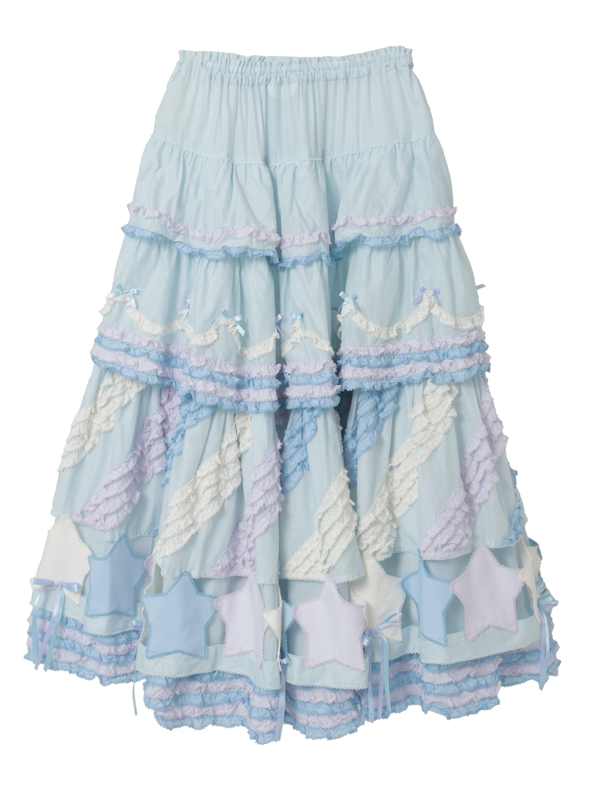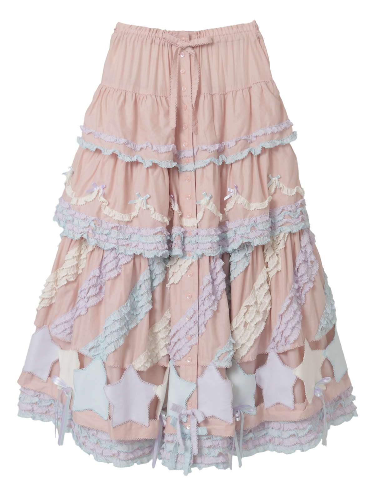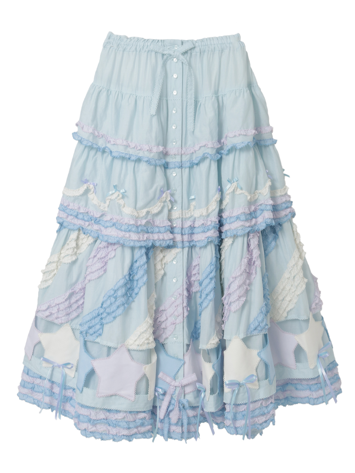 星のかたちをしたキュートなワッペンを裾まわりに連ねたローンフリルの段々ロングスカート。