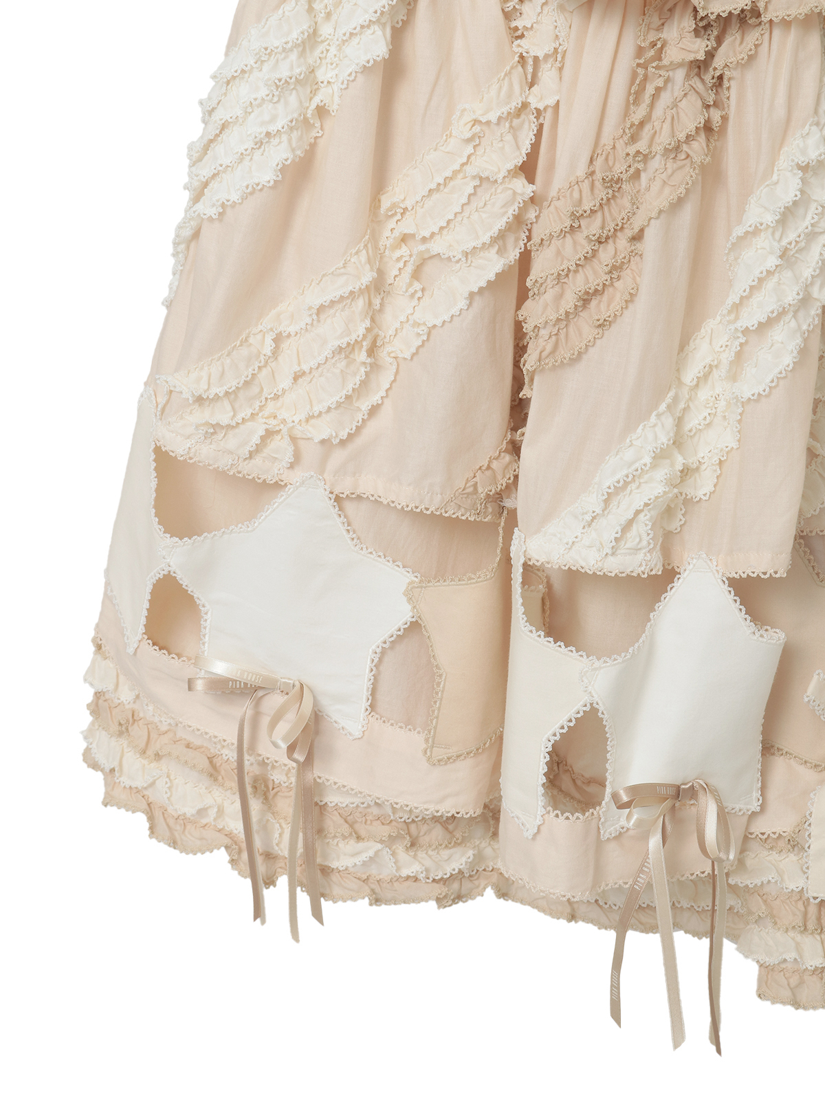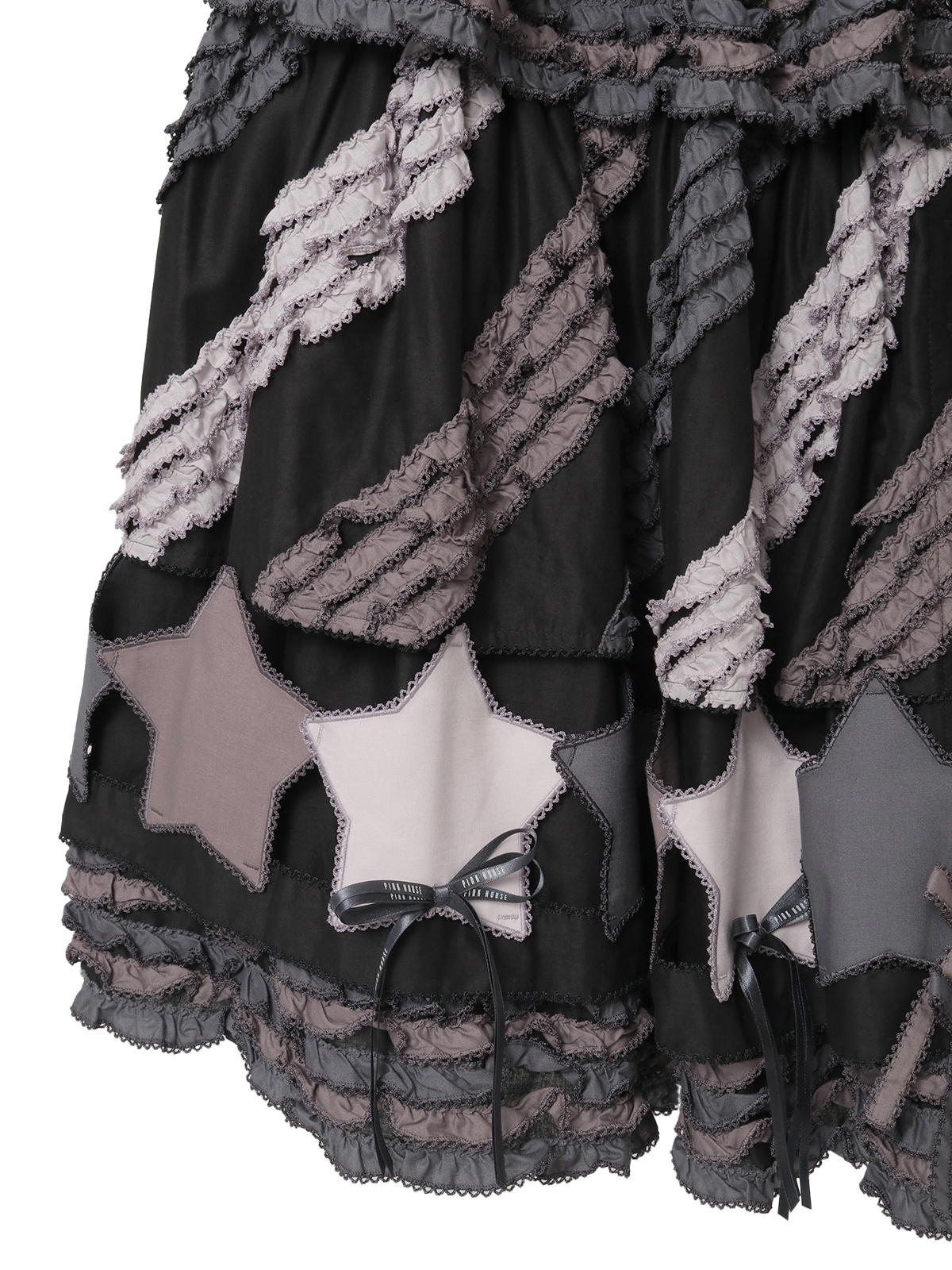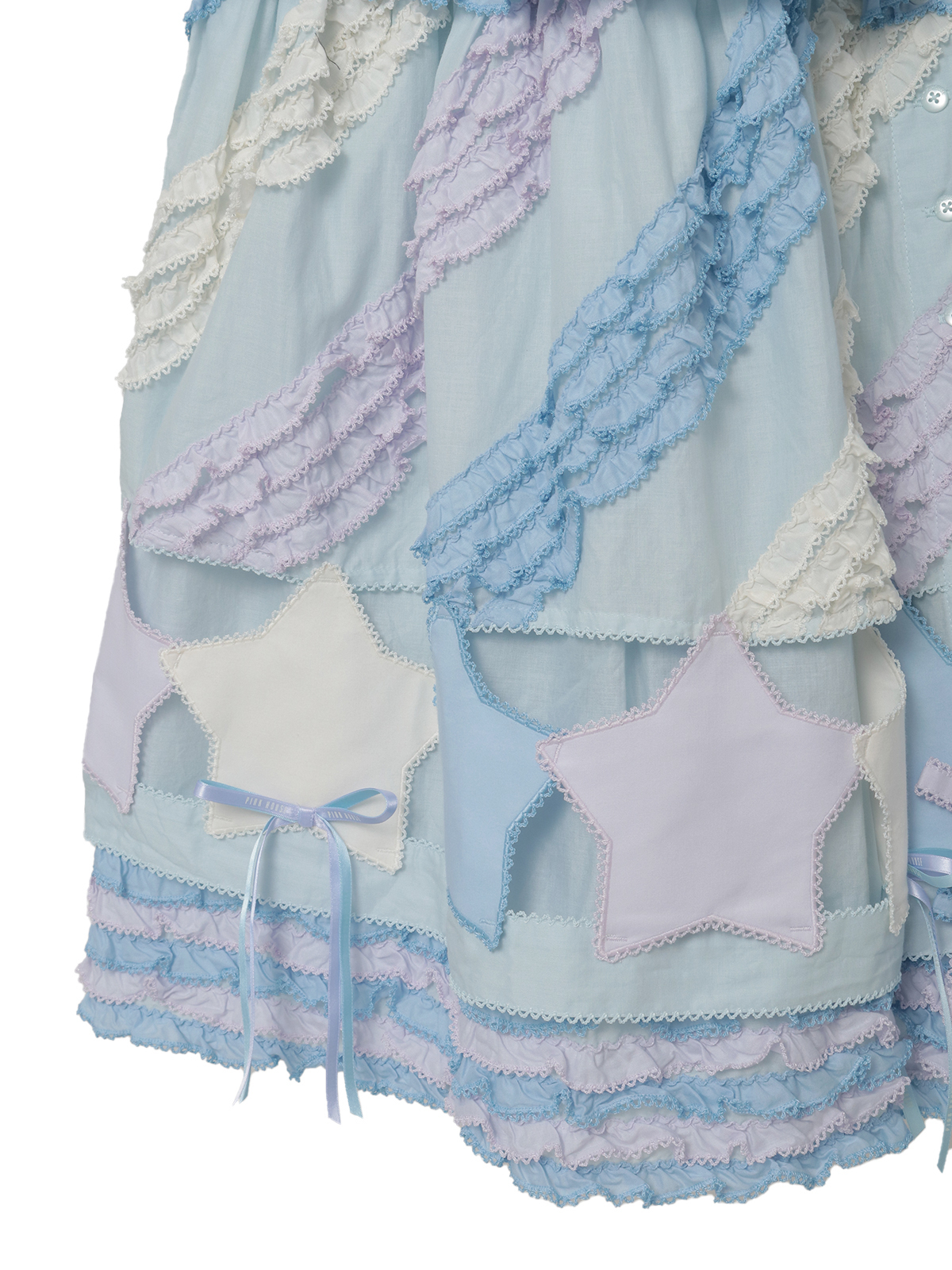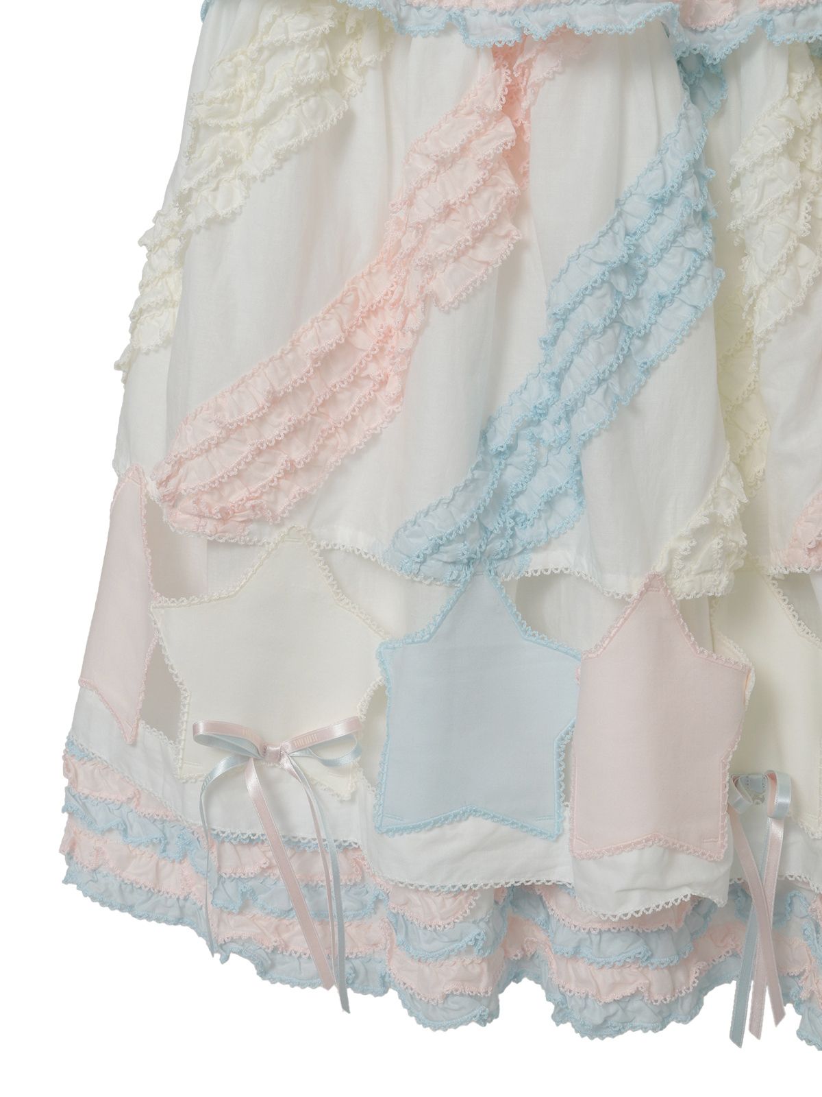 星のかたちをしたキュートなワッペンを裾まわりに連ねたローンフリルの段々ロングスカート。