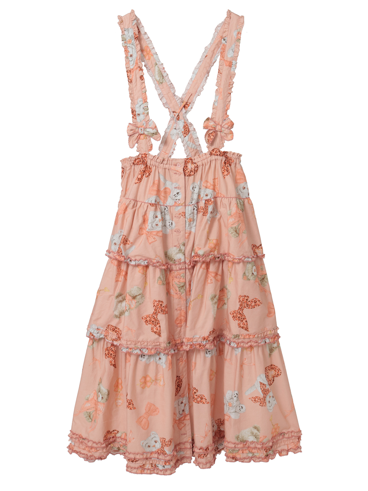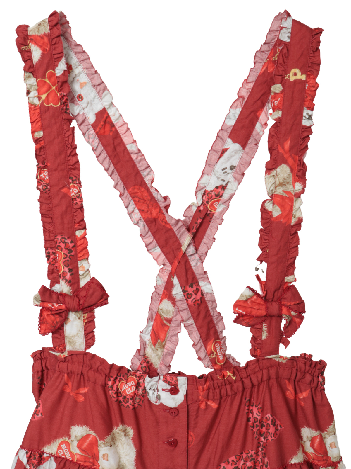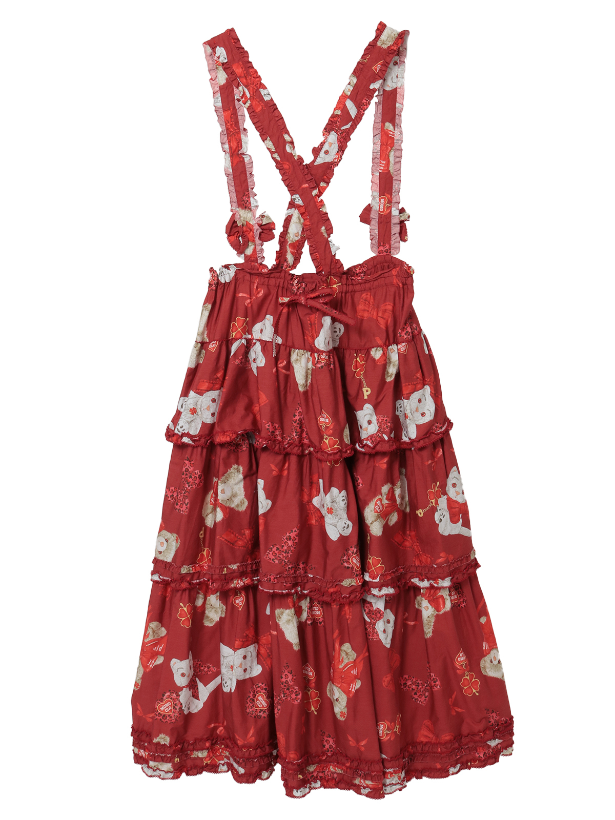 吊り紐が付いていて吊りスカートとしてもお楽しみいただけます。紐の先にはリボンモチーフをあしらって可愛らしく。
