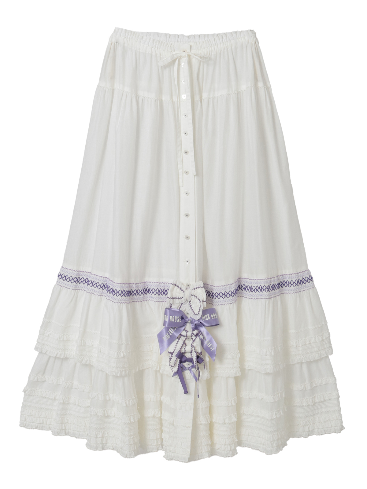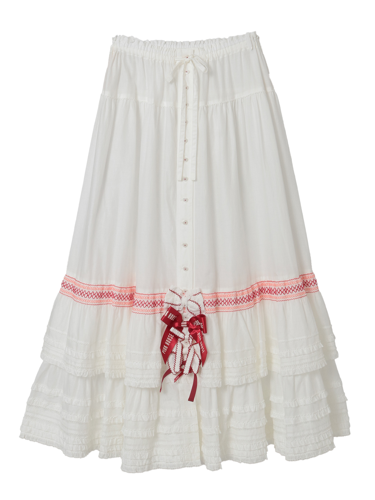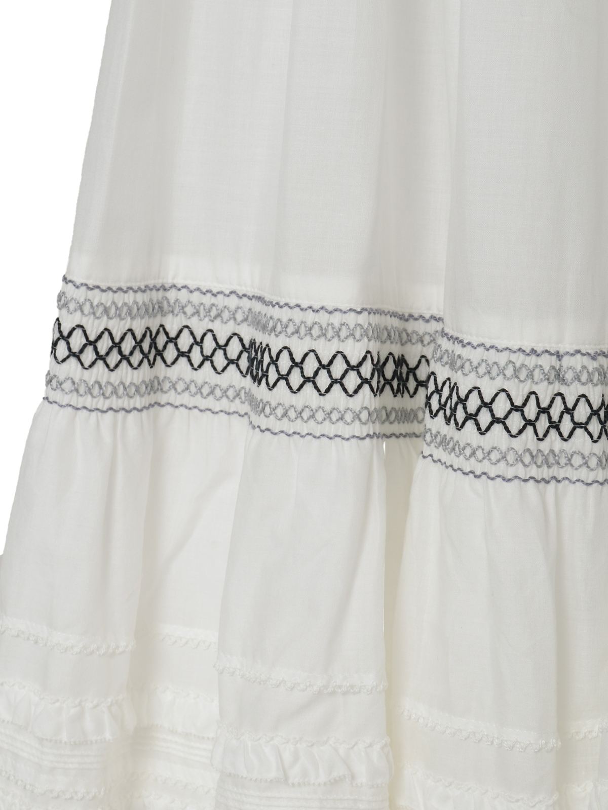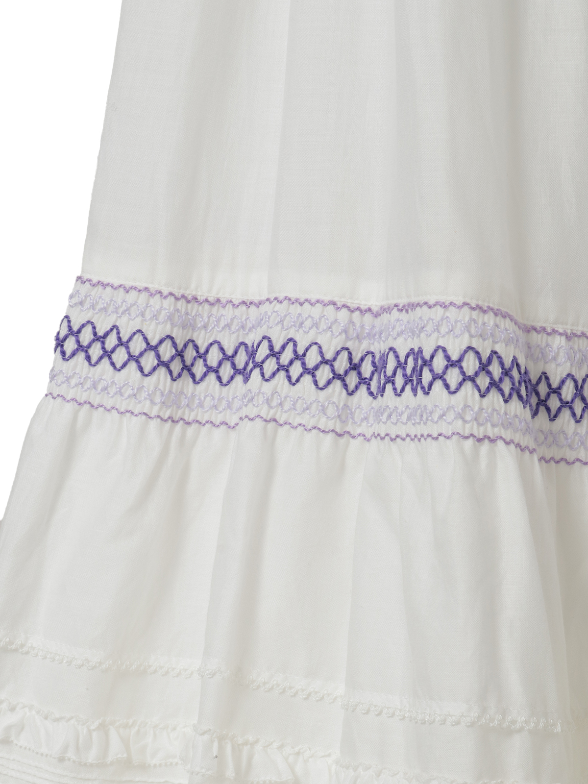 真っ白なローンに、スモッキング刺繍やリボンモチーフで味付けして配色使いにしたデザインがポイントのスカート。
