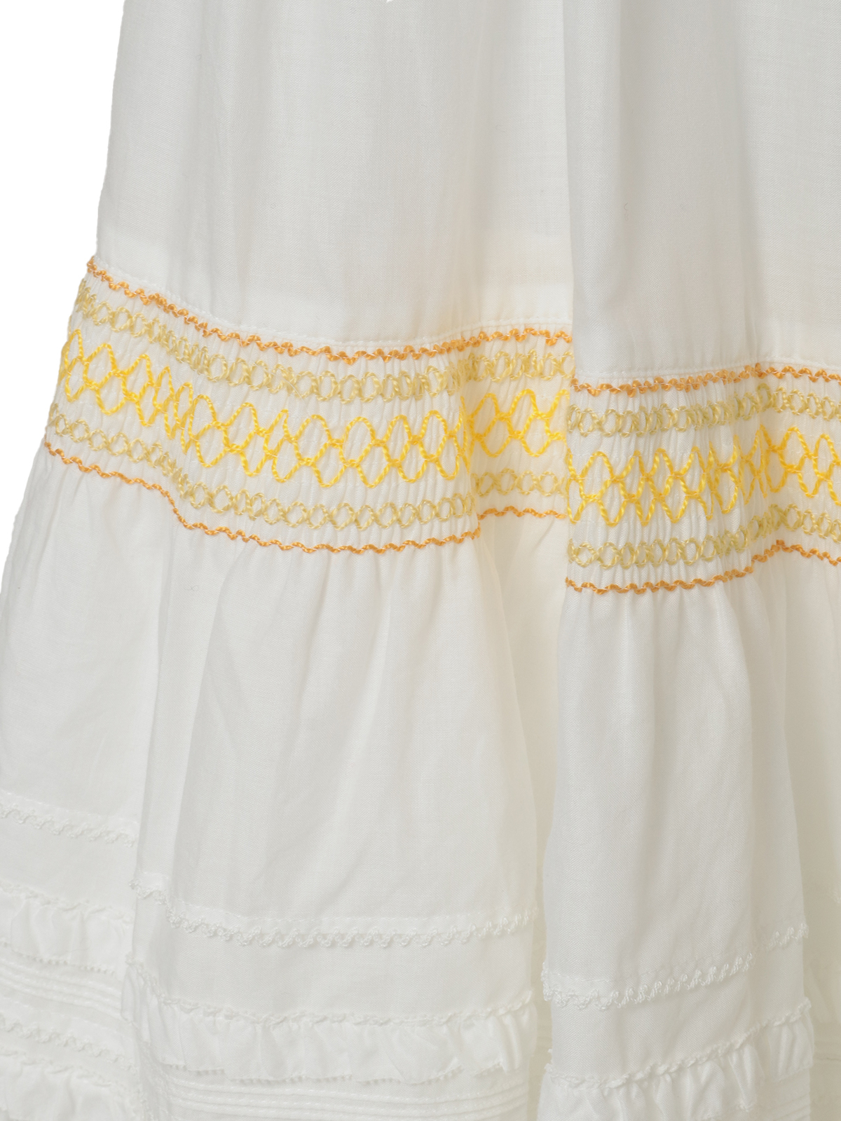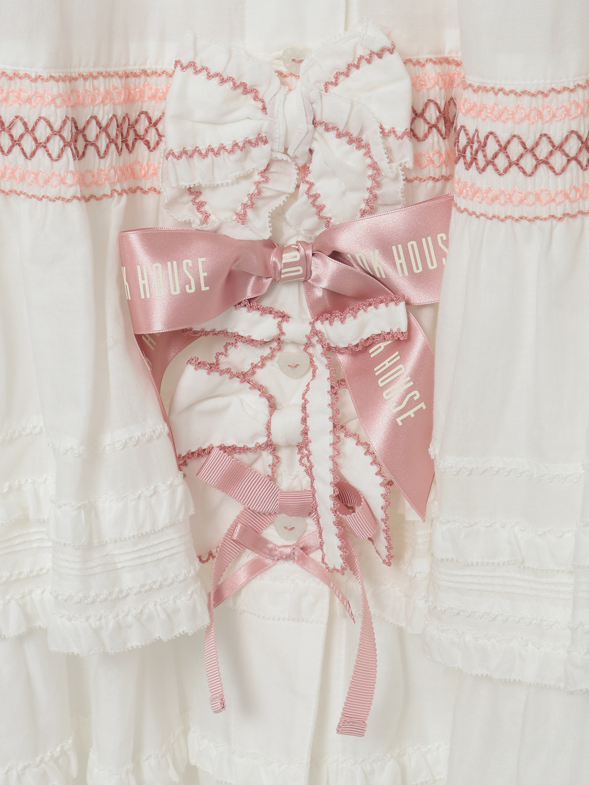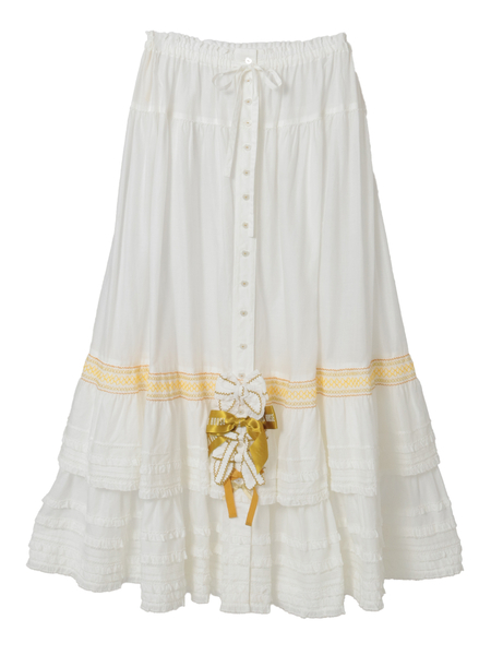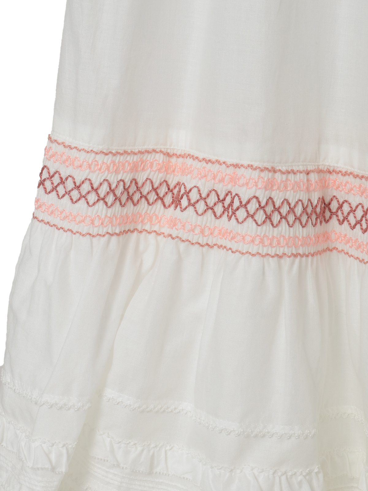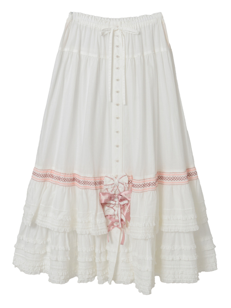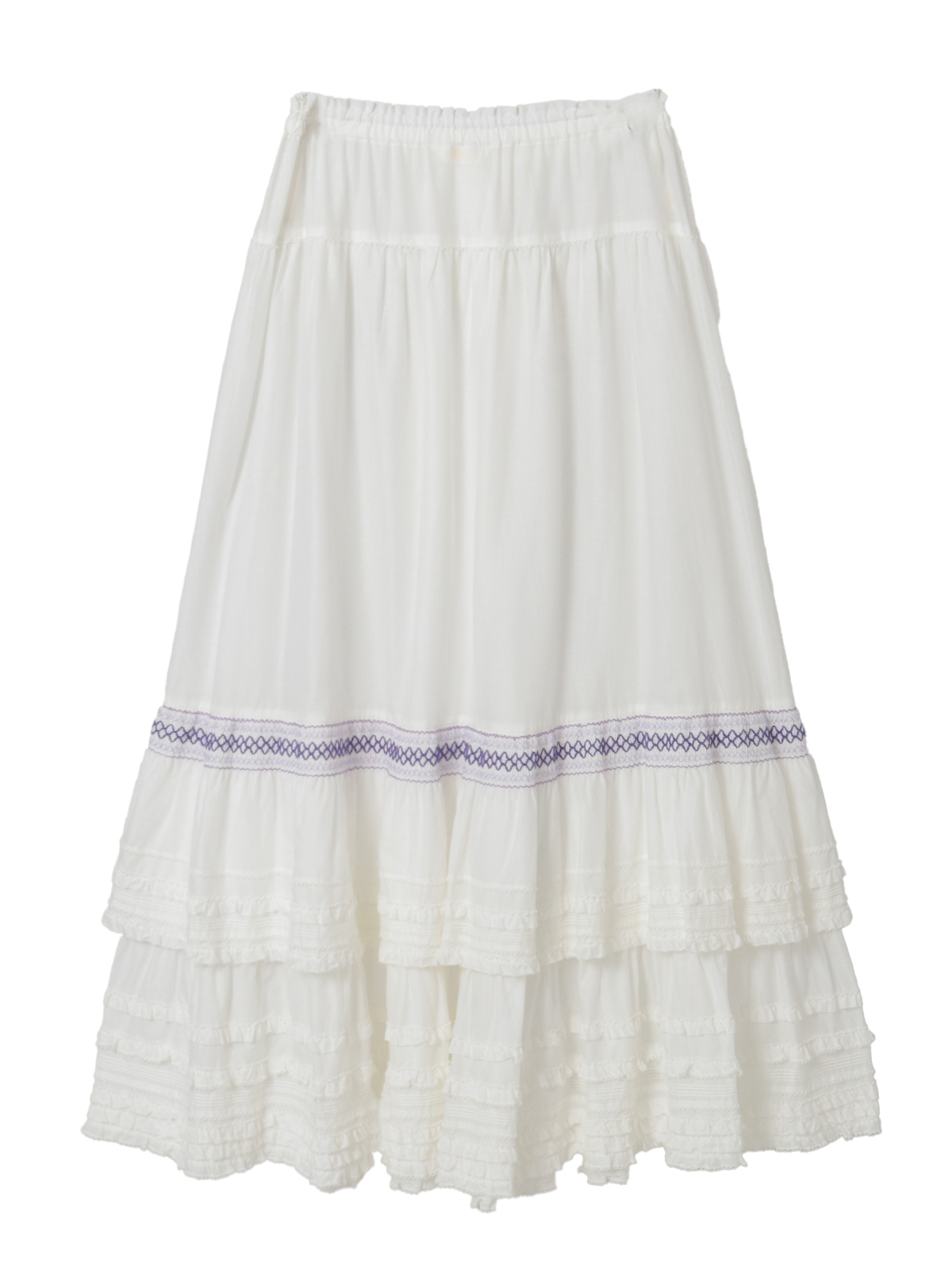 真っ白なローンに、スモッキング刺繍やリボンモチーフで味付けして配色使いにしたデザインがポイントのスカート。