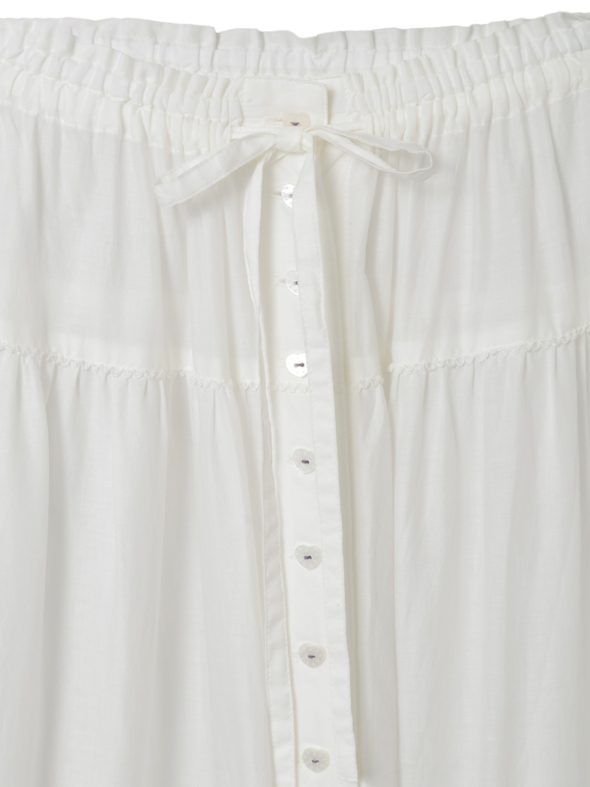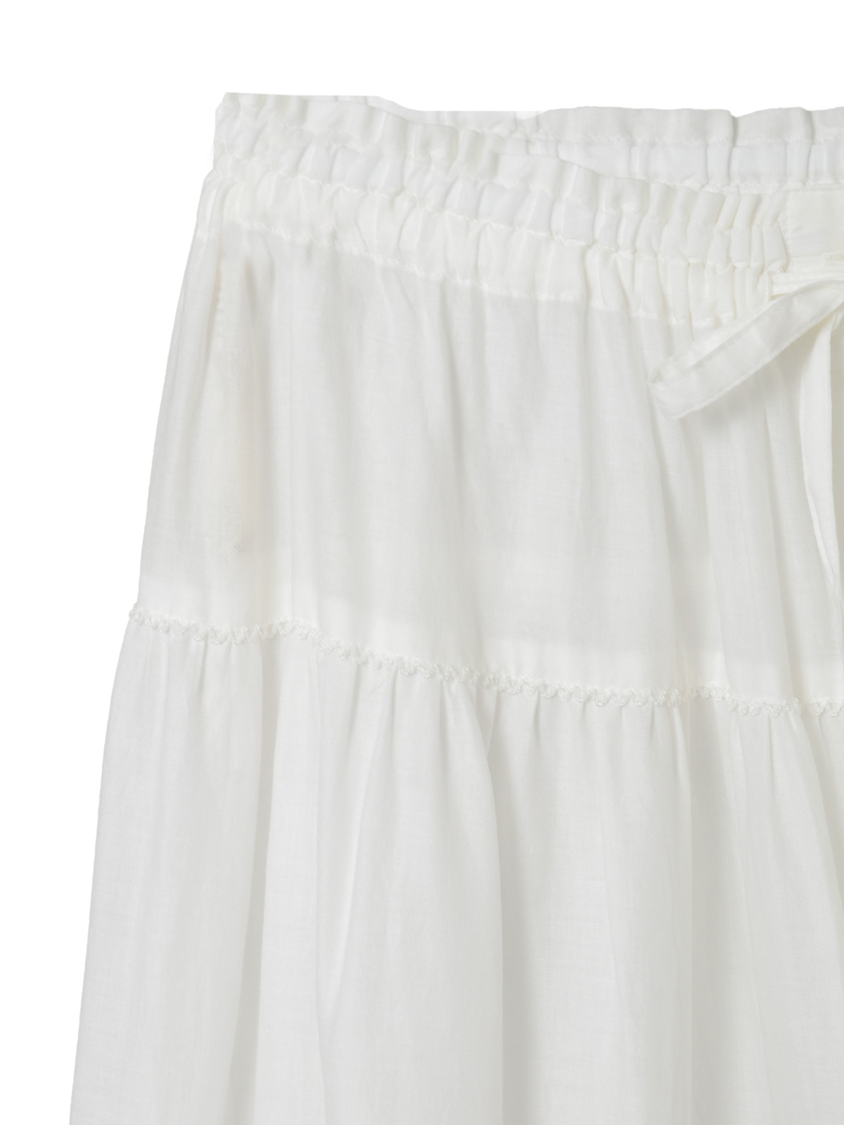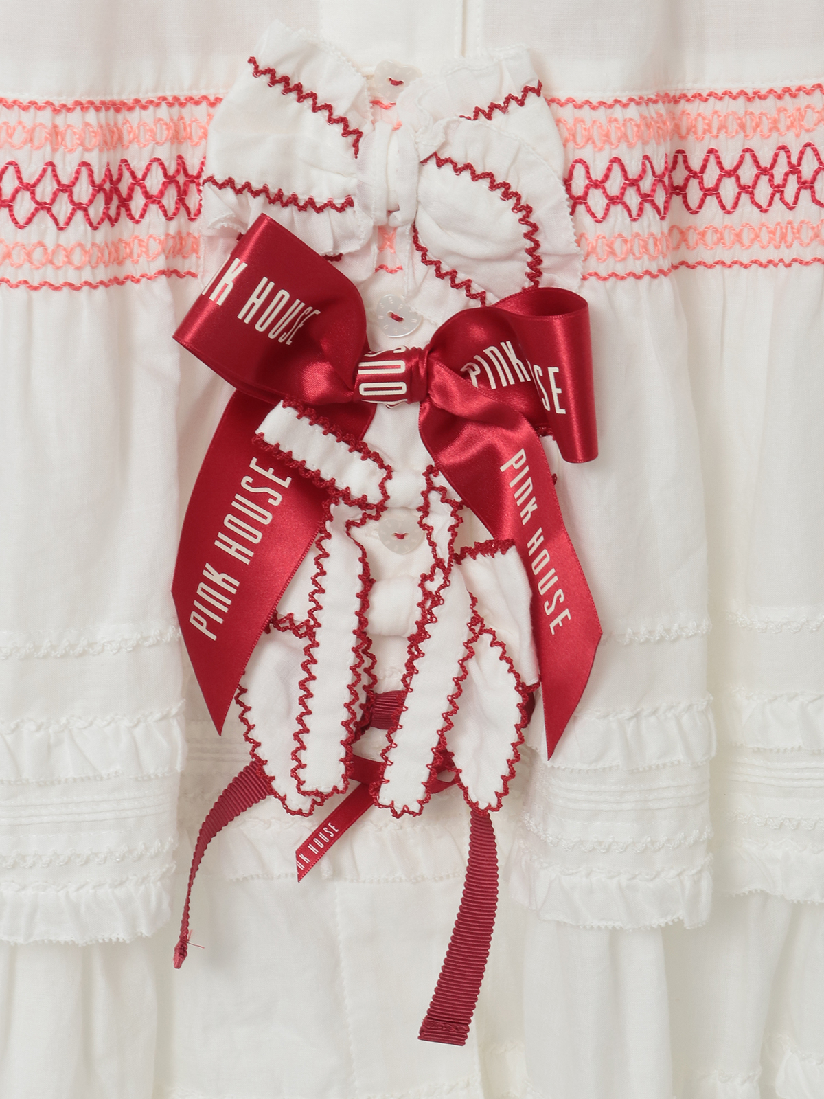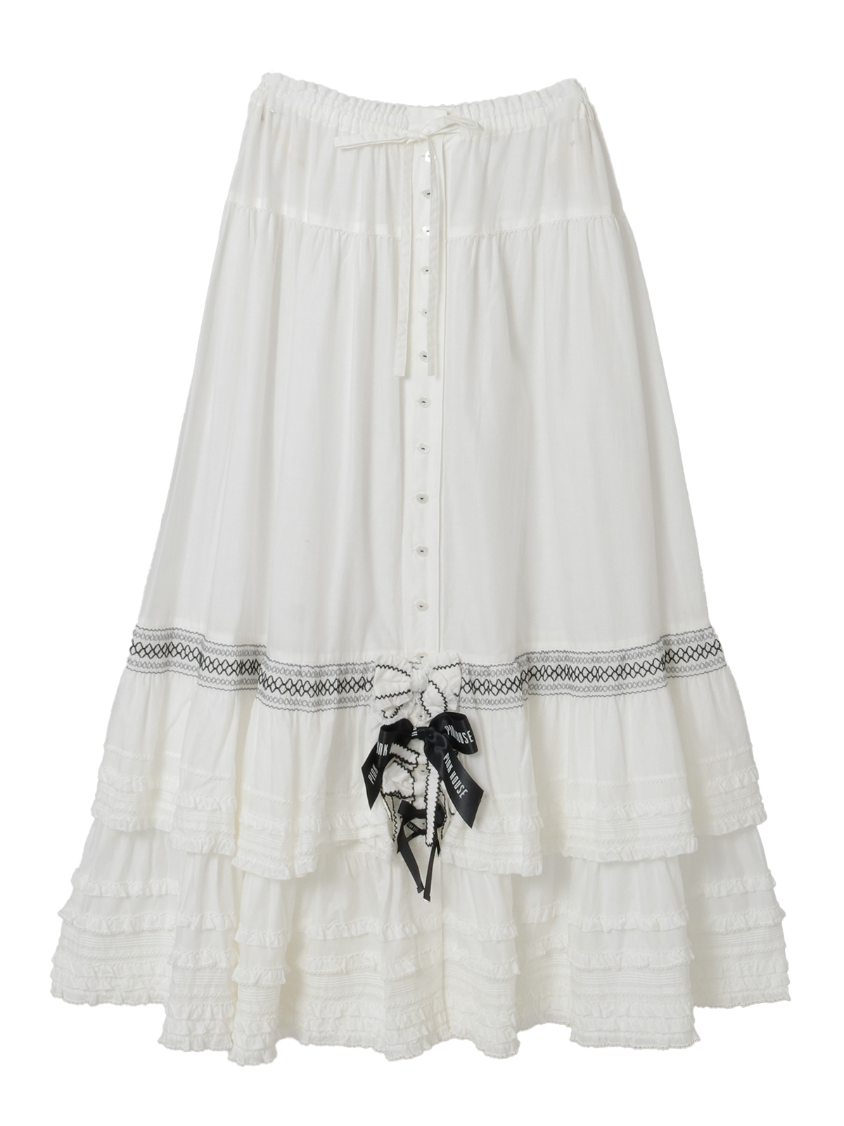 真っ白なローンに、スモッキング刺繍やリボンモチーフで味付けして配色使いにしたデザインがポイントのスカート。