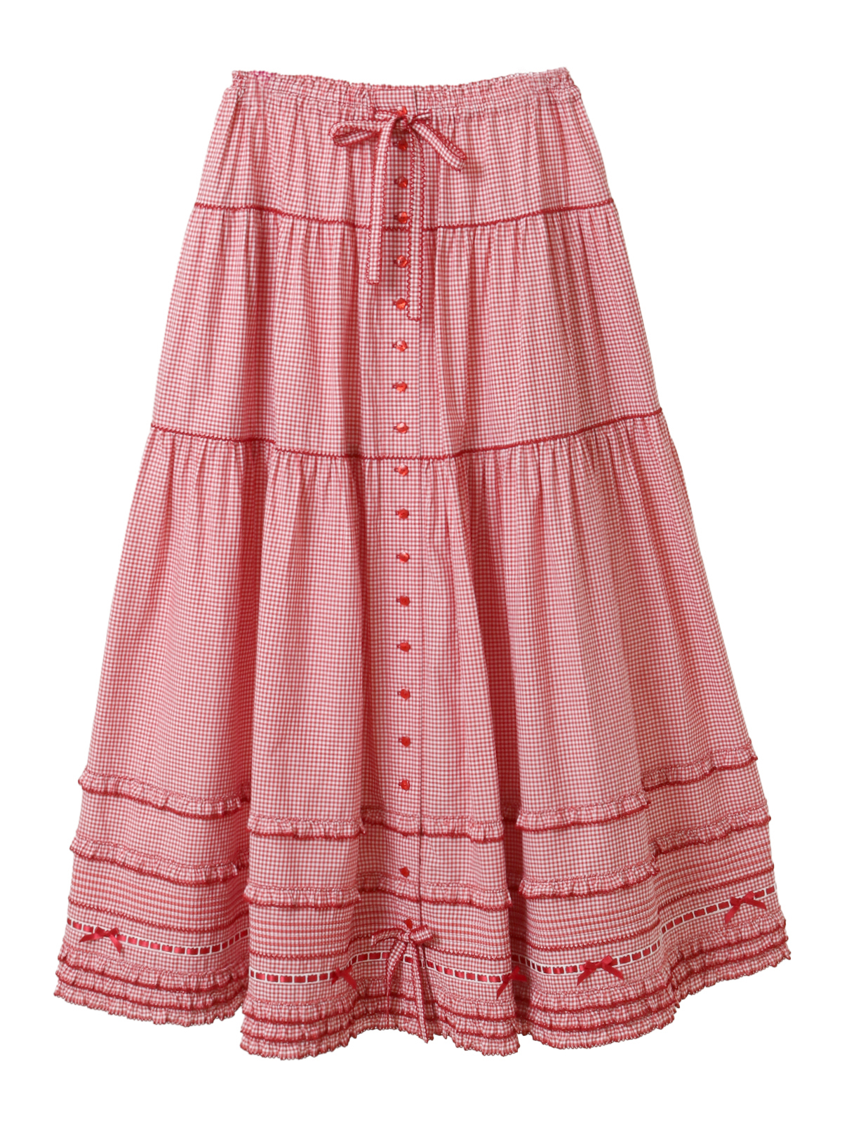 ピコフリルにピンタック、サテンリボンにハシゴレース、そしてピコット刺繍で縁取りしたリボンモチーフなど、ピンクハウスらしいキュートなデティールがいっぱい詰まったロングスカート。