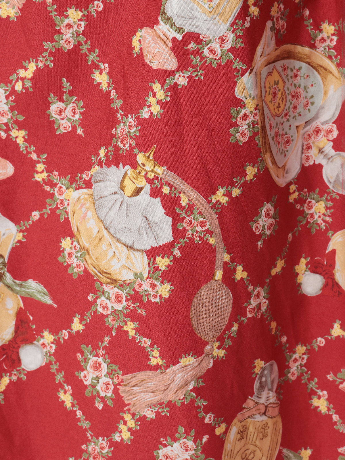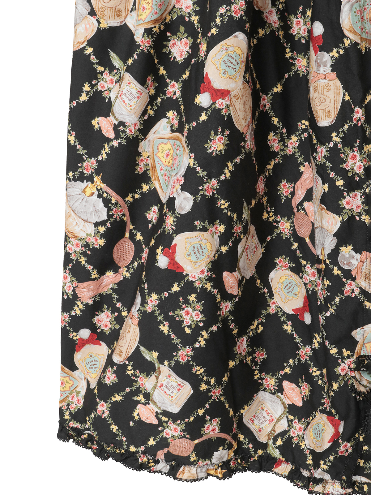 ローズやベロアリボンの装飾のついたエレガントな香水瓶たちが、薔薇格子の庭園で繰り広げる宴。
