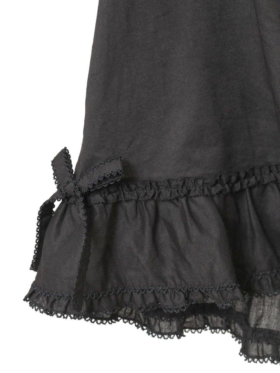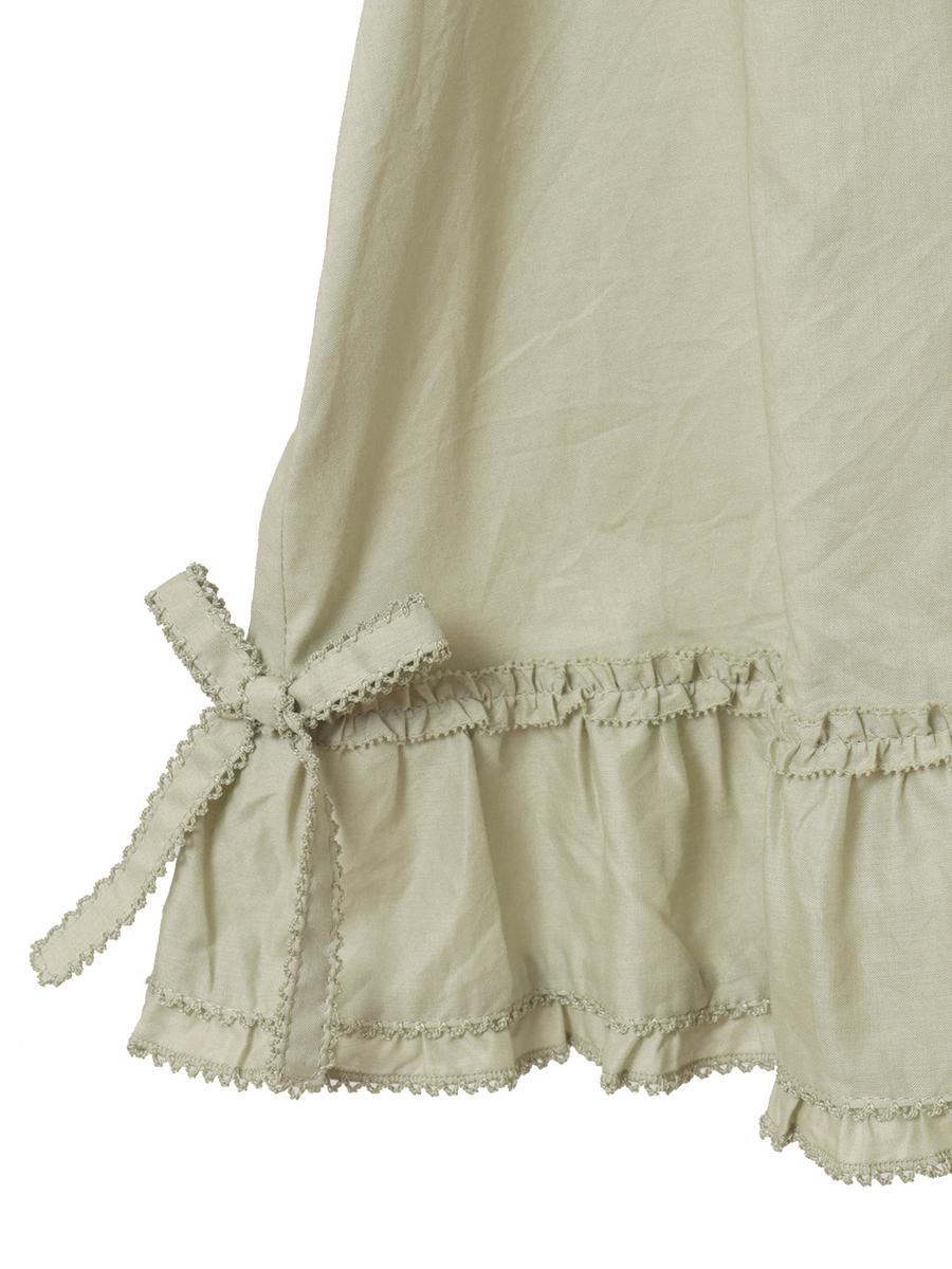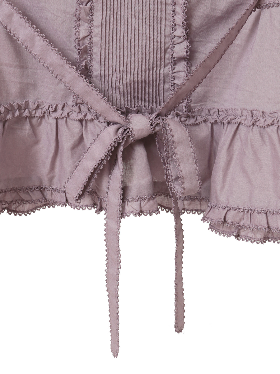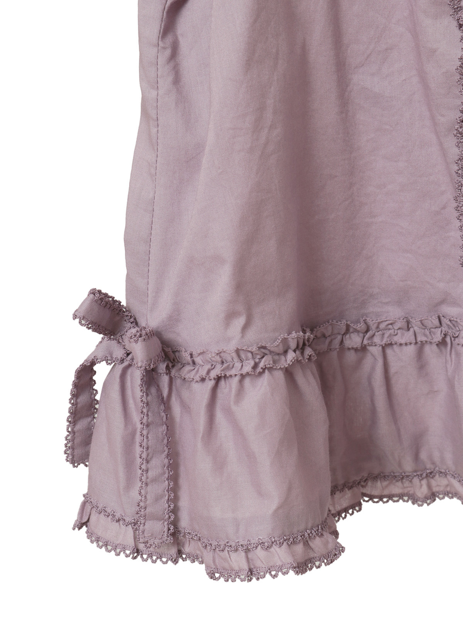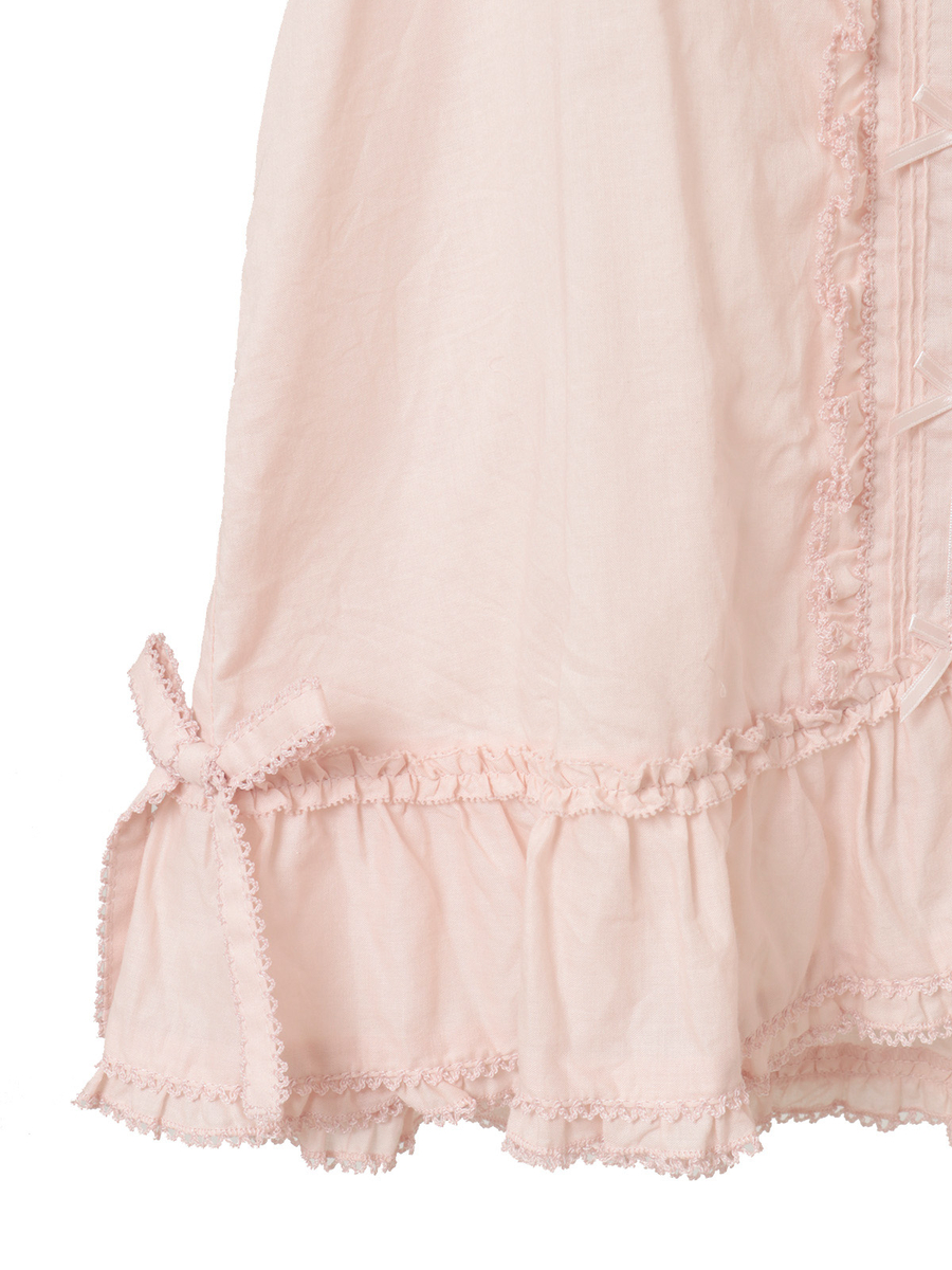 ピコフリルとピンタックの装飾を施した身ごろには、サテンリボンやミニリボンの華やかなデティールを添えてアクセントに。