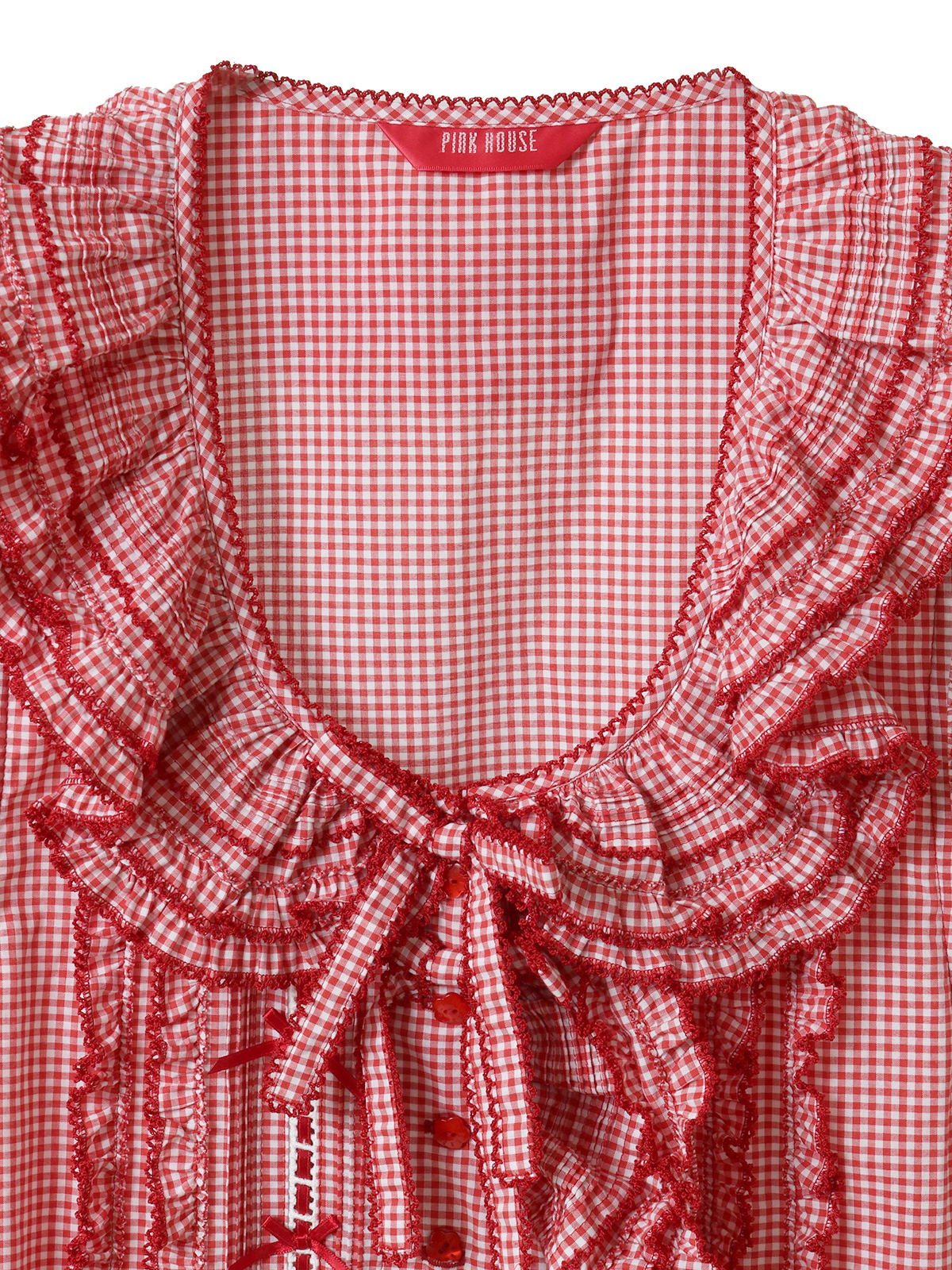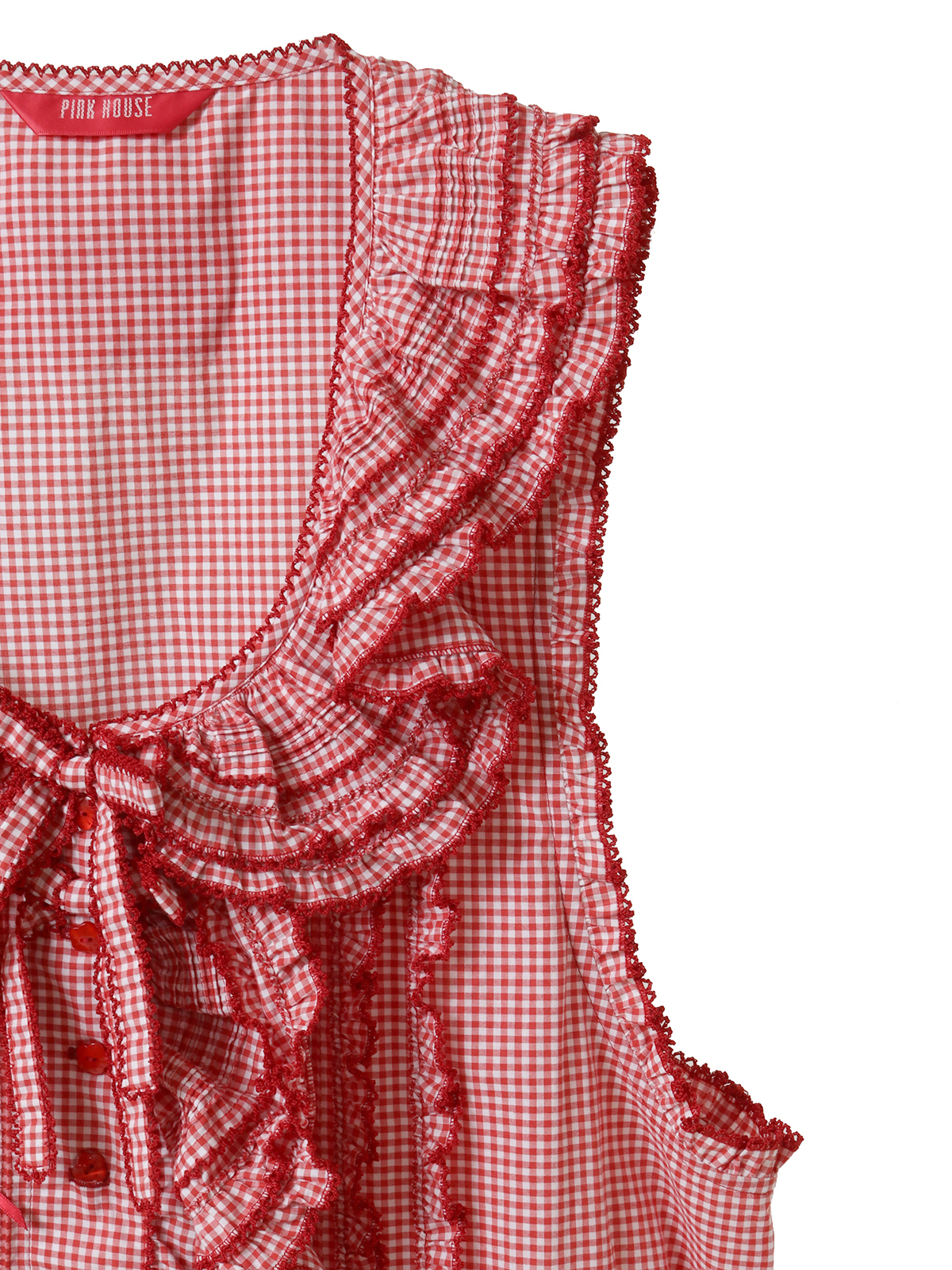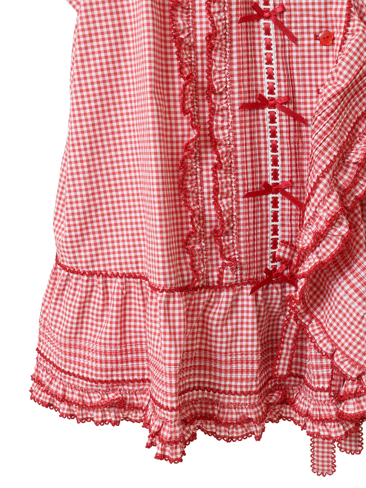 同じギンガムチェックを使った”ストロベリーローズプリント”のワンピースに合わせるのにはもちろん、他のプリントやローンのアイテムにも合わせやすいので1つあると便利なアイテムに。