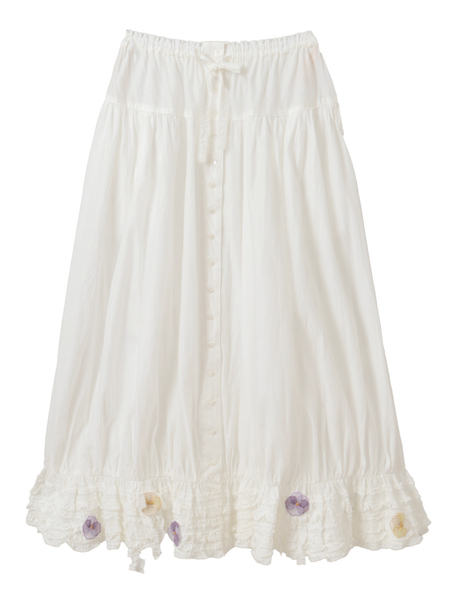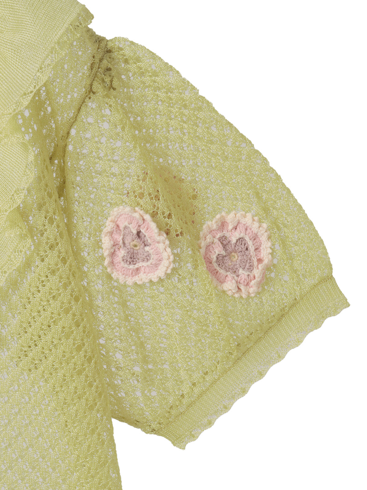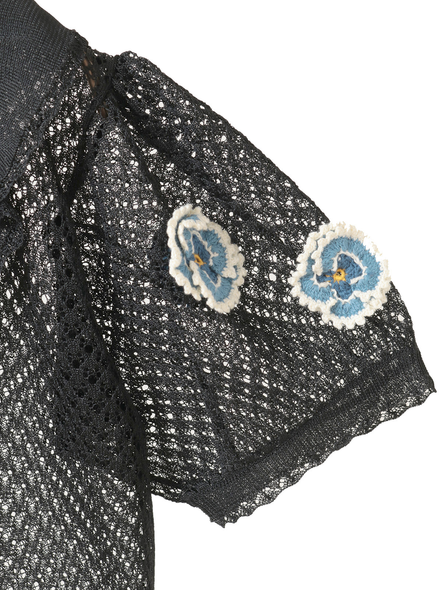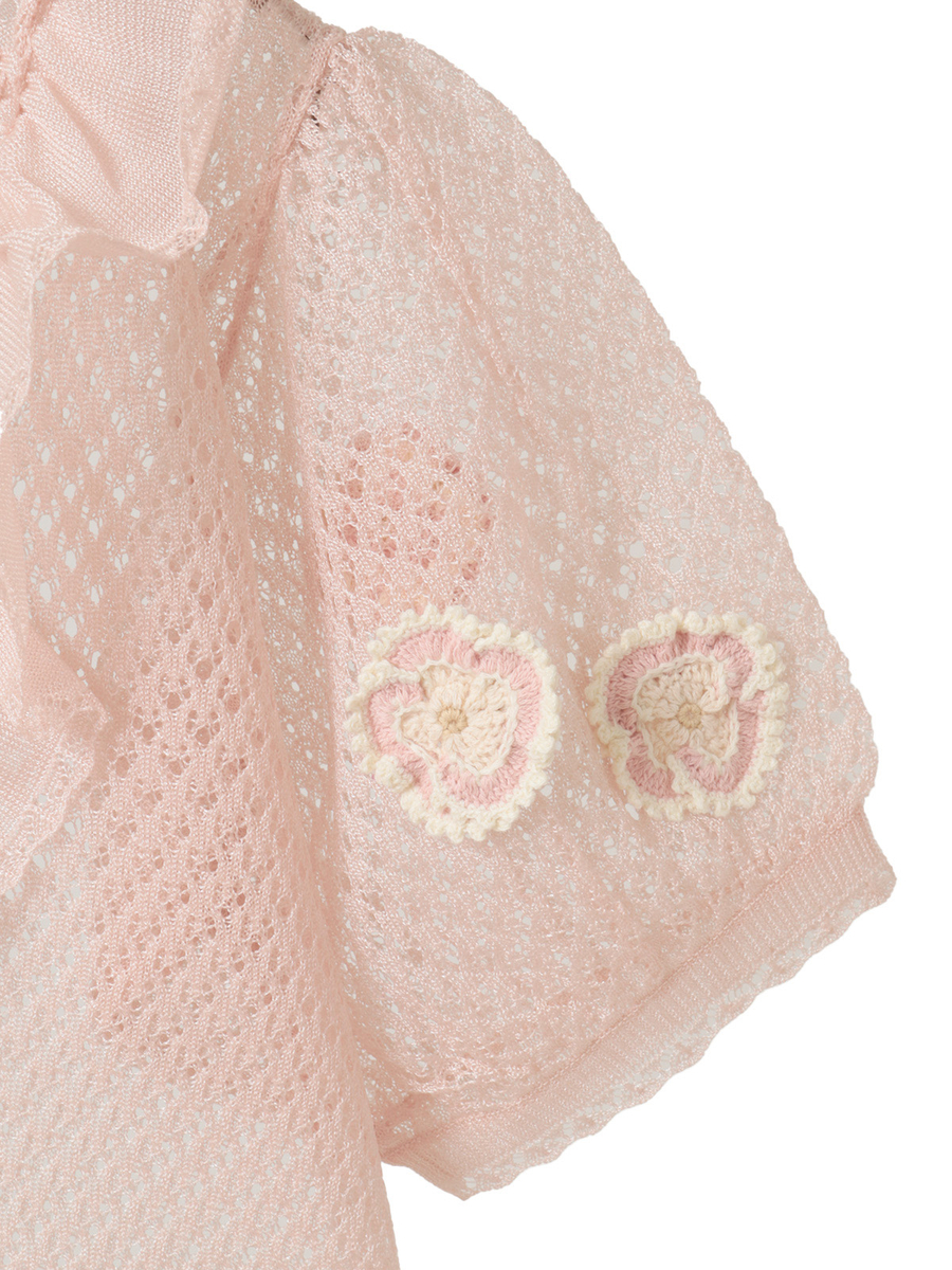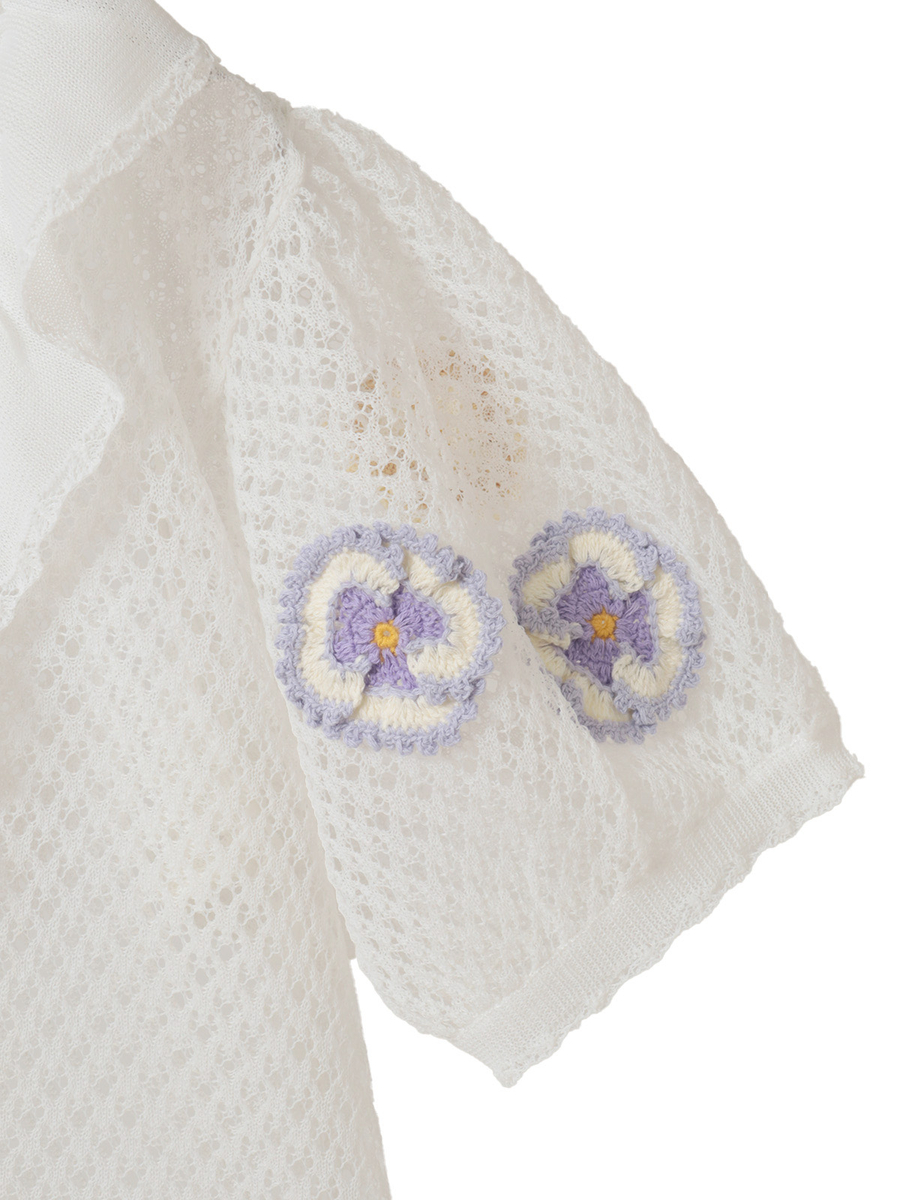 ふんわりとしたお袖には、パンジーのニットモチーフで飾り立てて華やかな仕上がりに。