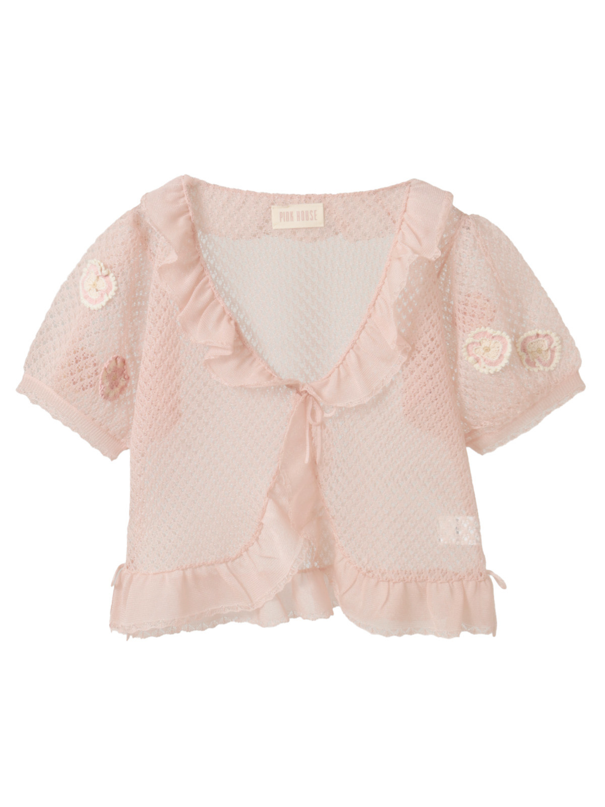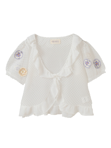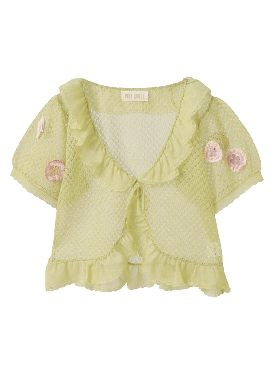 ナイロンとポリエステルの混紡糸をメッシュのような透かし模様で編み上げた清涼感たっぷりのニットボレロは、程よいフリル感とパフスリーブで可愛らしい仕上がりに。