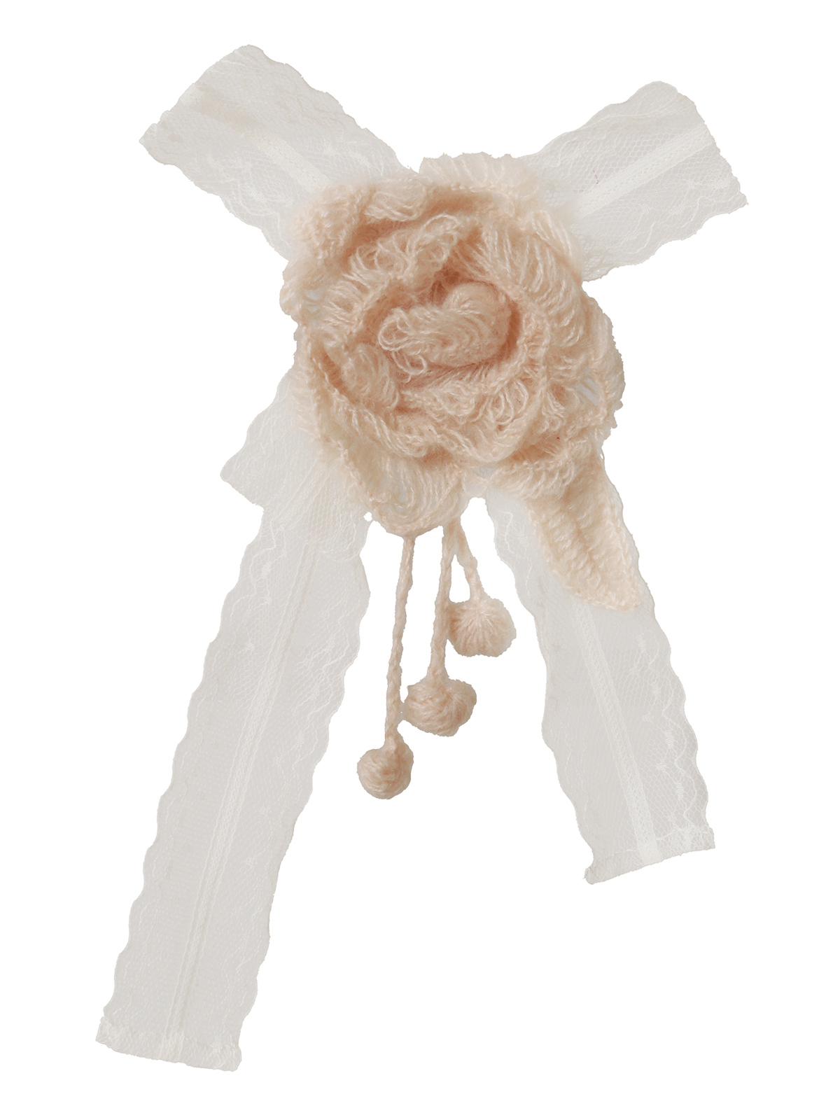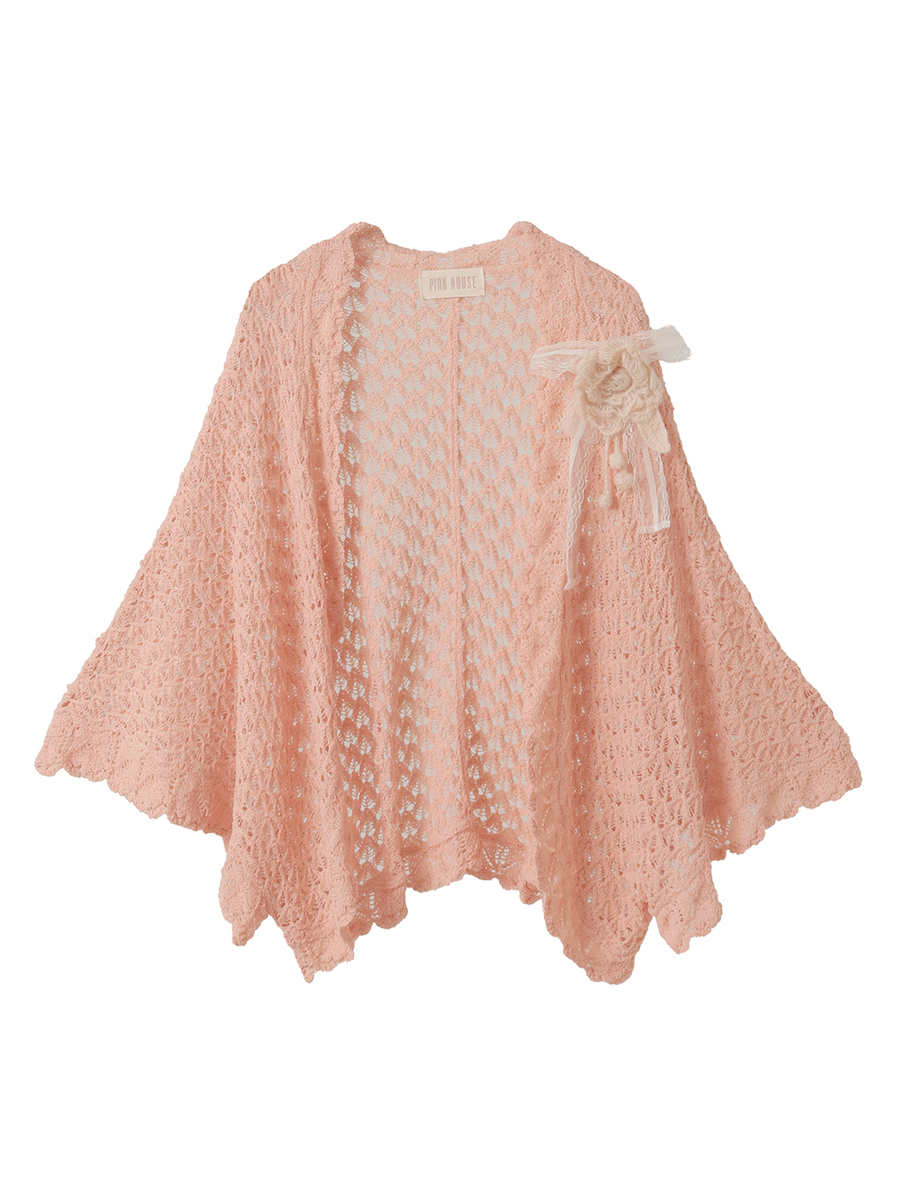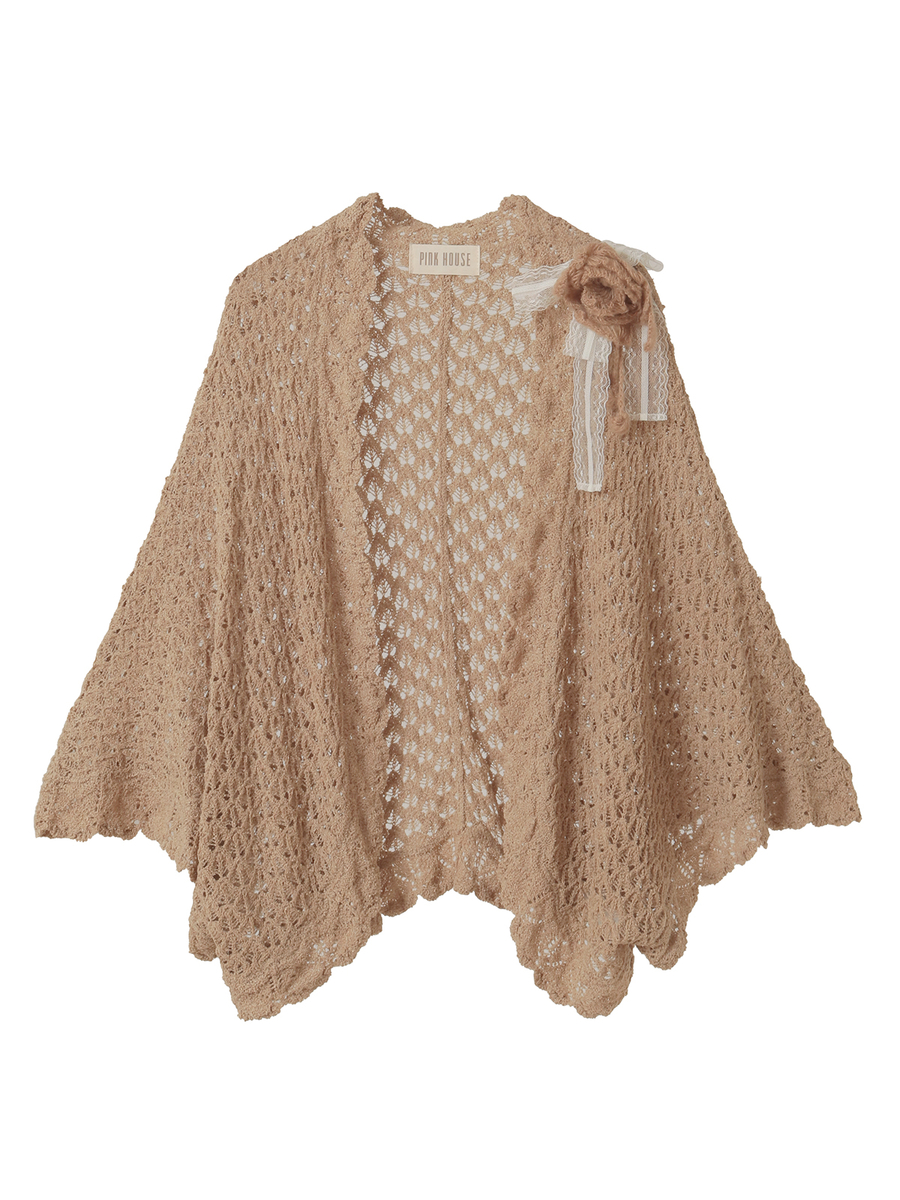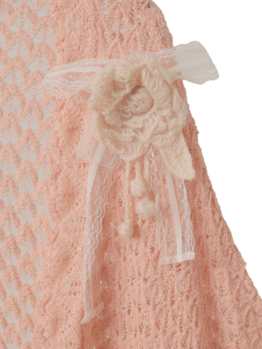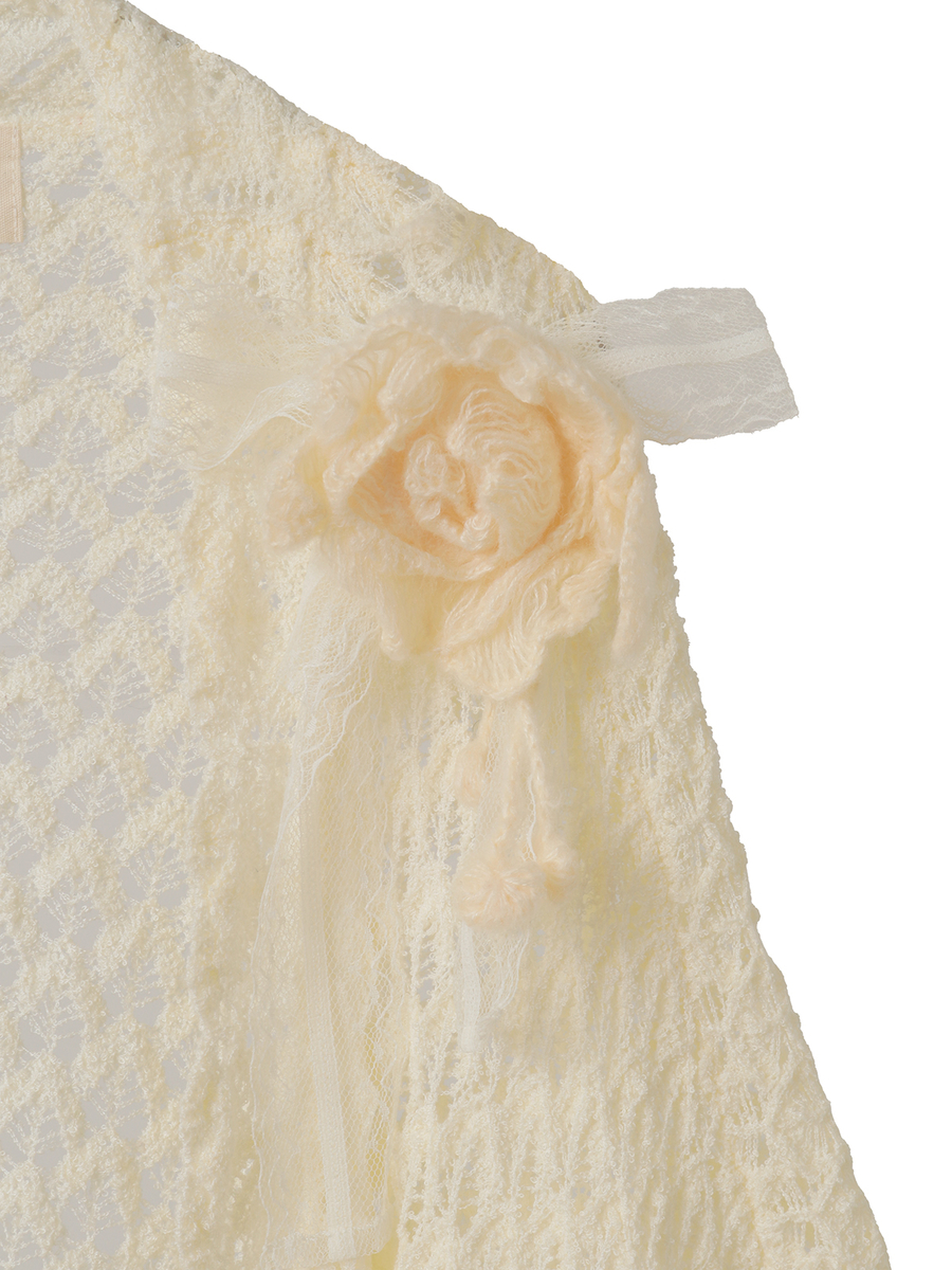 ふわふわのモヘアの糸で編んだ、ピオニーのお花をイメージしたお花のモチーフのコサージュが付いたお得感たっぷりな仕上がりに。