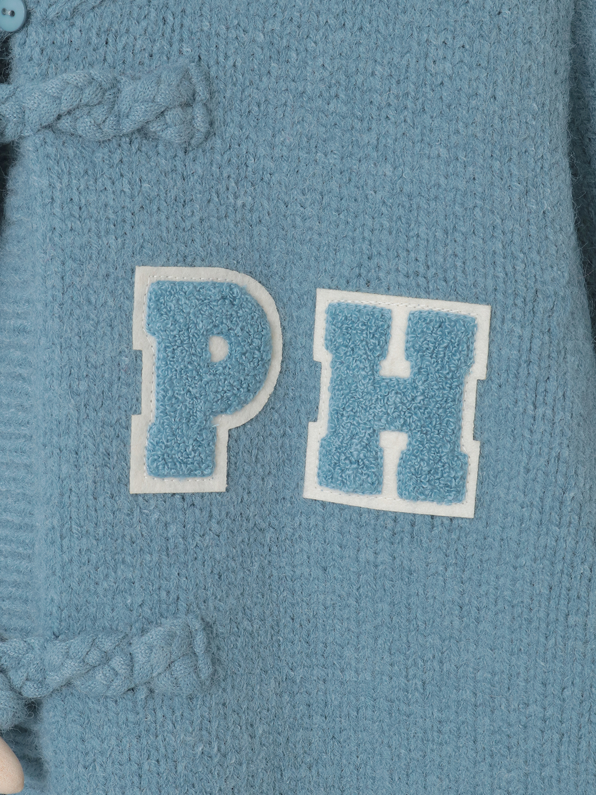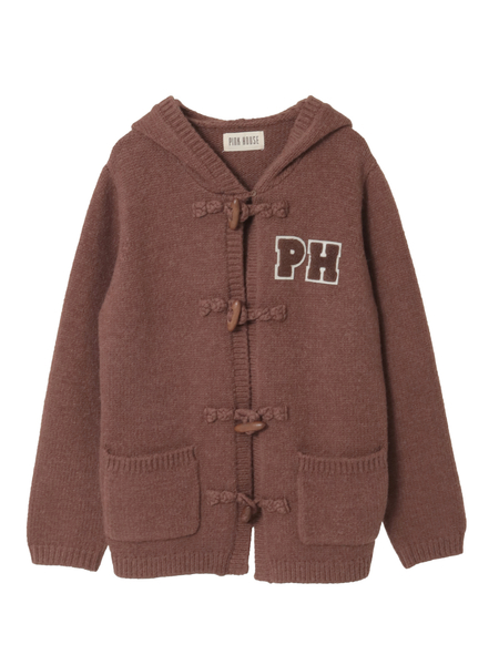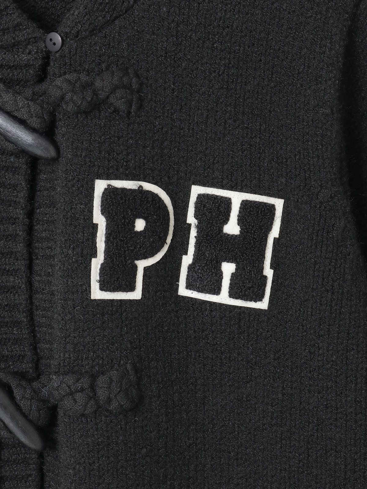 左胸にあしらったPHロゴのワッペンがワンポイントになったフード付きニットカーディガン。