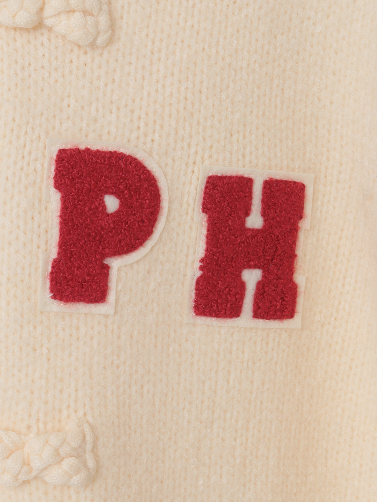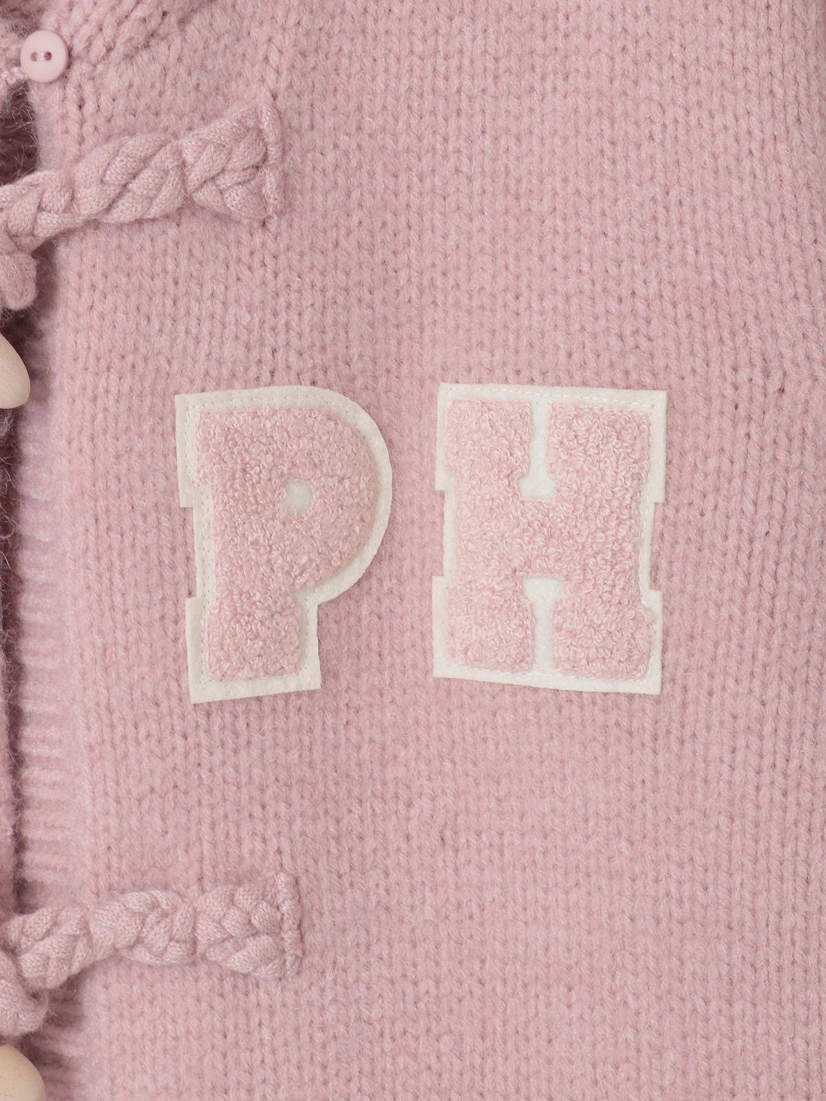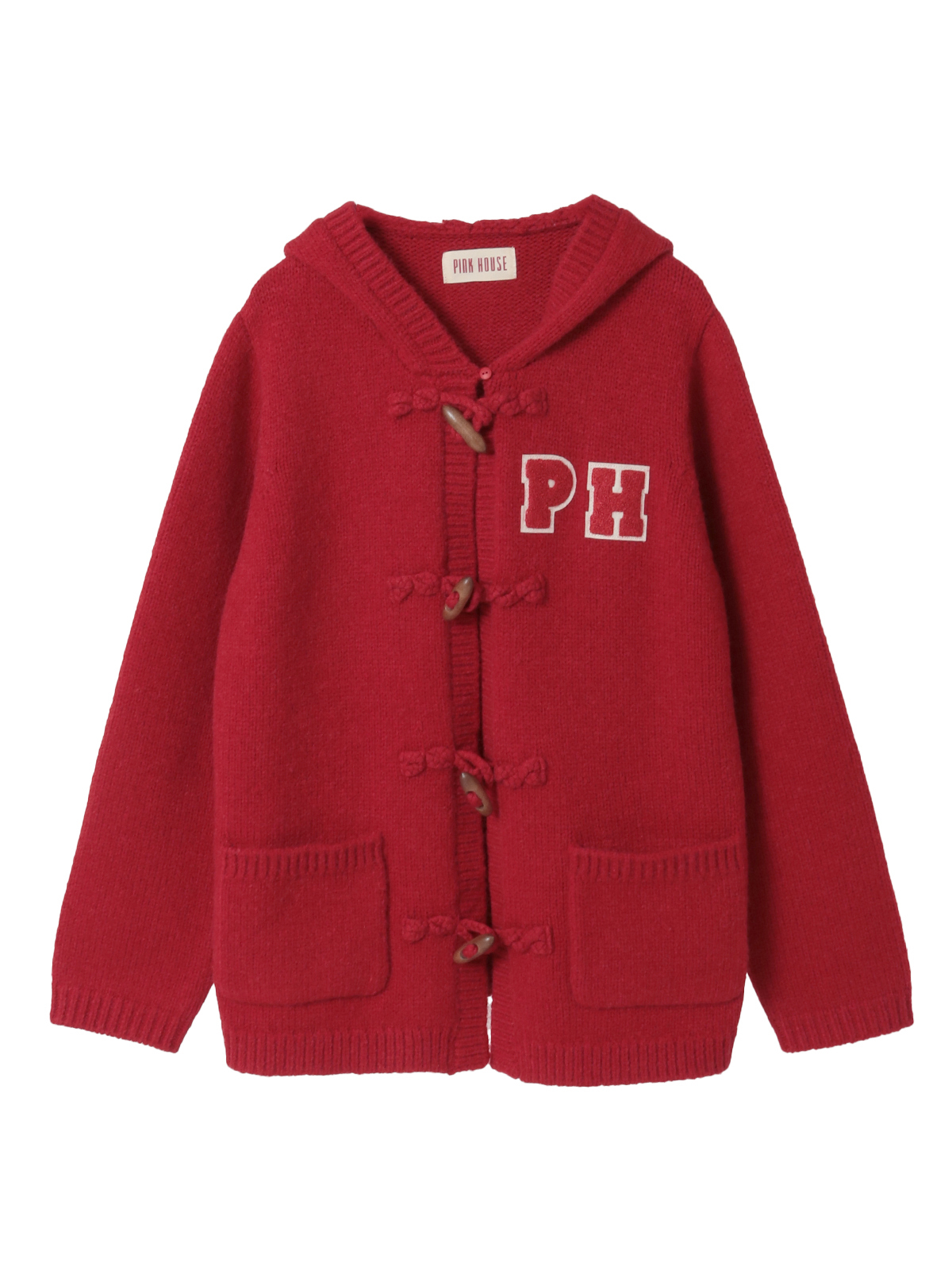 左胸にあしらったPHロゴのワッペンがワンポイントになったフード付きニットカーディガン。