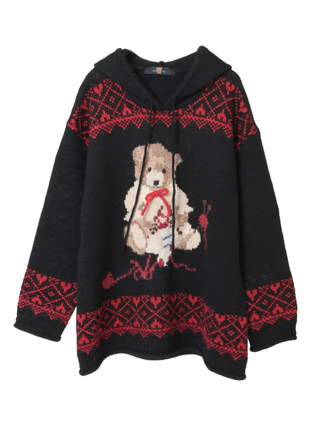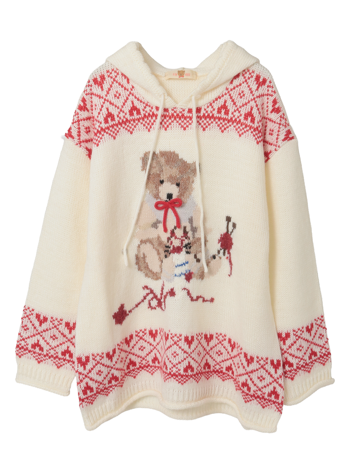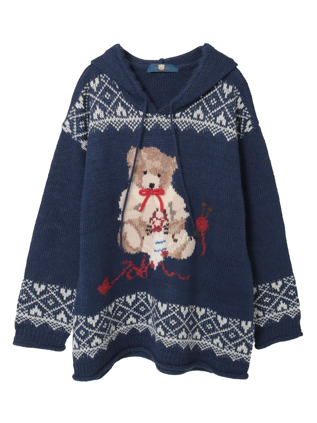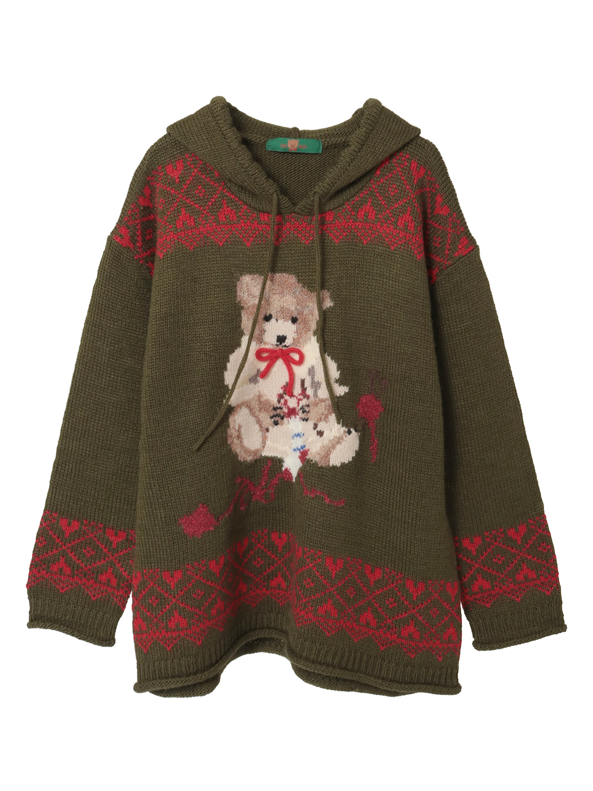 くまの編み込みを挟むように、ノルディック調の飾りのラインを首まわりと裾まわり、そして袖ぐちにあしらって。カールヘルムが雪柄なのに対し、ピンクハウスはなんとハート柄でとても可愛らしい仕上がりに。
