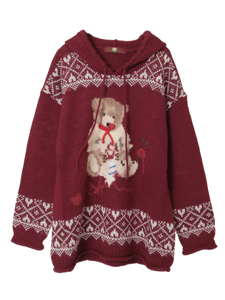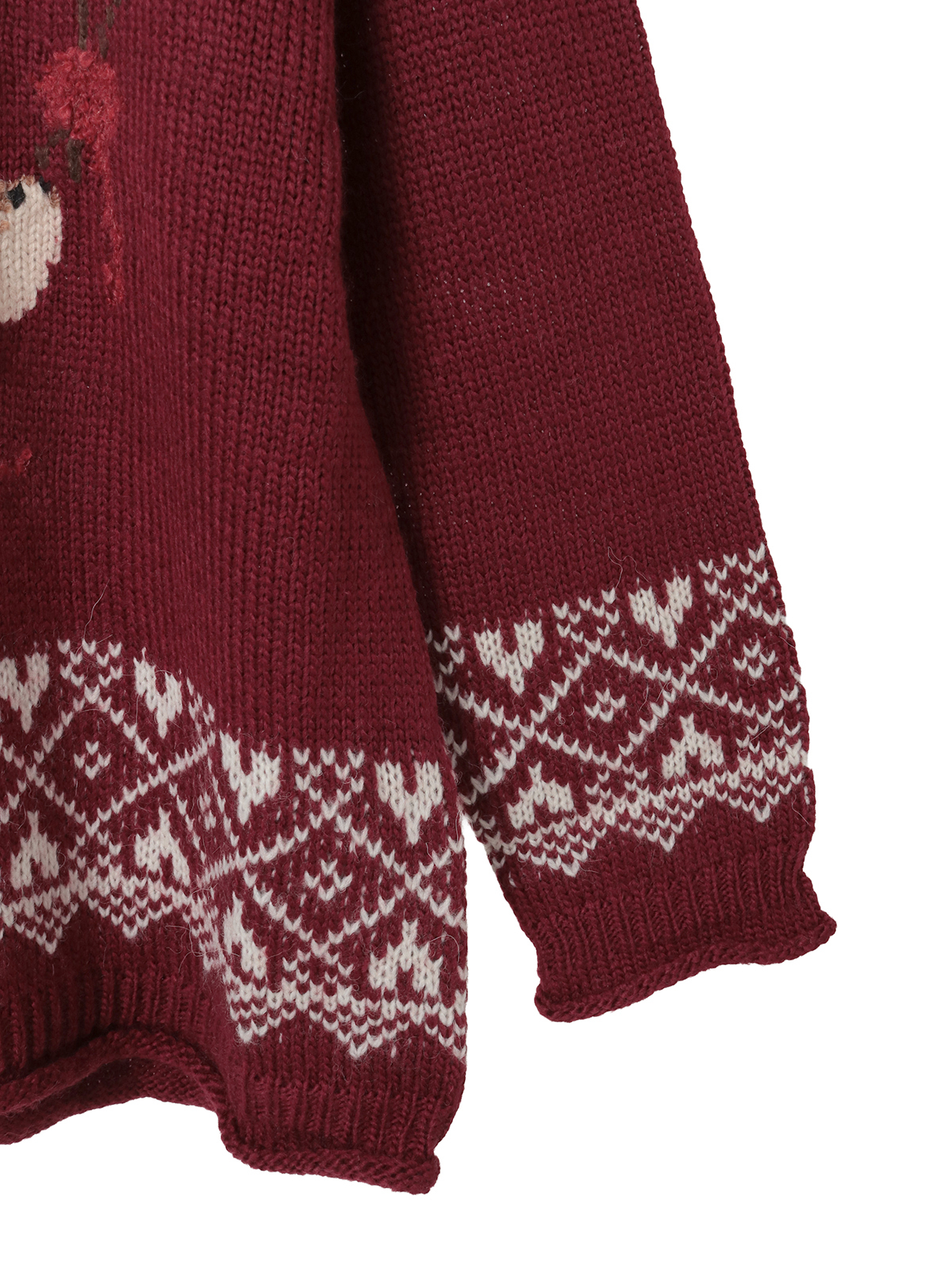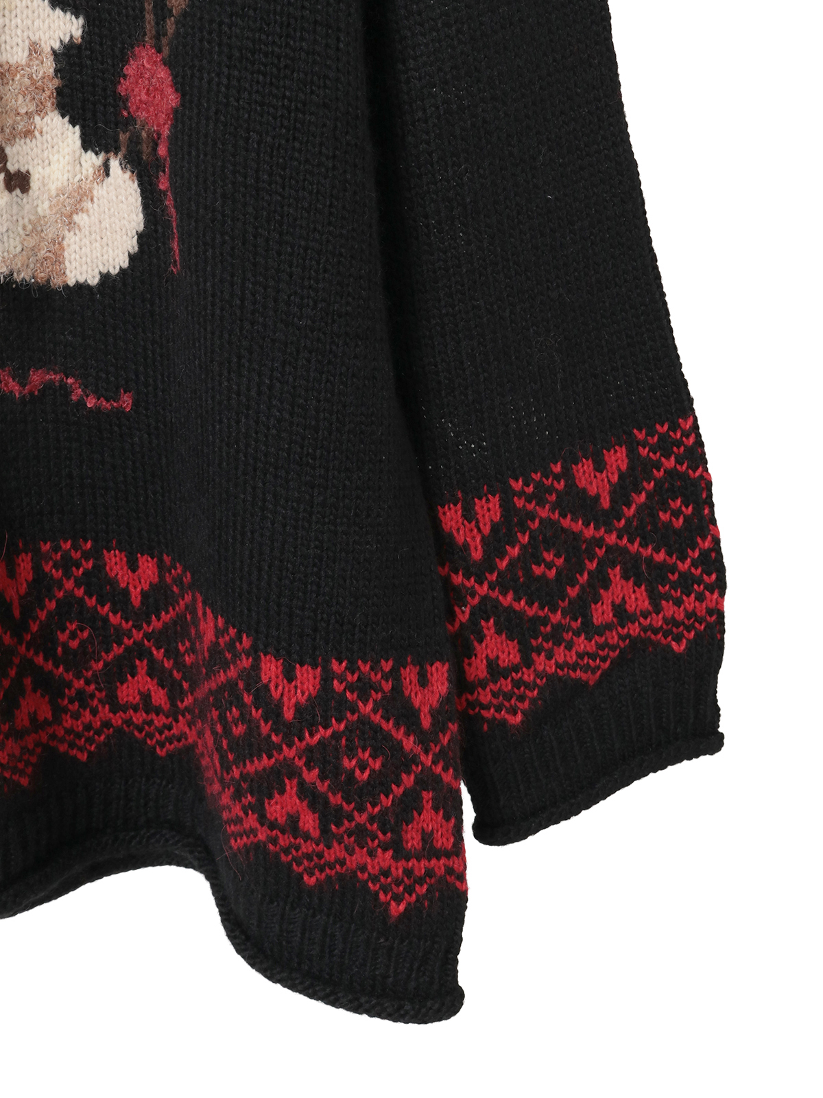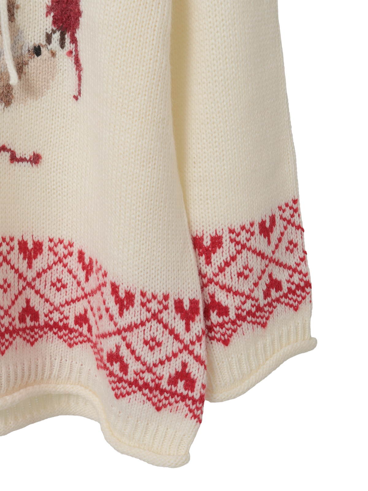 くまの編み込みを挟むように、ノルディック調の飾りのラインを首まわりと裾まわり、そして袖ぐちにあしらって。カールヘルムが雪柄なのに対し、ピンクハウスはなんとハート柄でとても可愛らしい仕上がりに。