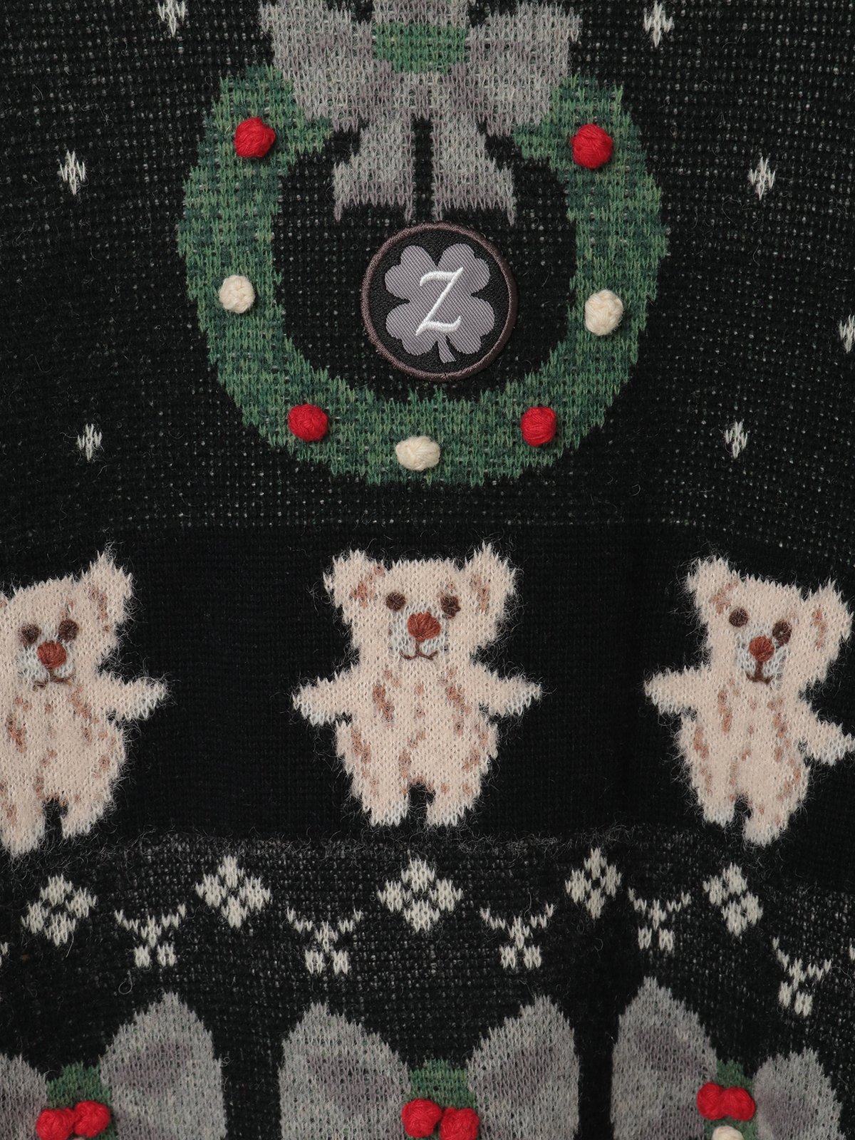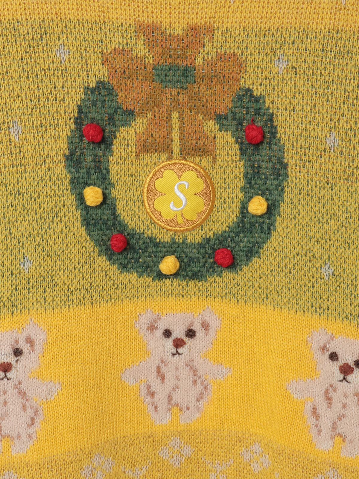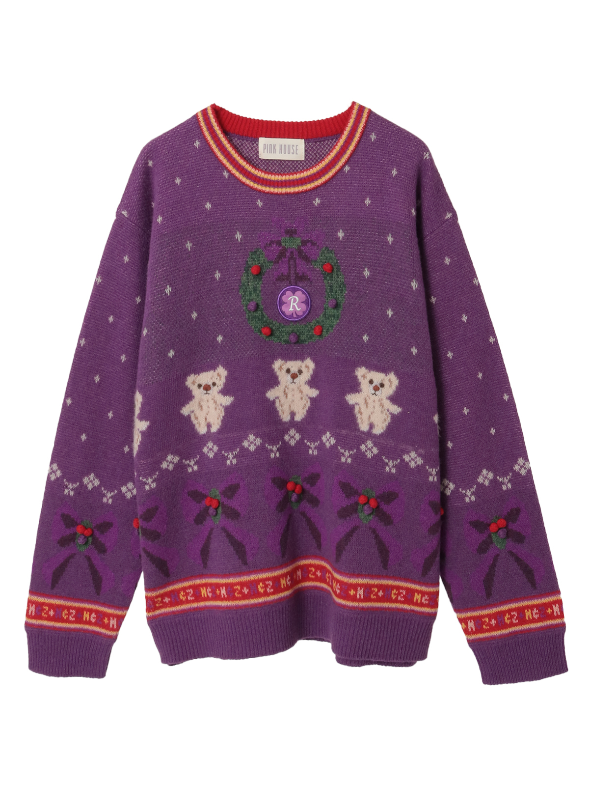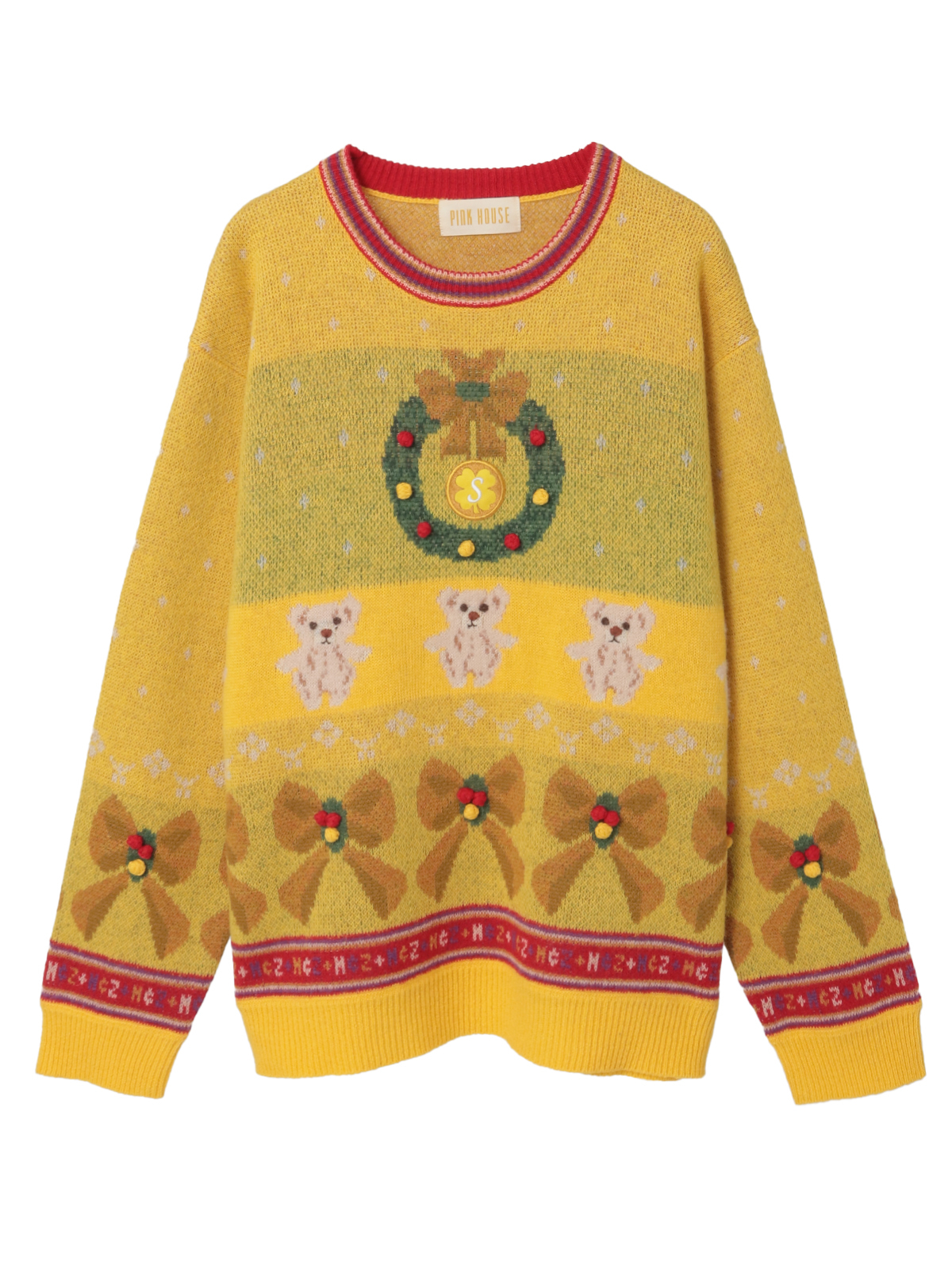 リースやリボンの飾りなど、これからのホリデーシーズンにピッタリなニット。