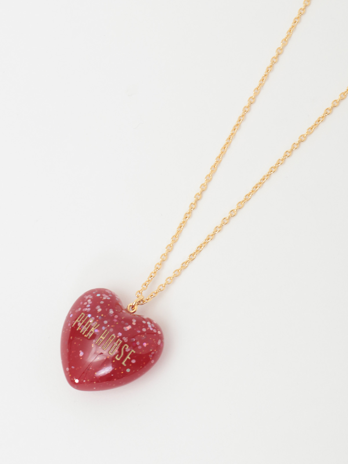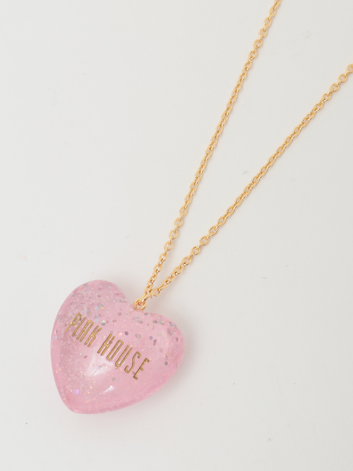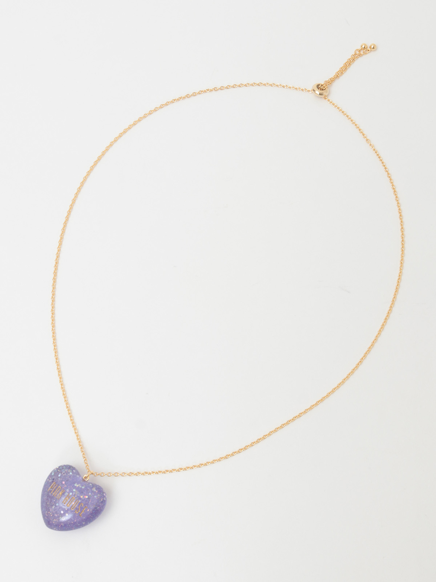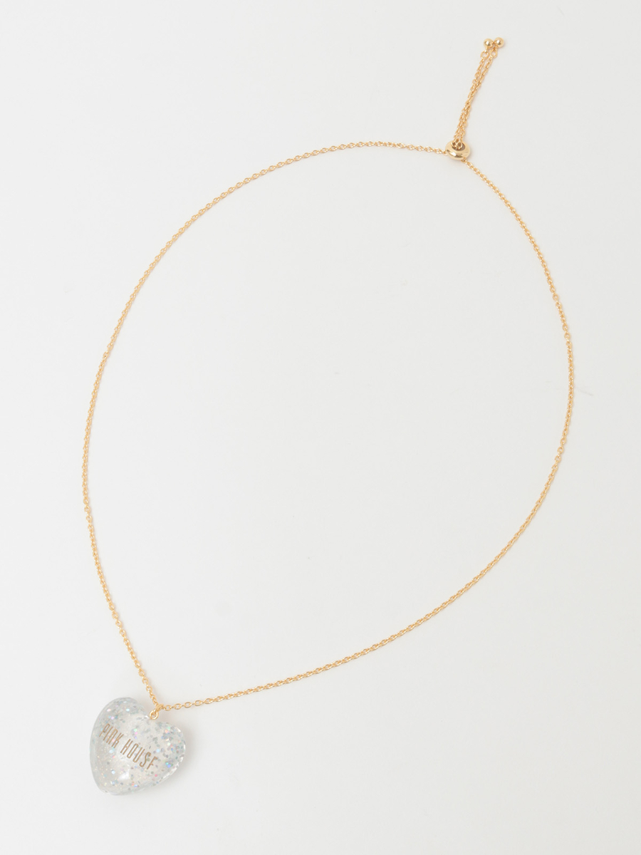 ころんとした立体的なハートモチーフはクリアな透明感があって、さらにキラキラと光るオーロララメ入りでインパクトたっぷりな仕上がりに。PINK HOUSEのロゴもしっかり刻まれています。