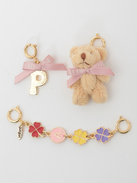 ちいさなミニミニテディのぬいぐるみチャームと、Pロゴのチャーム、そしてクローバーモチーフとメンバーのイニシャルモチーフを繋ぎ合わせたチャームをセットに。
