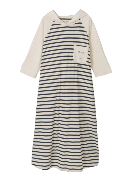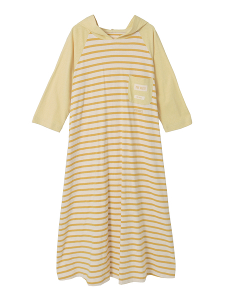 リサイクルコットンを使用した柔らかなテレコボーダーを身ごろに使用したフード付きワンピース。