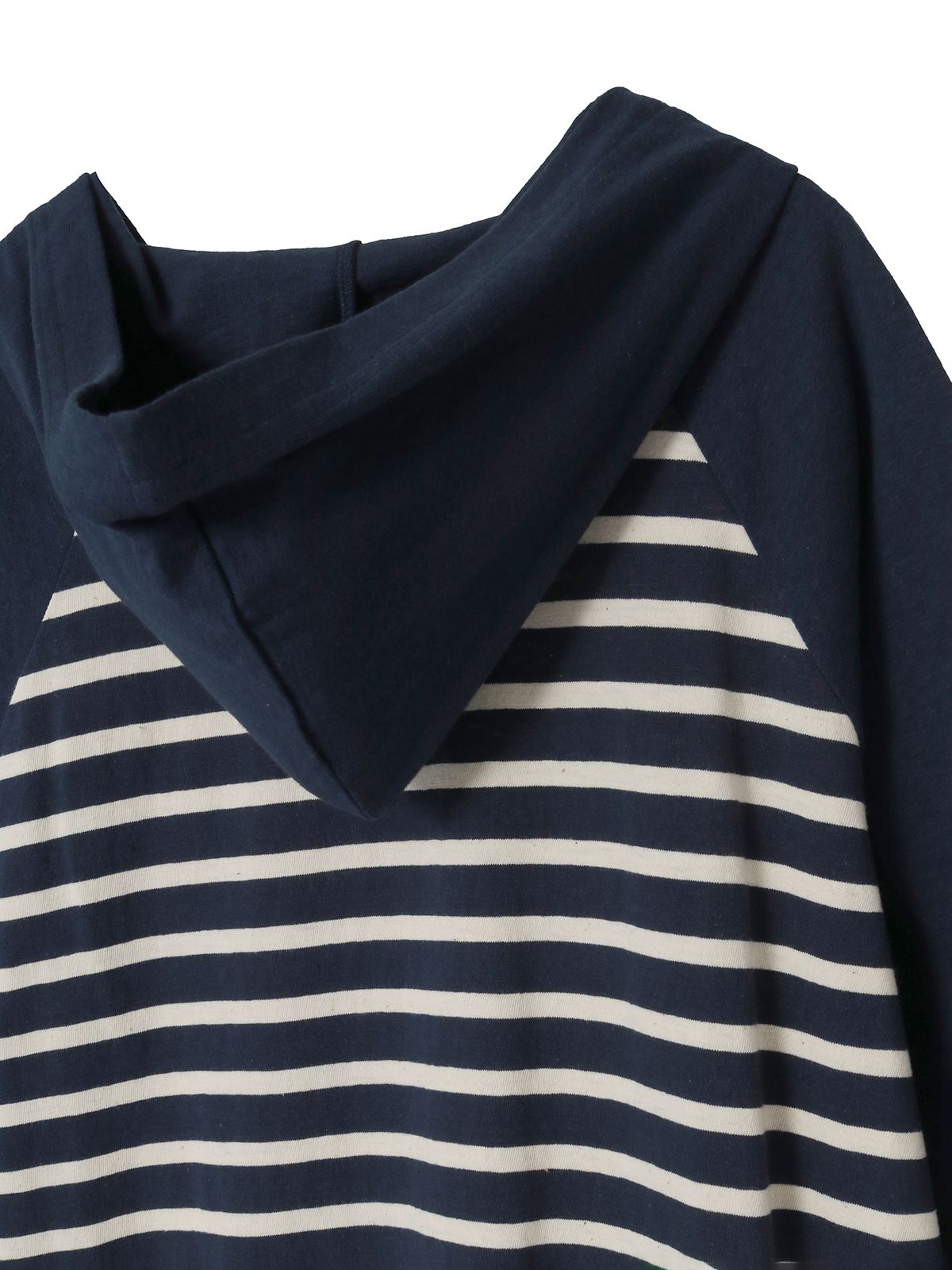 ラグランスリーブの袖とフードのところには、無地のラフィ天竺を使用。