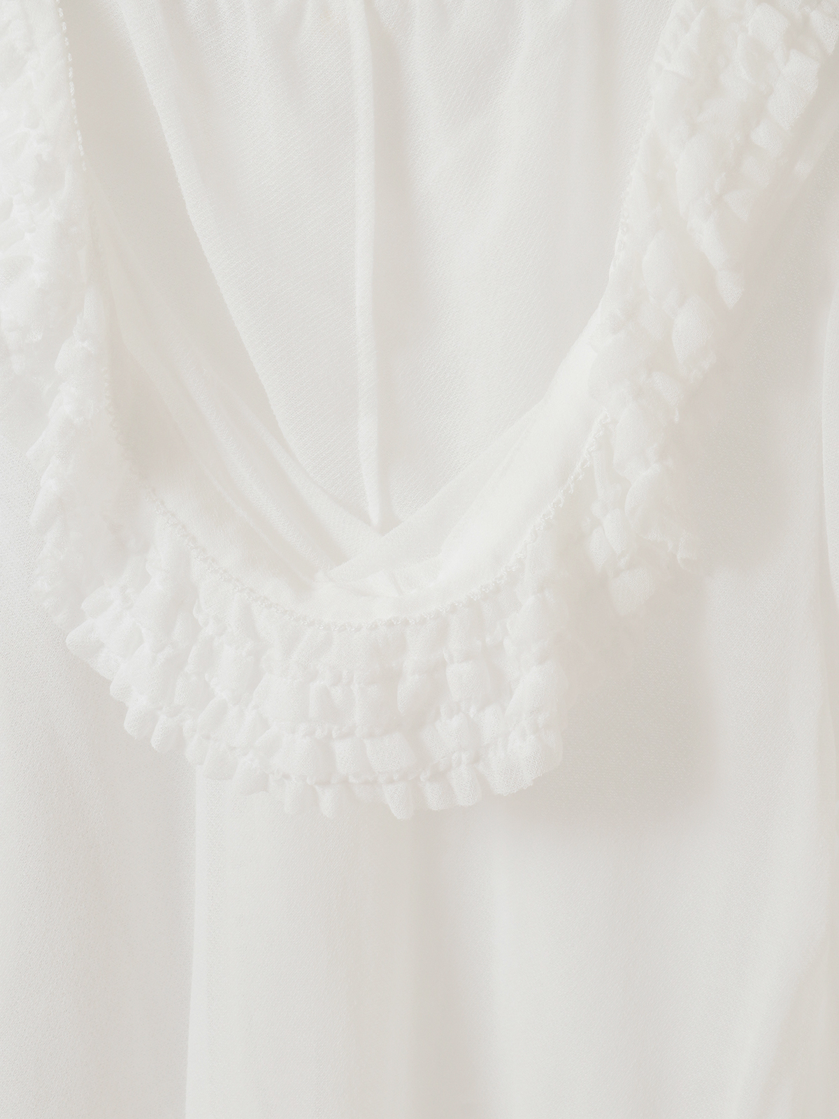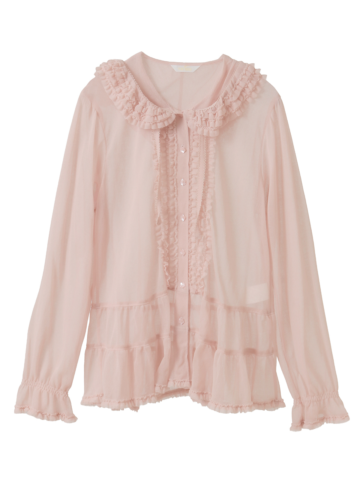 フロントの前たてまわりや、フードまわりにフリルをあしらって可愛らしくピンクハウスらしい仕上がりに。裾まわりにも切り替えを入れてふんわり広がるレイヤードなシルエットに。