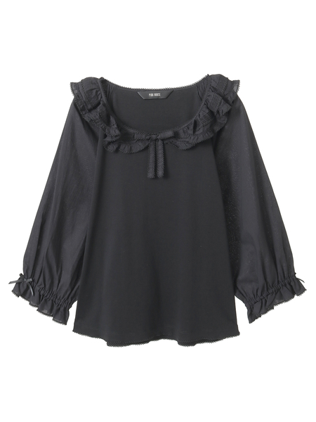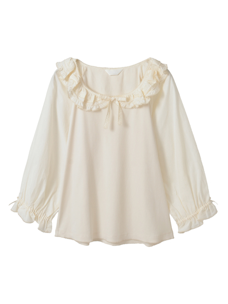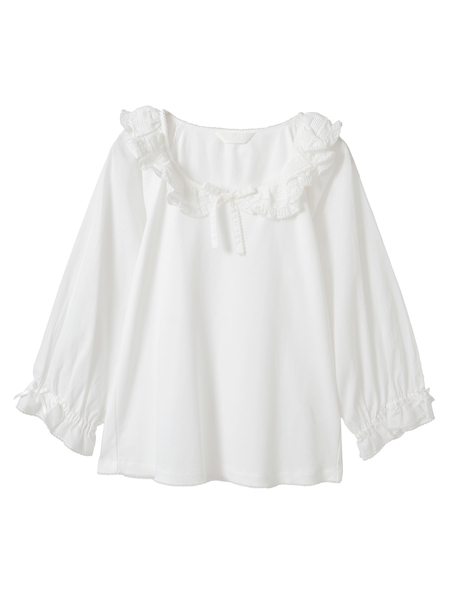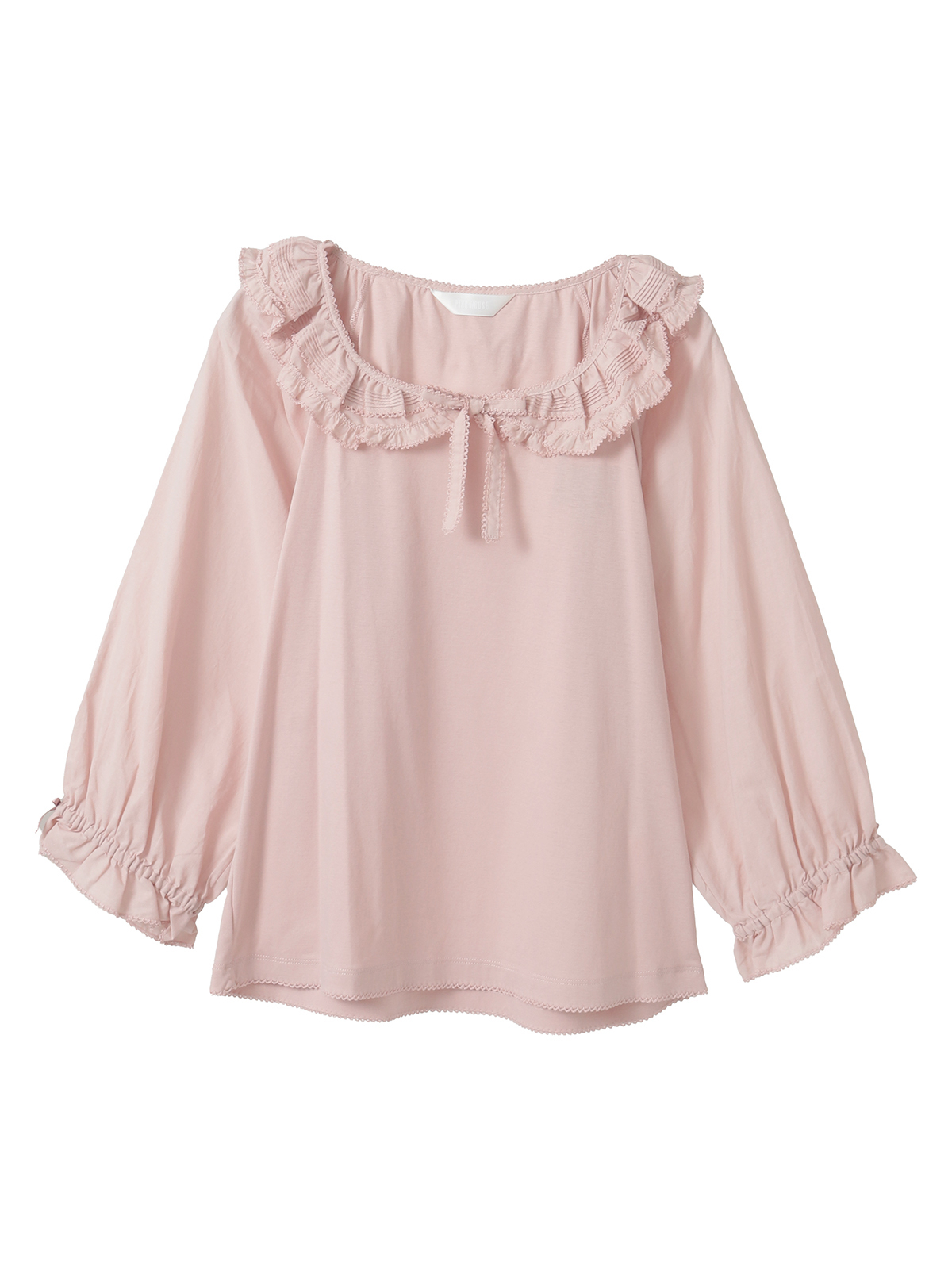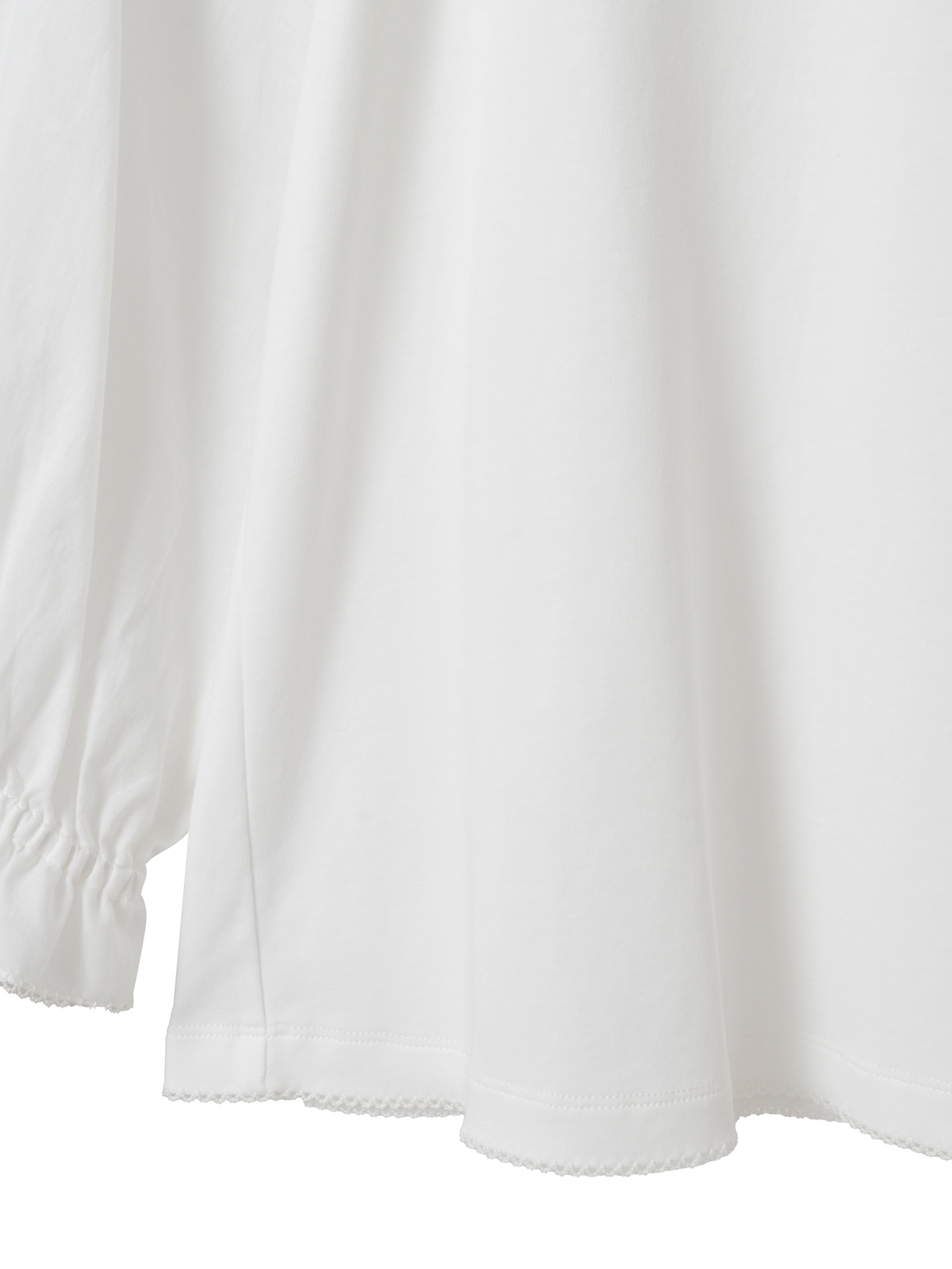 フリル使いが可愛らしい綿ローンの襟の付いたカットソー。身ごろはに60/-の細番手のスムース素材を使用しているので、滑らかで肌ざわりよく着心地もやわらか。