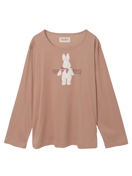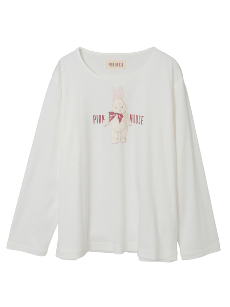 「バラ園うさぎプリント」に描かれた、柔らかなバニラ色の毛並みをしたうさぎのプリントをフロントにあしらった長袖カットソー。