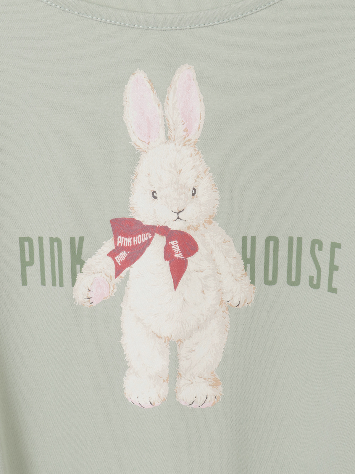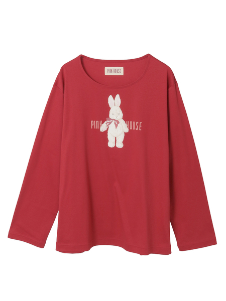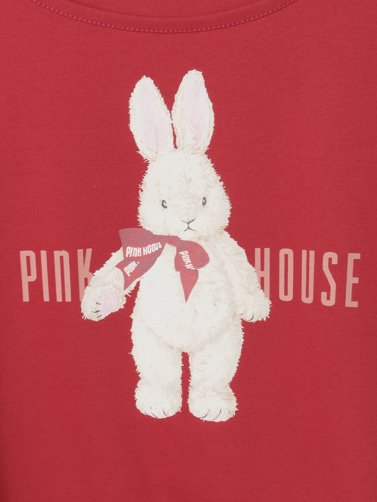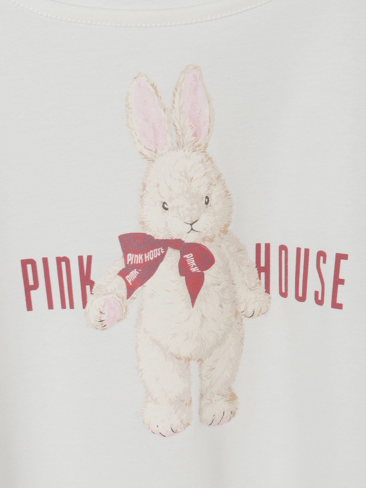 ロゴの入った真っ赤なリボンでおめかししたうさぎたちのまわりにはPINK HOUSEのロゴプリントも添えてにぎやかに。