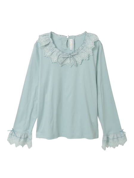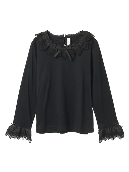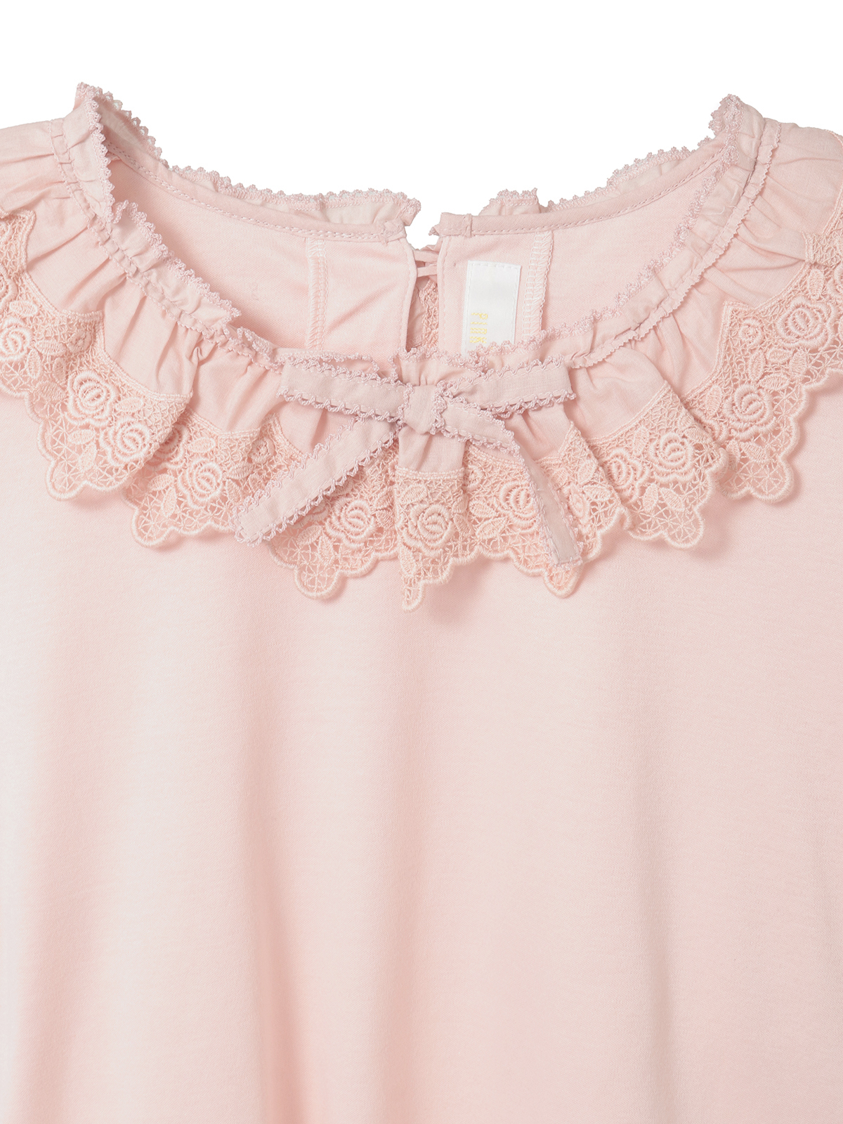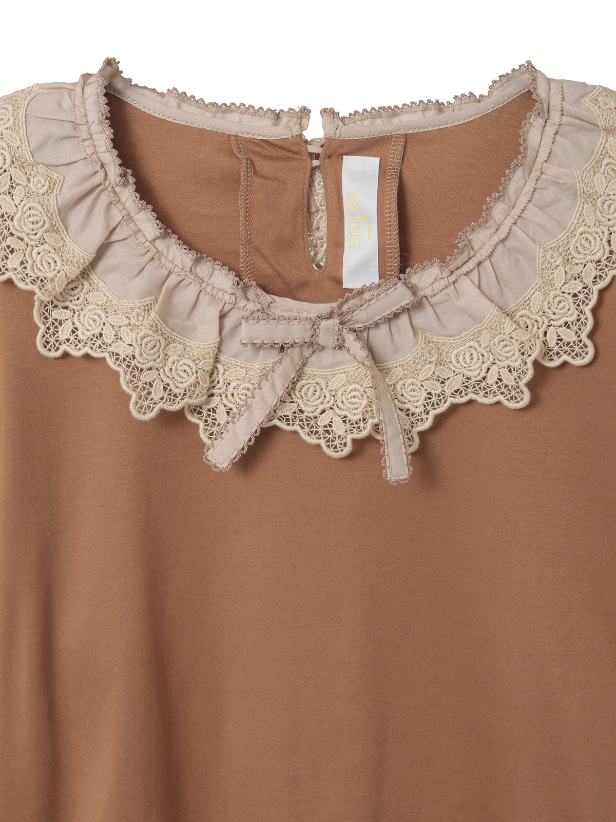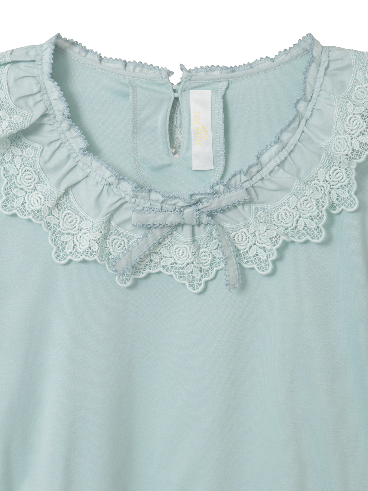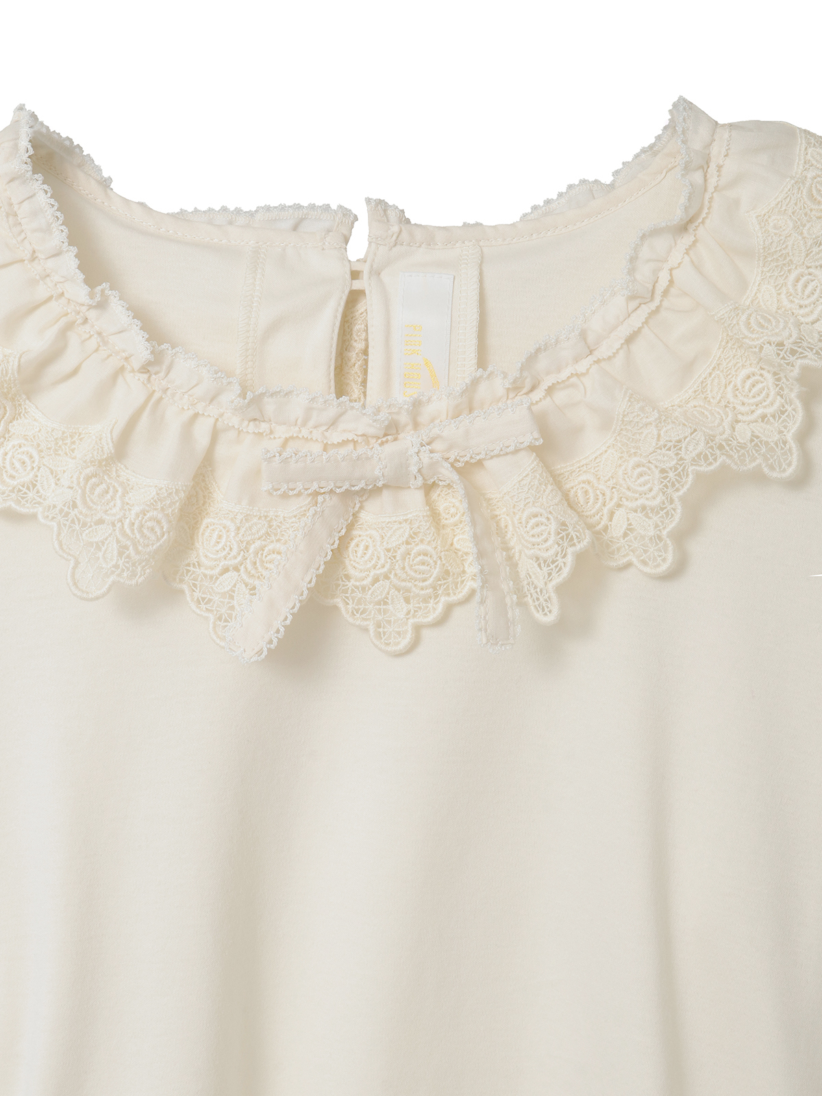 首まわりにフリル襟のようにあしらって華やかな仕上がりに。首もとにはリボンモチーフを添えてアクセントに。