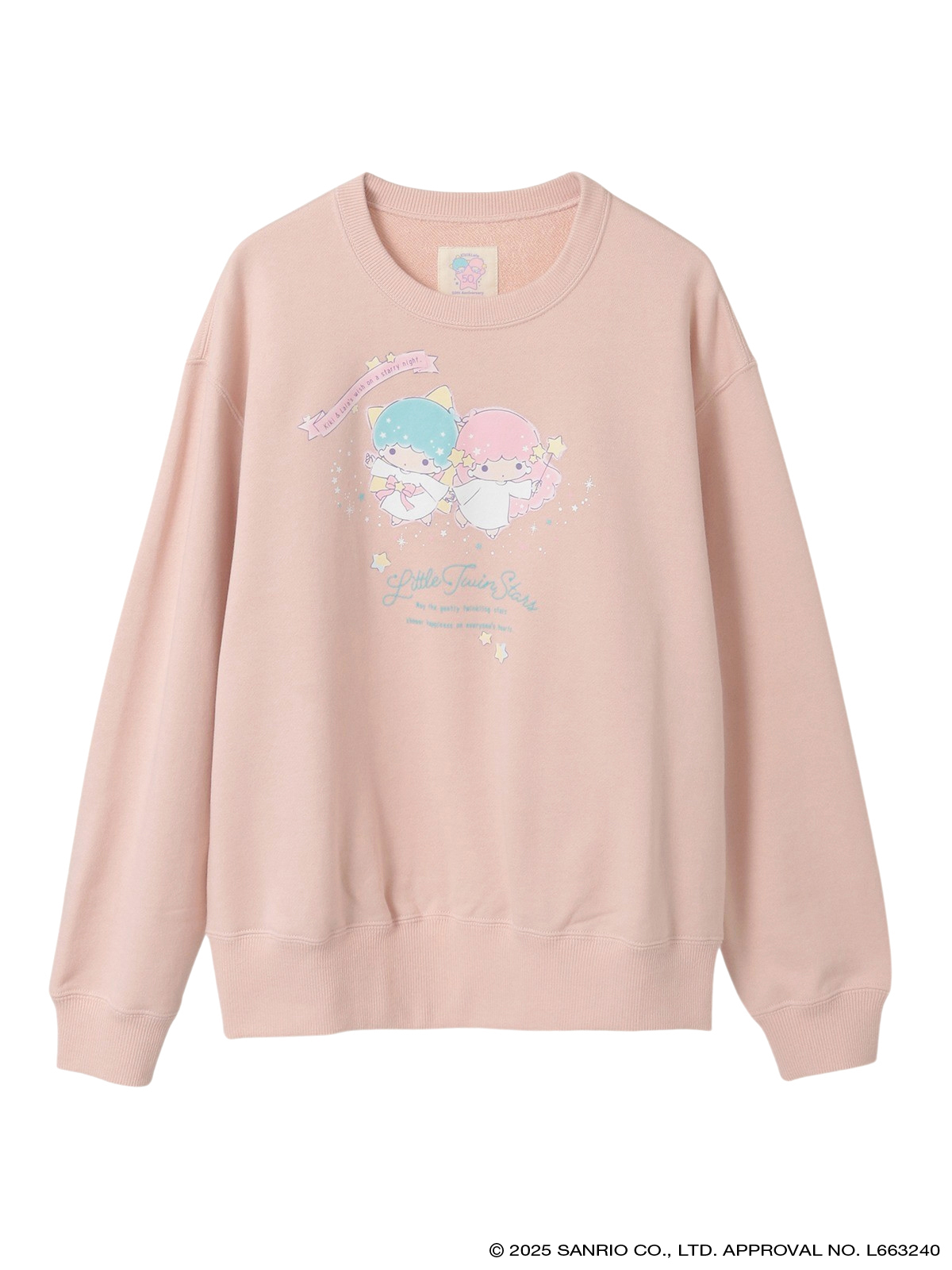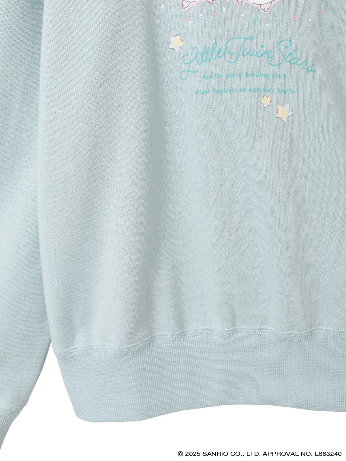 「A Starry Night Wishプリント」から、キラキラと幸せの星を降らすように空に瞬くリトルツインスターズ(キキ&ララ)のアートをピックアップ、フロントに大きくプリントしたトレーナー。