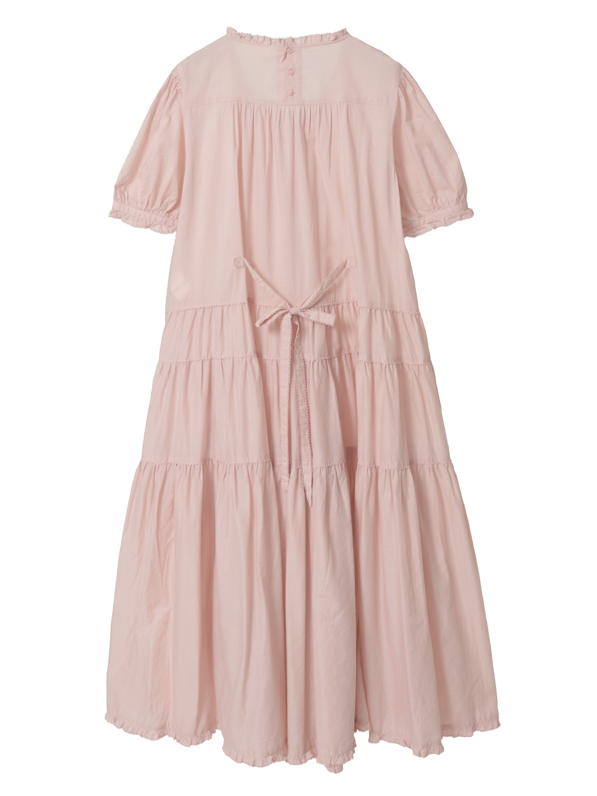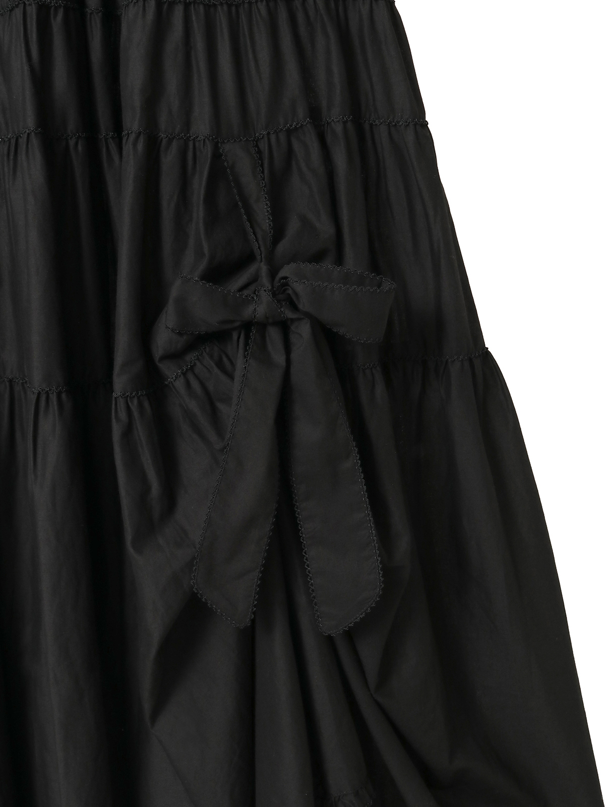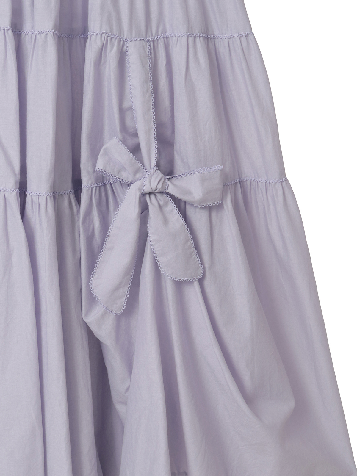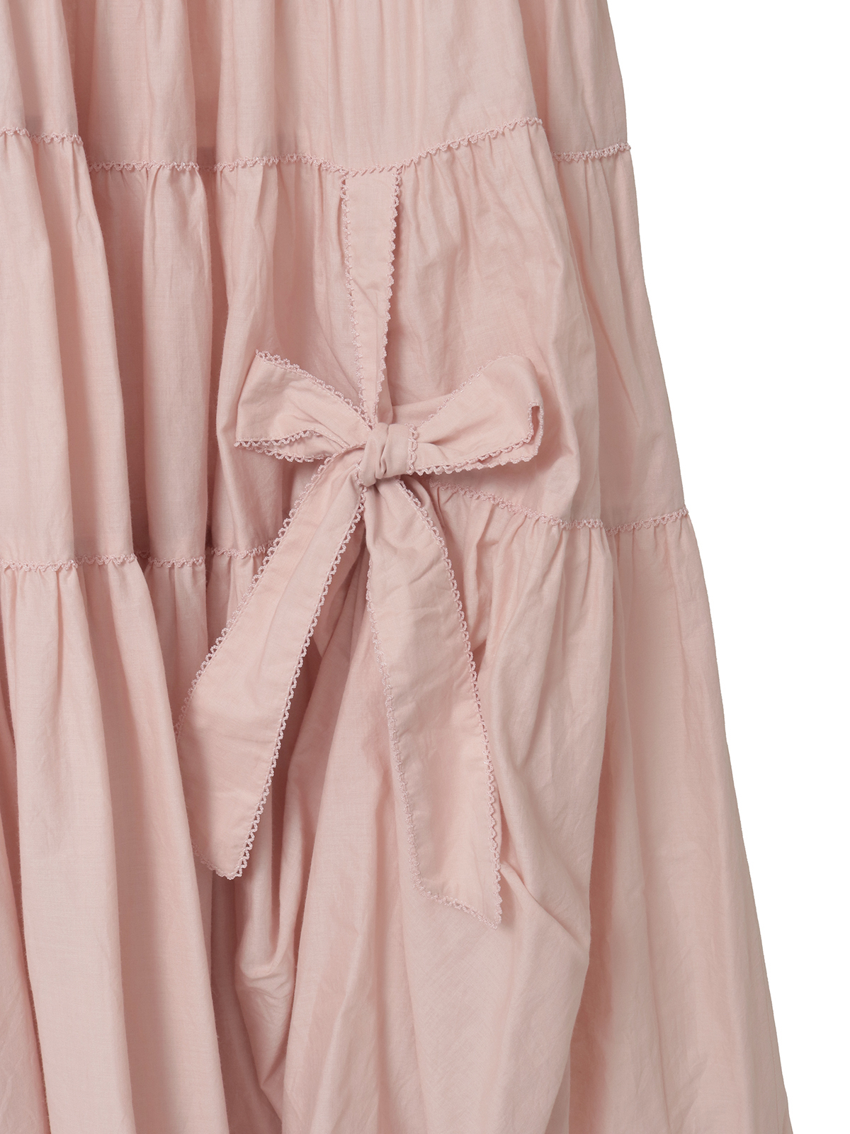 ウエストあたりから切り替えの入ったティアードシルエットのロングワンピースは、なかにペチコートやプリントのスカートなどを重ねてリボンのところでたくし上げてエプロンドレスのような着こなしもお楽しみいただけます。