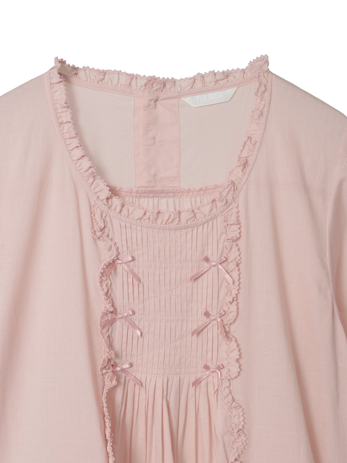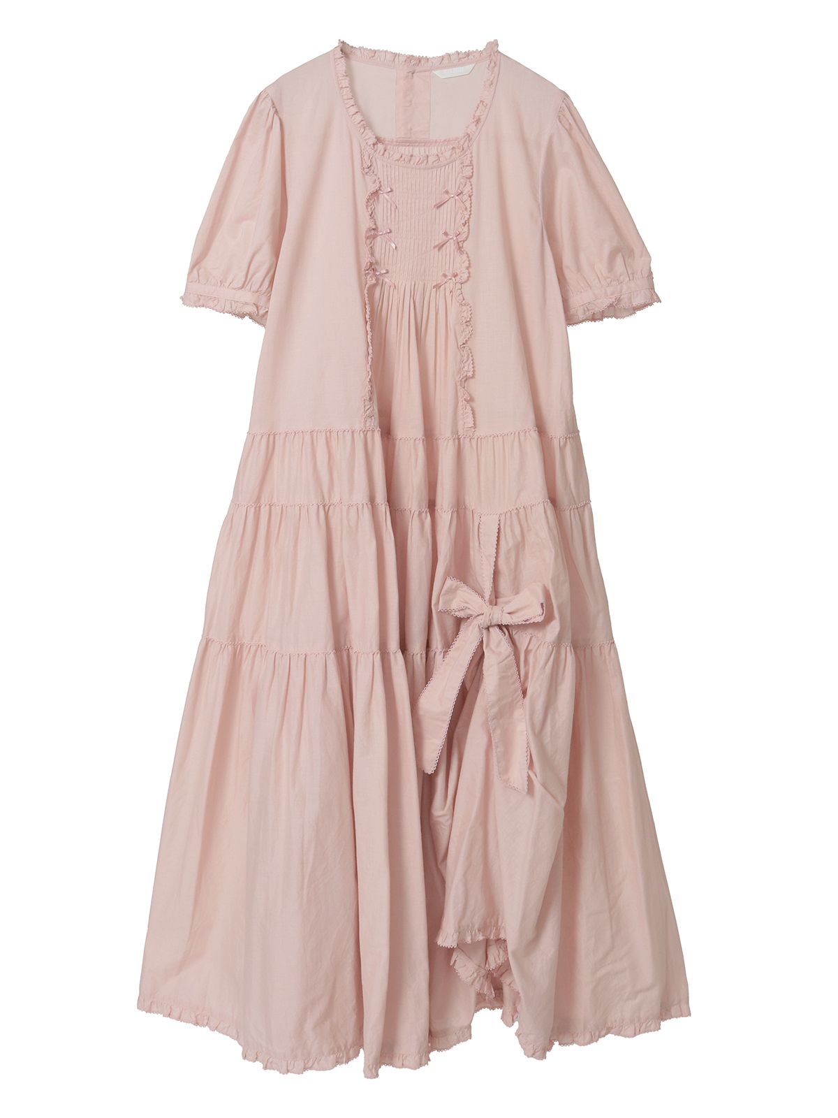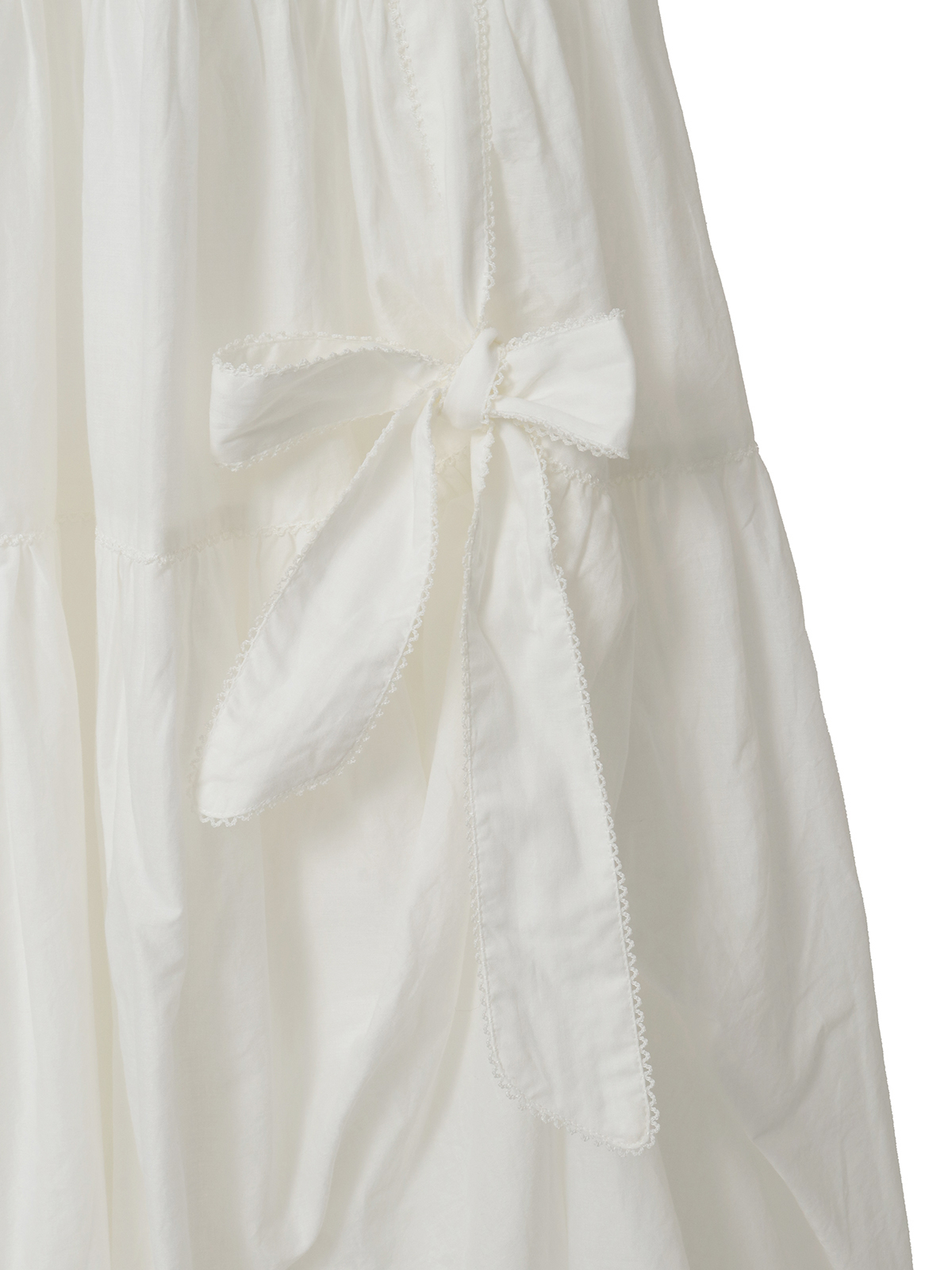 レイヤードスタイルが楽しめる、左サイドにたくし上げリボンの付いた綿ローンのワンピース。