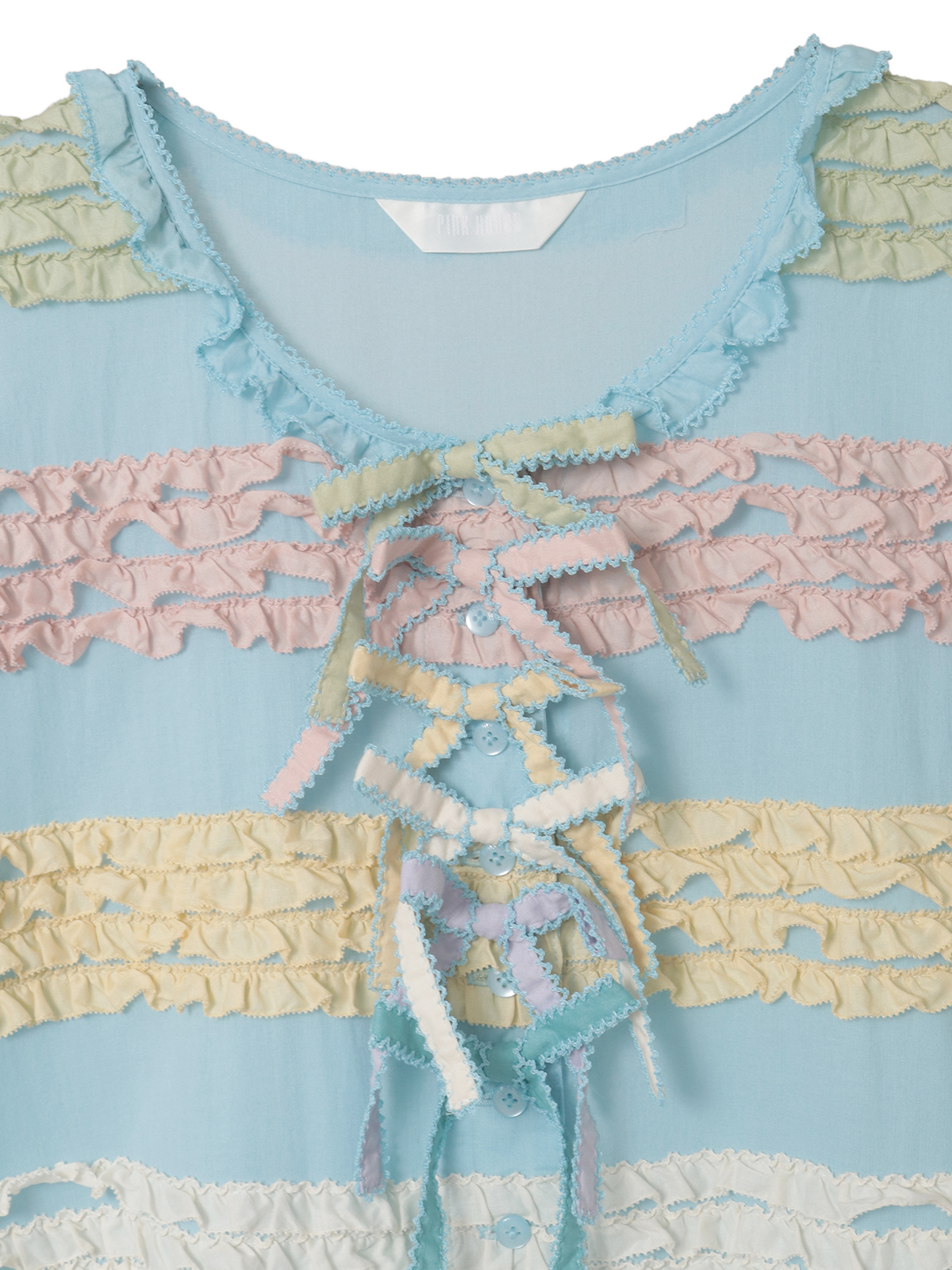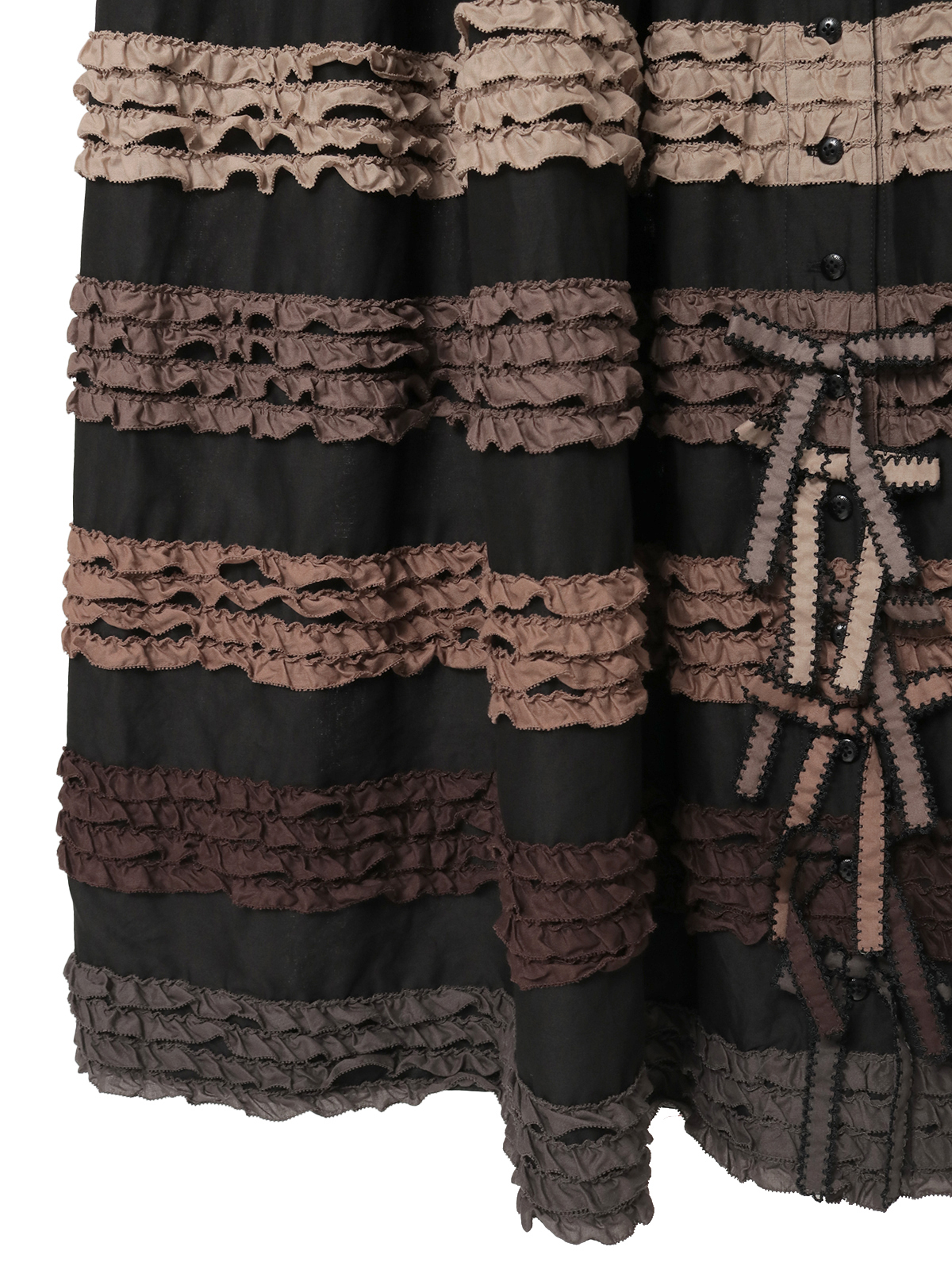 首まわりと裾まわりに並べたリボンモチーフは、それぞれフリルにあしらったカラーのものをセレクト、縦のラインに飾り立てて華やかに。