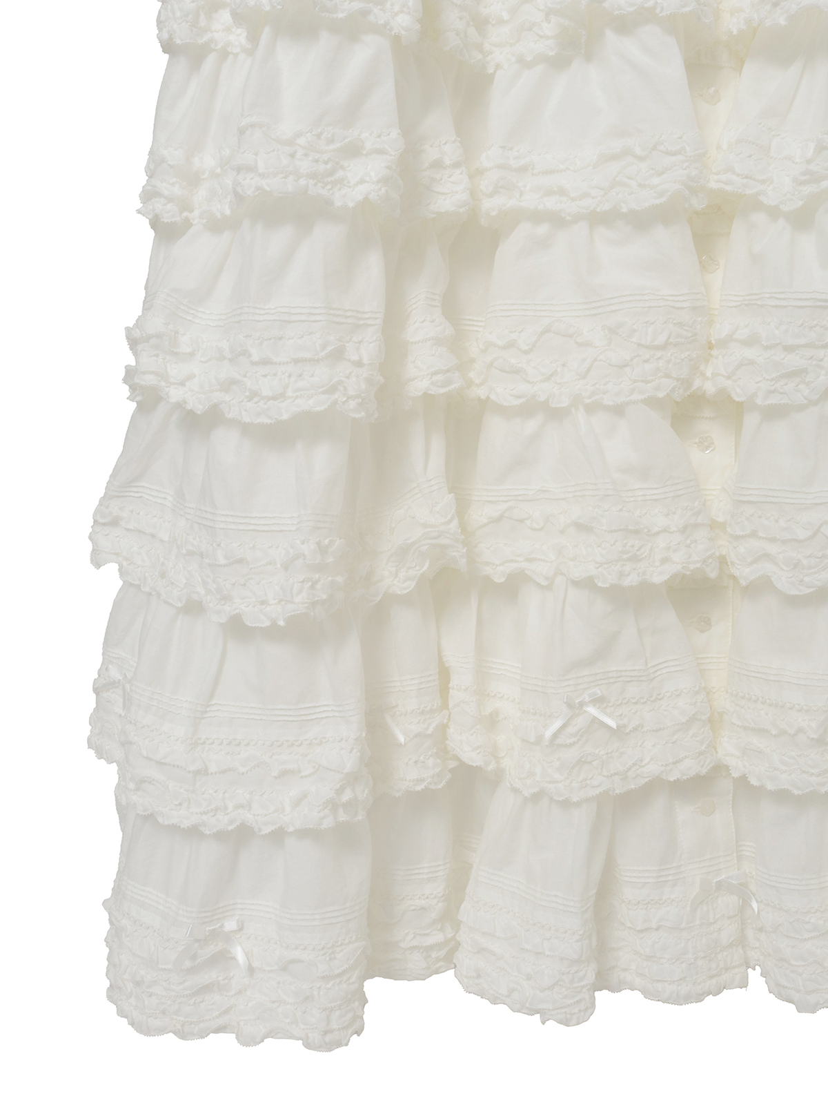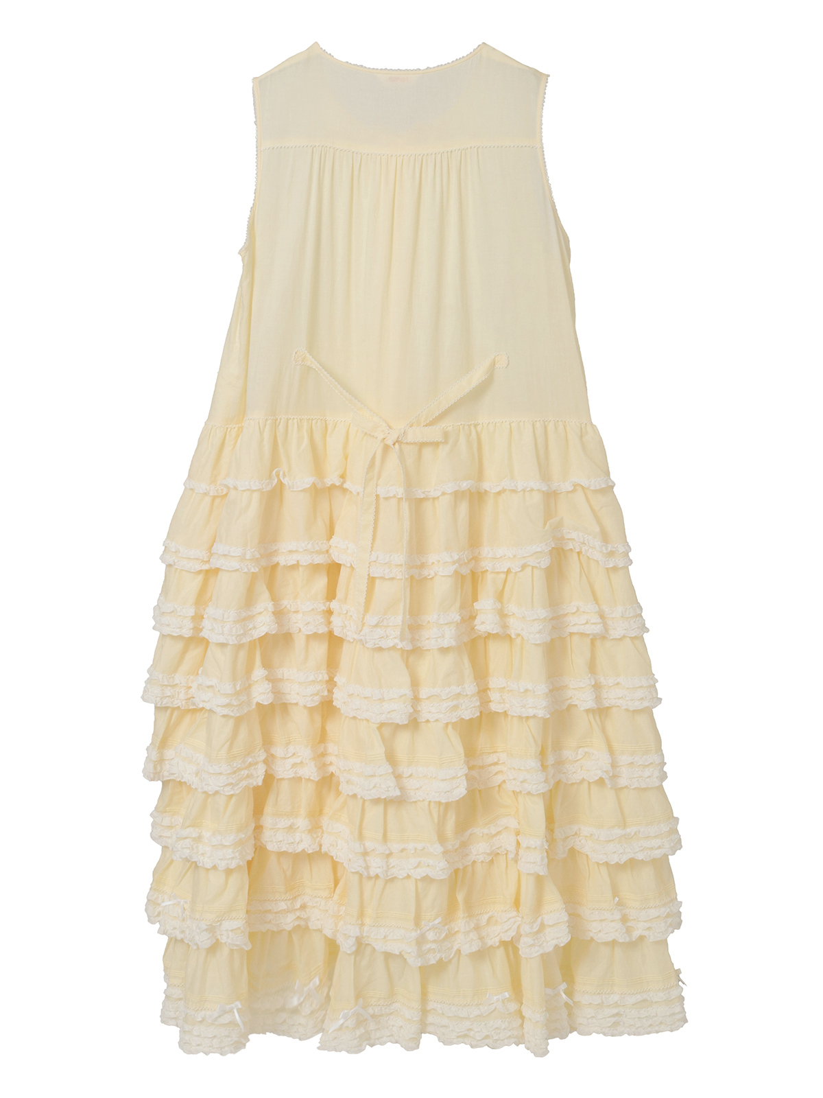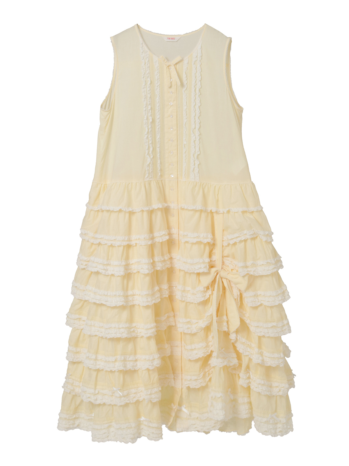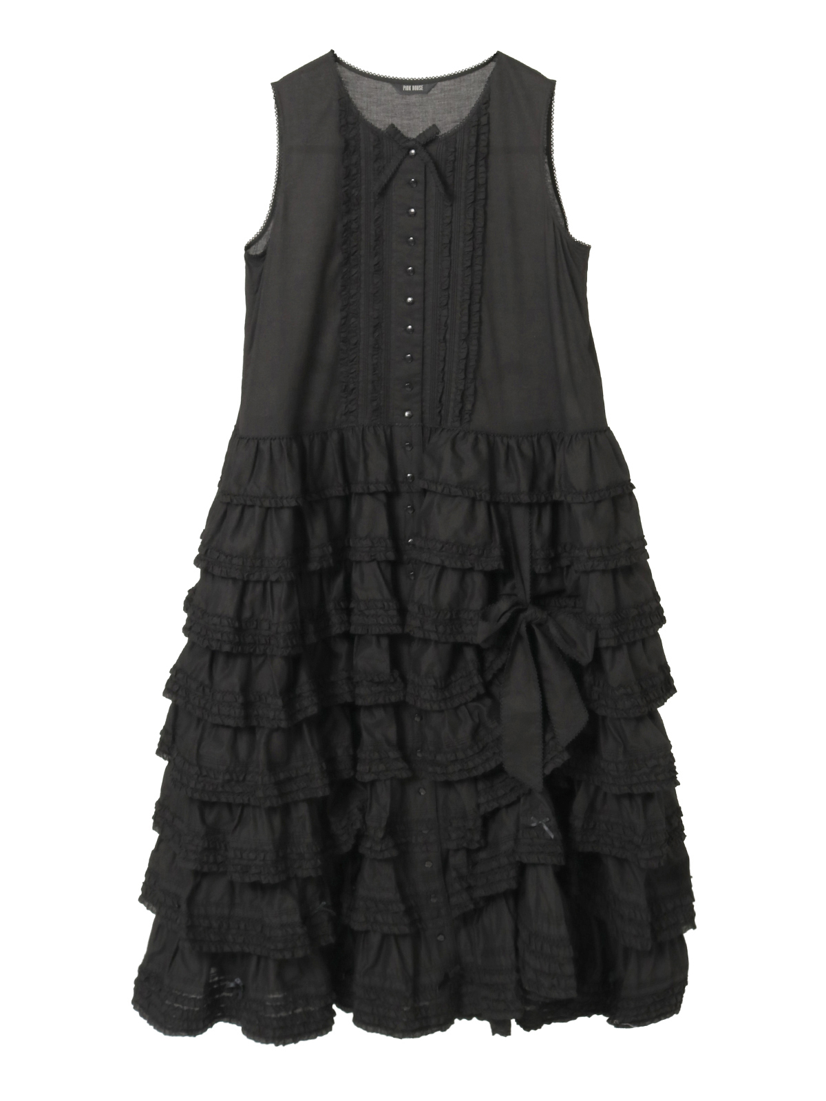 ウエストあたりから8段ものフリルを重ね合わせた華やかなノースリーブワンピース。それぞれ細やかな段々フリルの先にはタックとフリルで飾り立ててより華やかに。