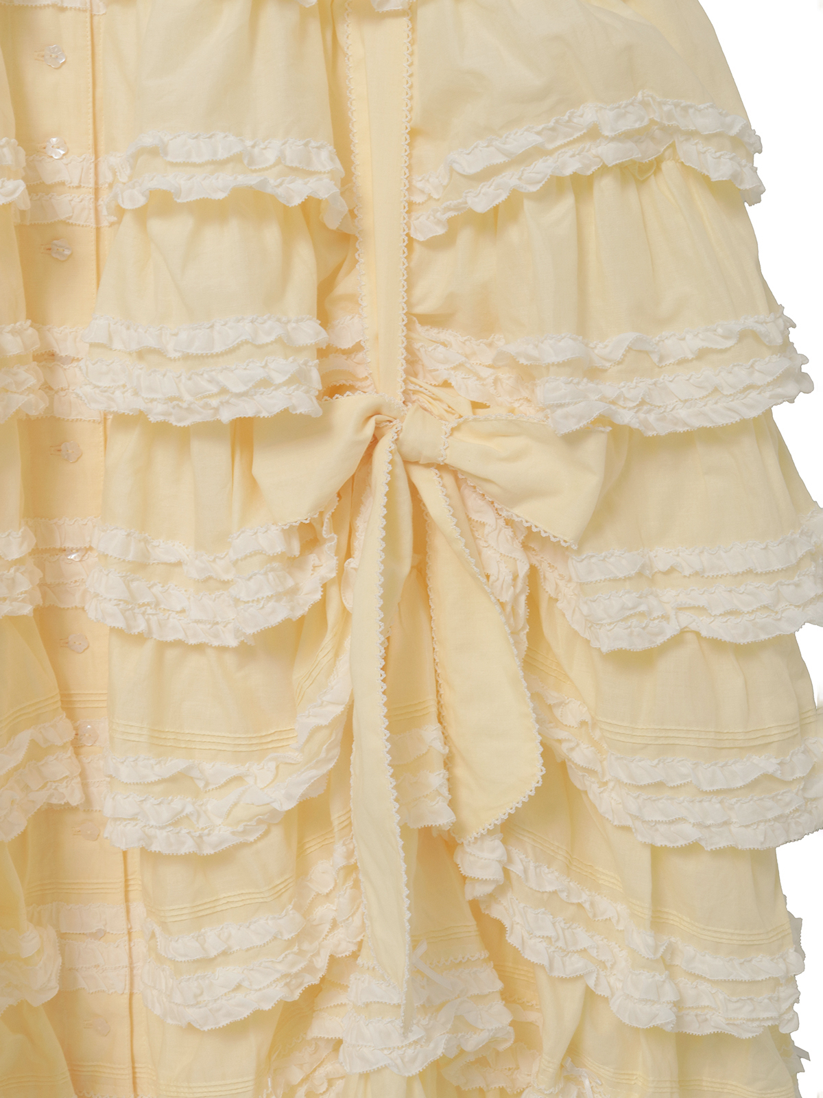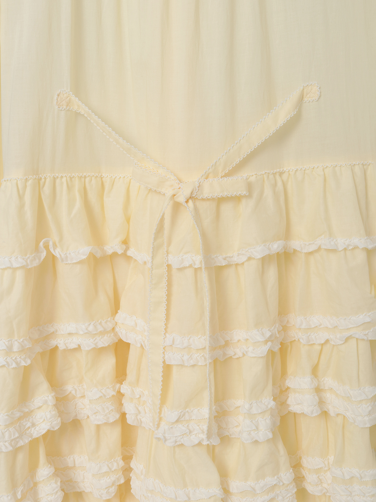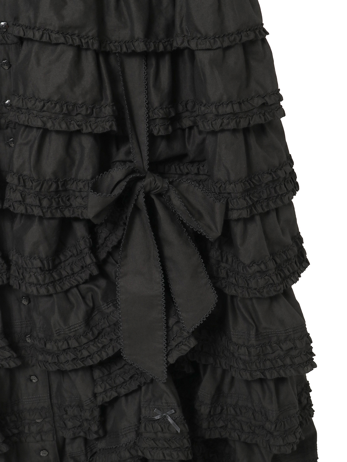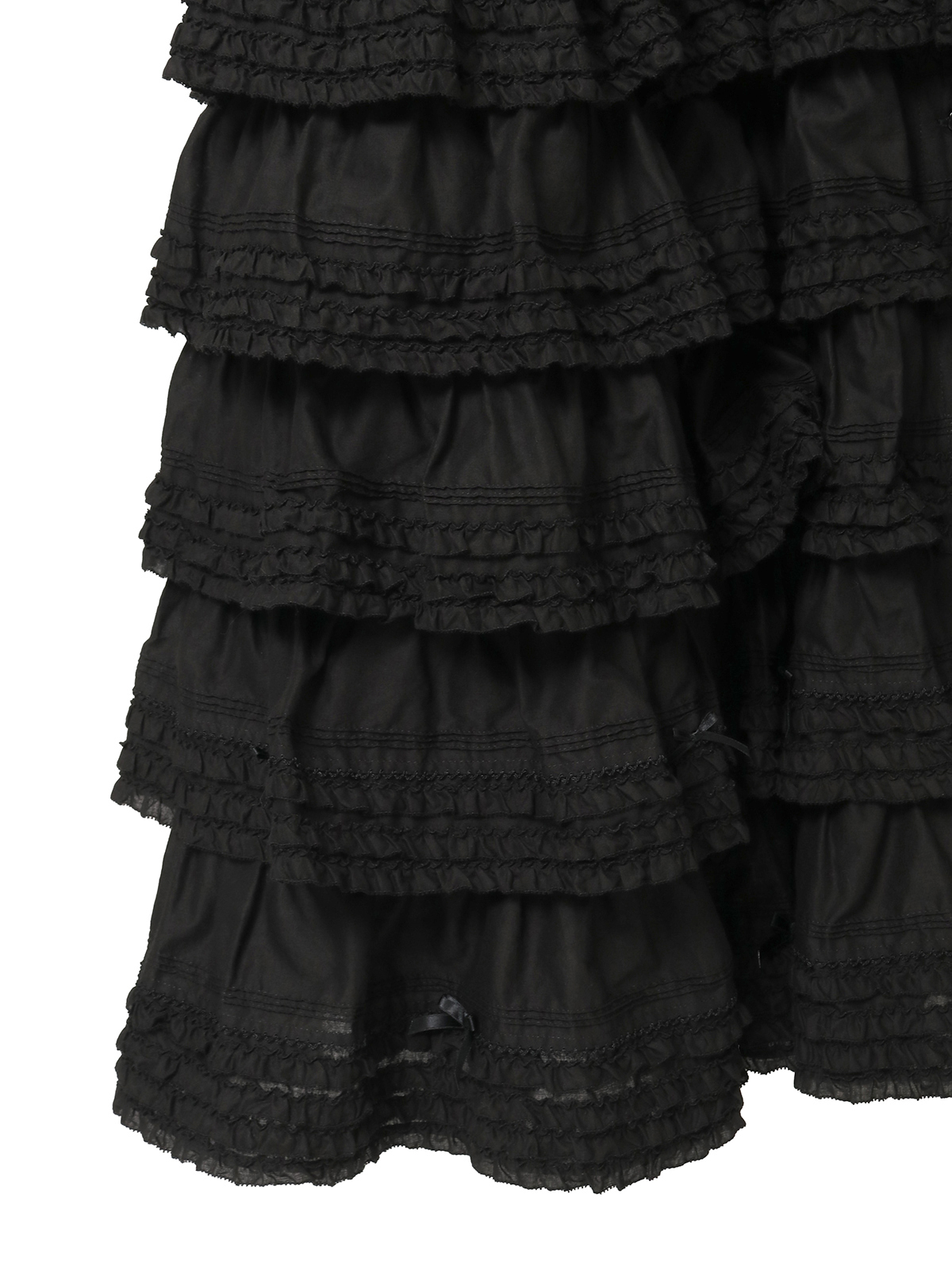 ウエストあたりから8段ものフリルを重ね合わせた華やかなノースリーブワンピース。それぞれ細やかな段々フリルの先にはタックとフリルで飾り立ててより華やかに。