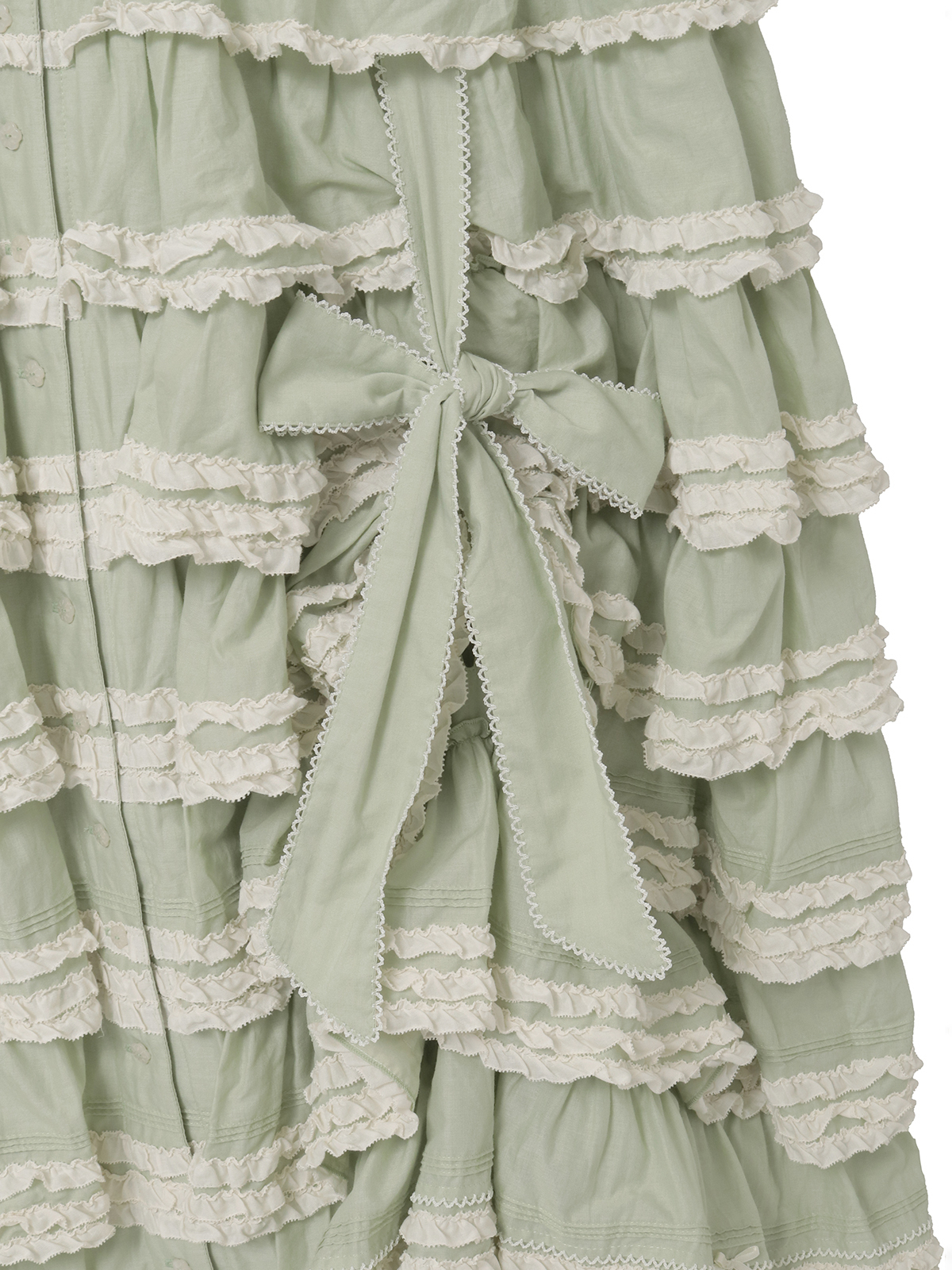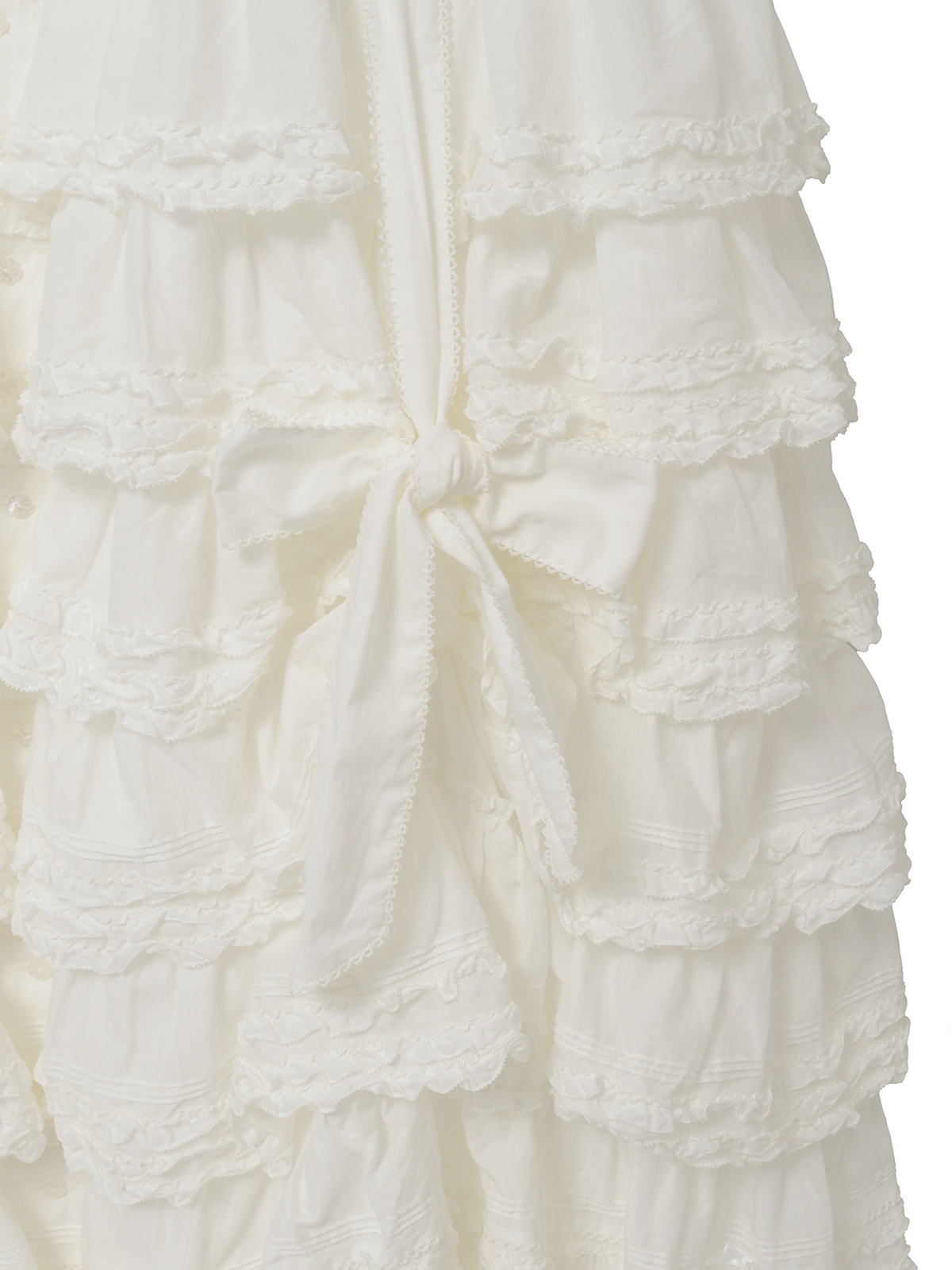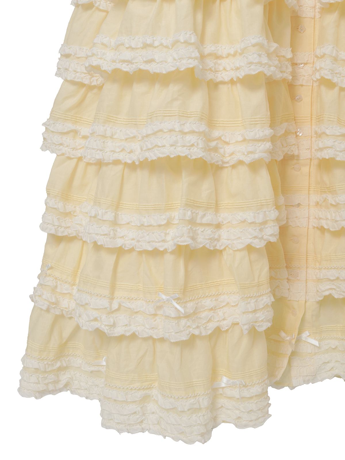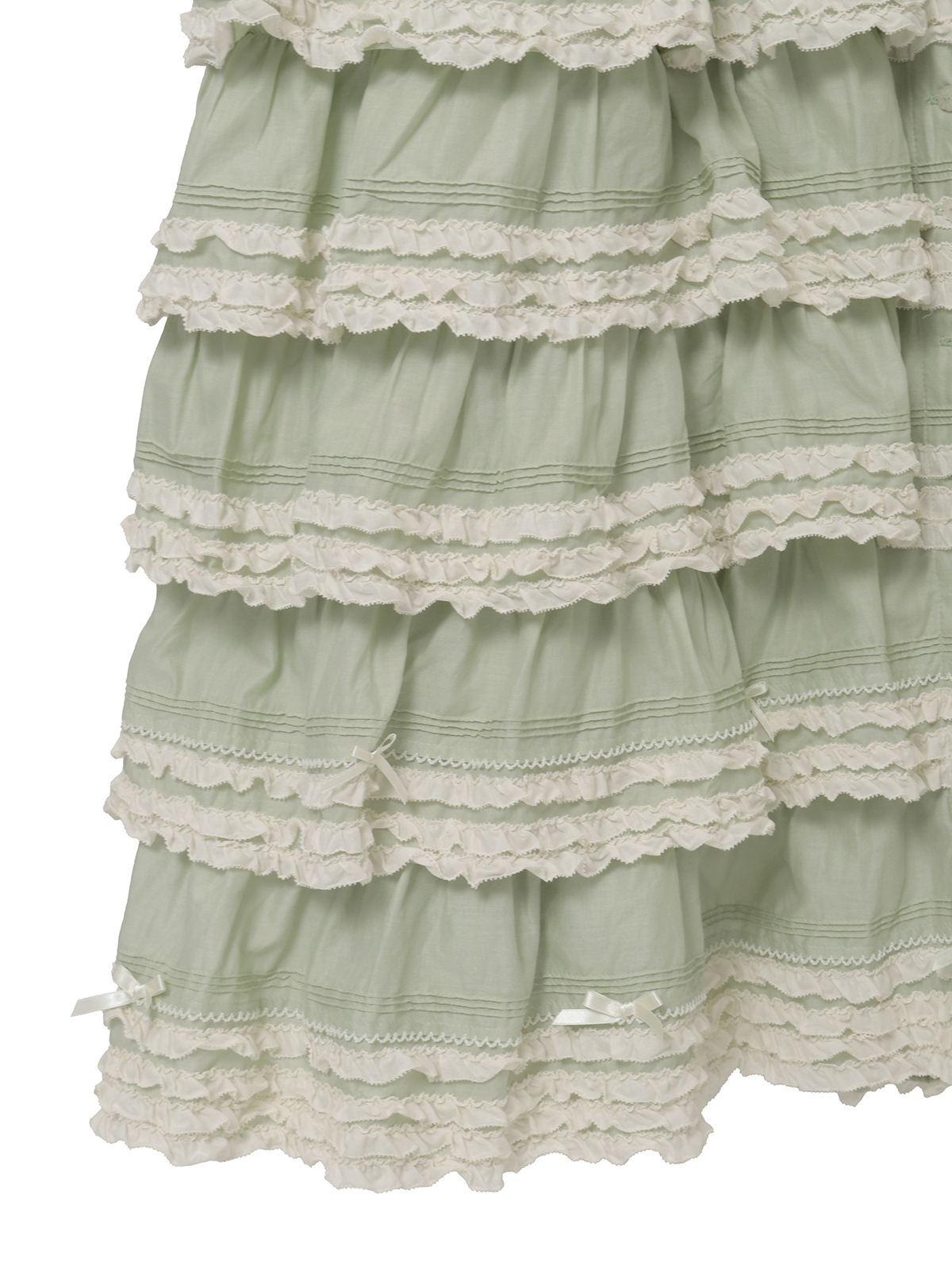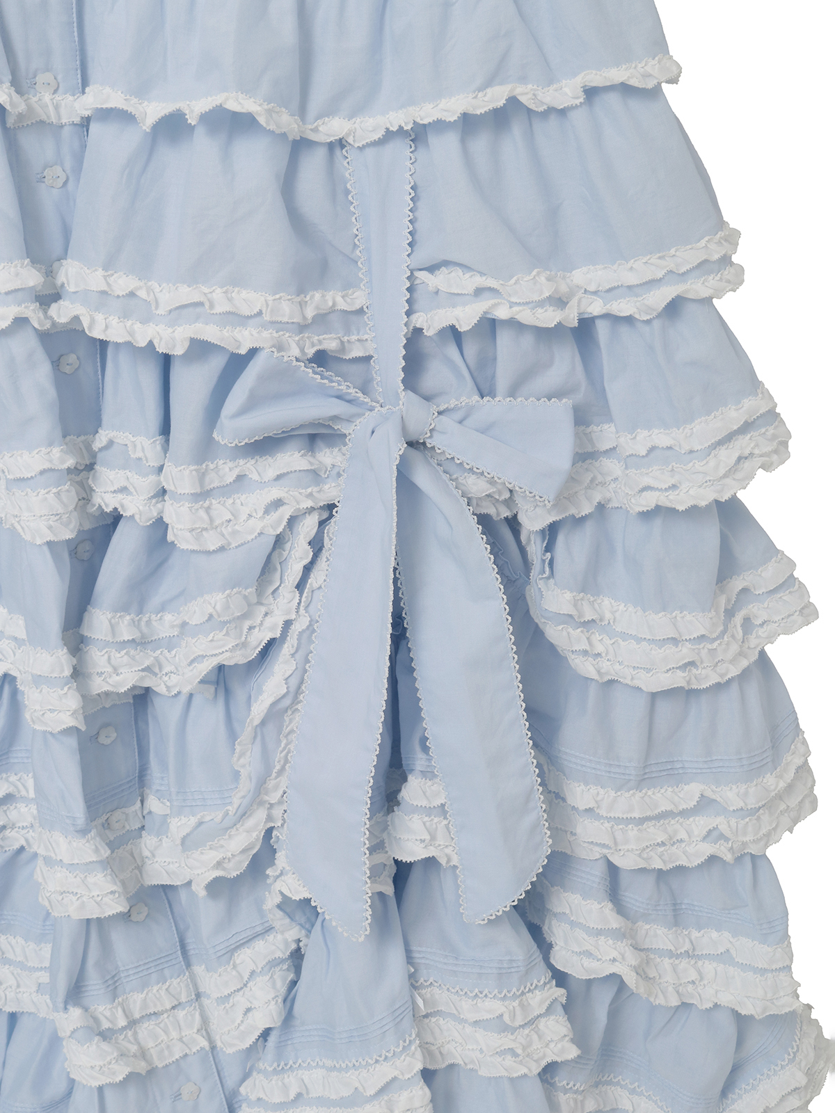 裾にかけてタックとフリルの数は段々に増えていきボリューム感たっぷりな仕上がりに。裾まわりに程近い段々フリルにはピコット刺繍も添えてそのまわりにミニサテンリボンを散りばめてアクセント使いにしています。
