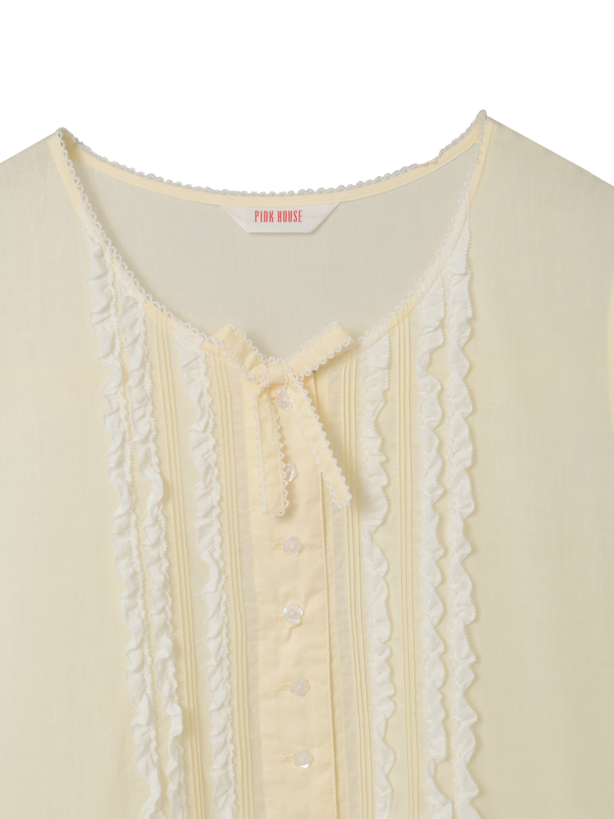 フロントまわりにもフリルとピンタックの装飾を施して可憐な装いに。
